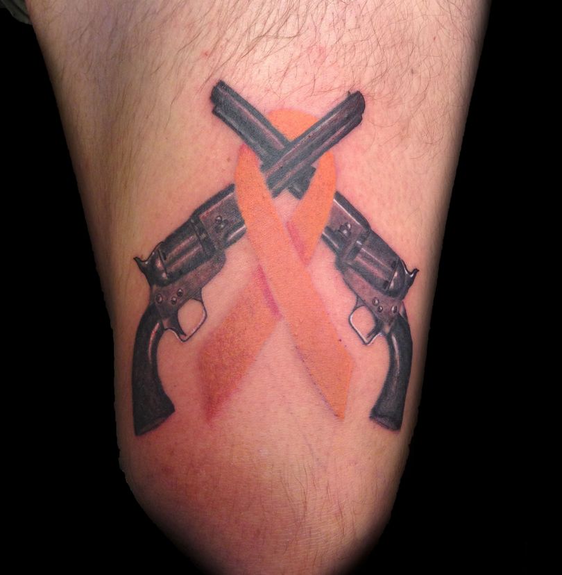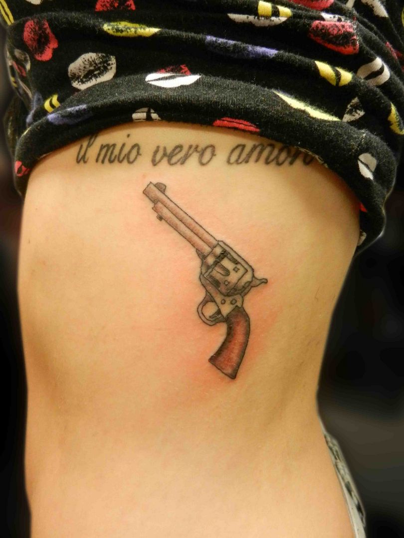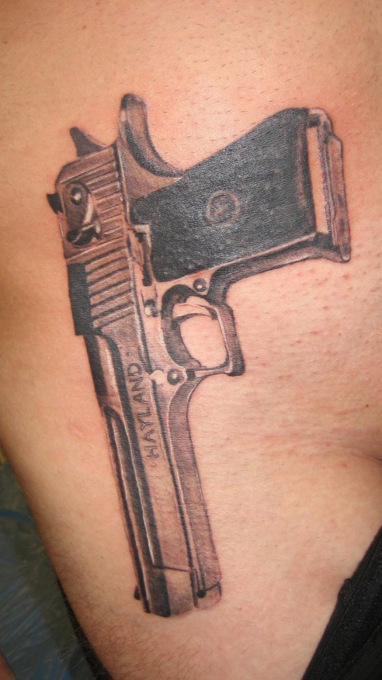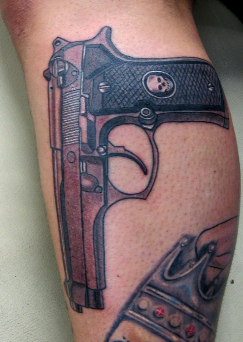 - L'autonomie. Le tatouage d'un pistolet évoque l'autosuffisance et l'autonomie de celui qui le porte. Parfois, une personne peut refuser l'aide nécessaire à son affirmation de soi. La personne réalise tout par elle-même.