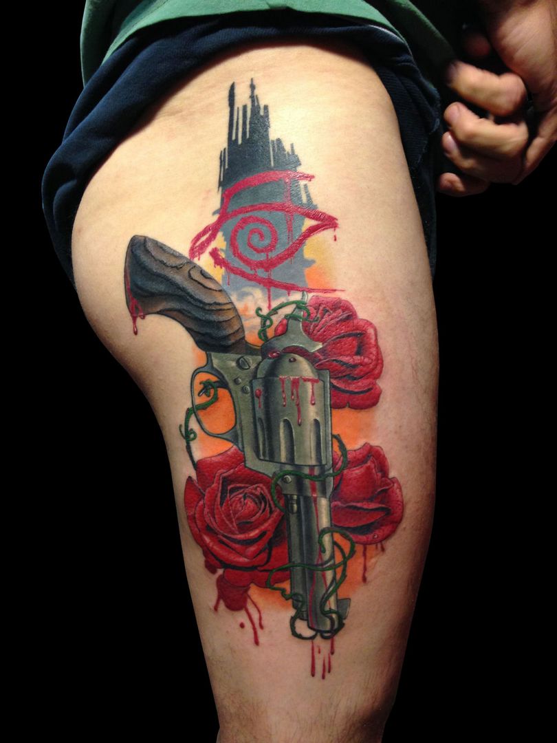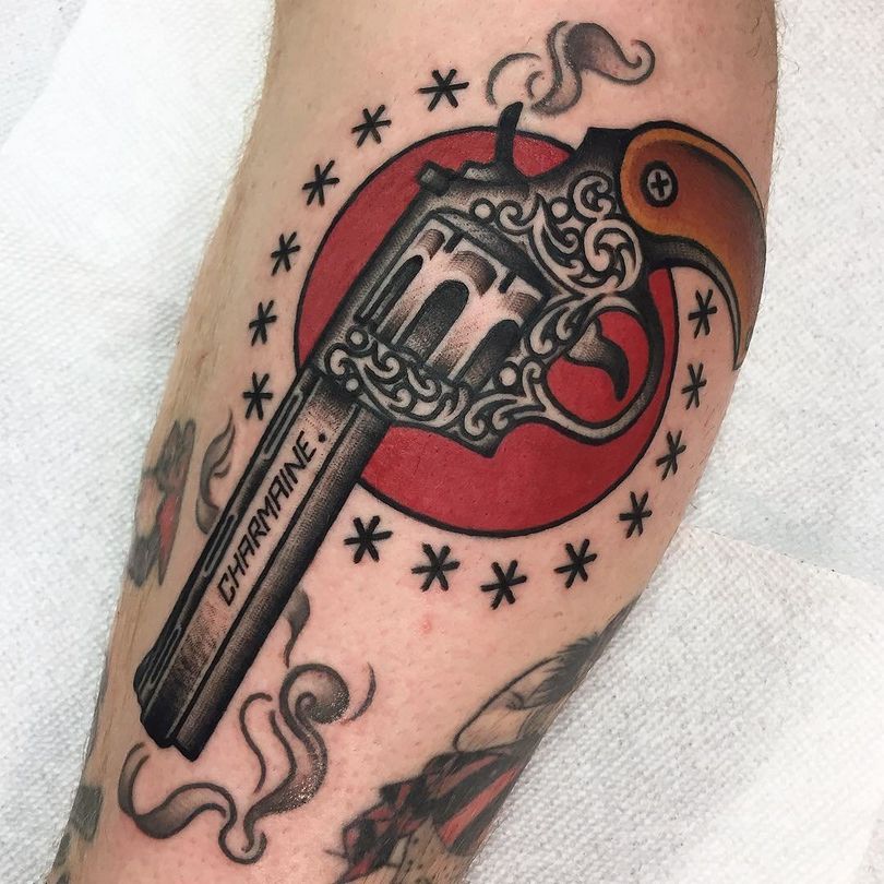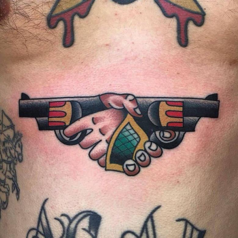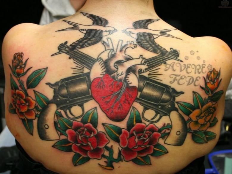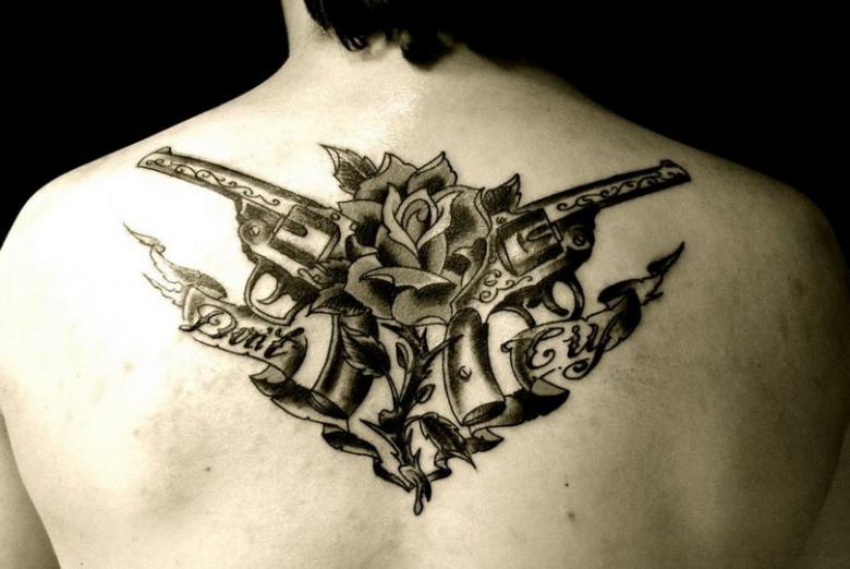Par exemple, un pistolet avec des roses. Le dessin pourrait signifier une vengeance pour l'adultère. Une arme dans un étui symbolise la retenue de la part du porteur, mais il ne faut pas non plus provoquer la personne. En même temps que l'arme est inscrite, la signification du tatouage changera en fonction de ce qui est écrit.