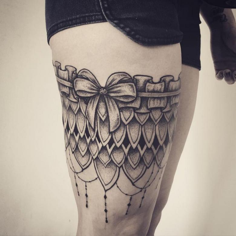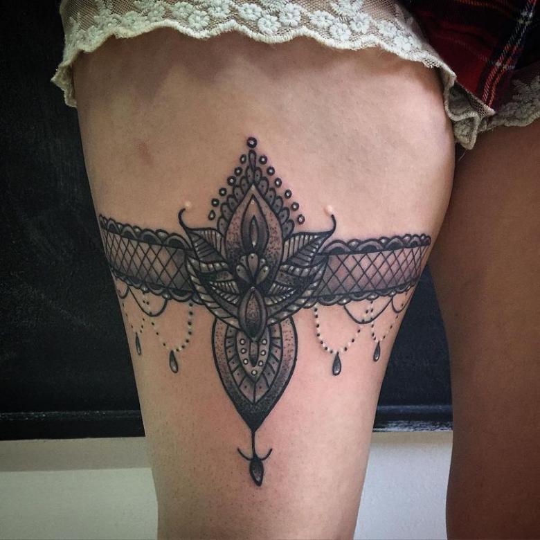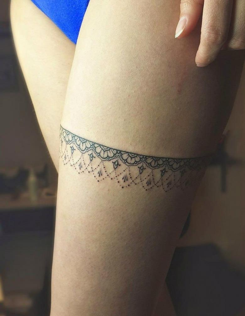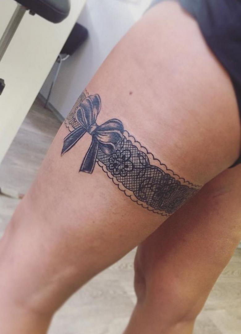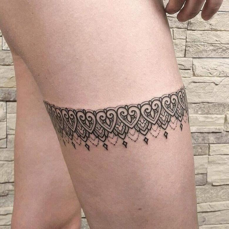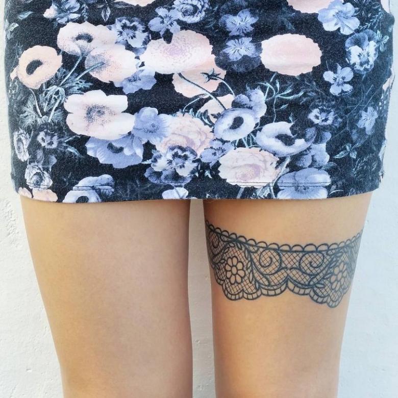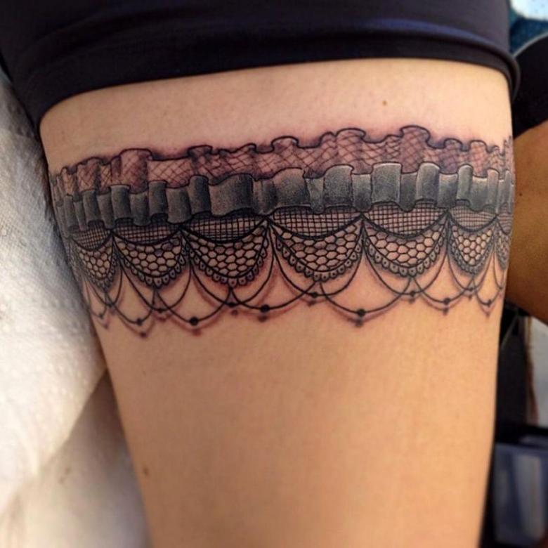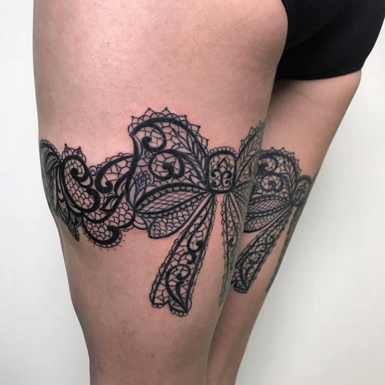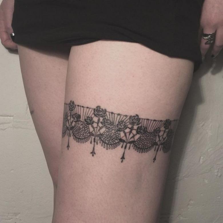 Souvent, les tatouages de jarretières sont réalisés sous la forme d'une dentelle ajourée et légère, imitant une belle matière aérée. Ces pièces étaient portées par des dames riches et raffinées, car plus la dentelle était fine, plus elle était chère. Il n'était pas tissé mais sculpté, ce qui exigeait une grande précision et une grande habileté.
