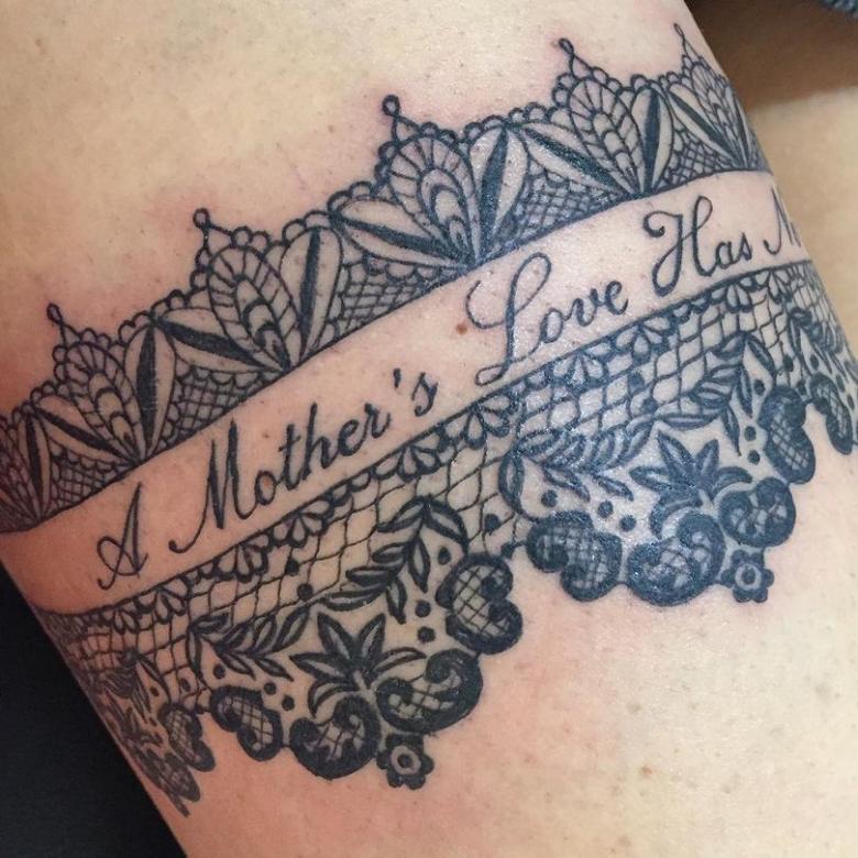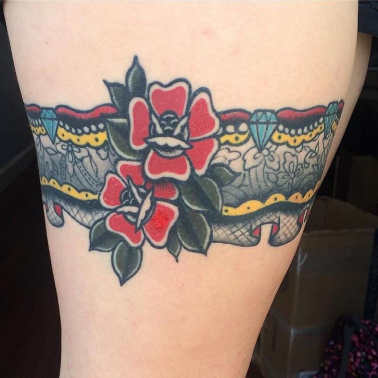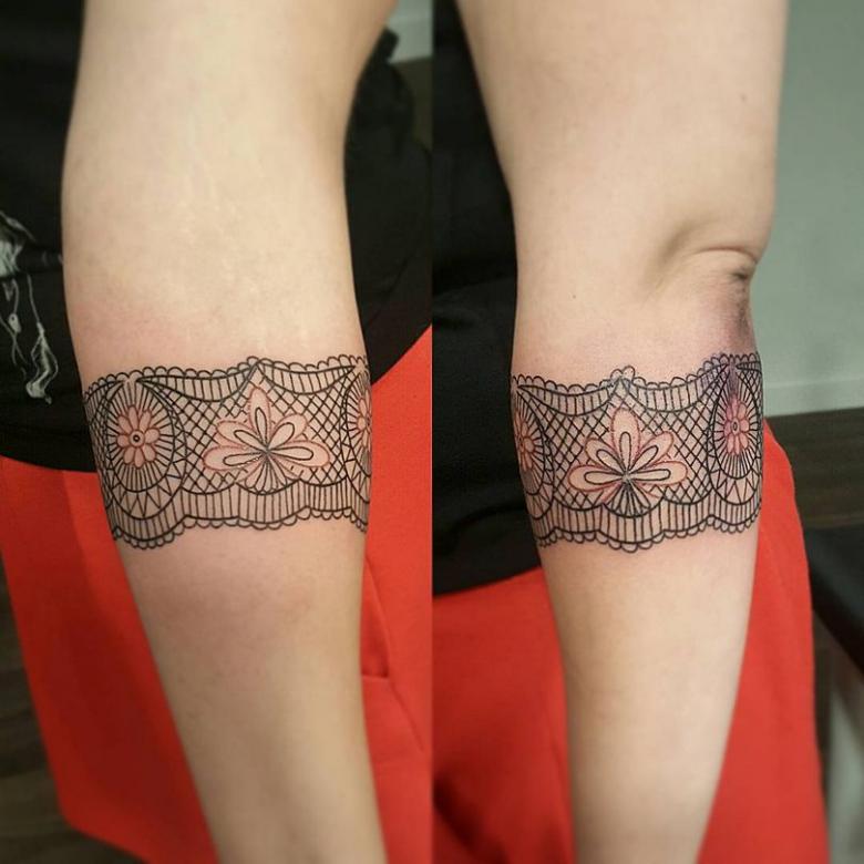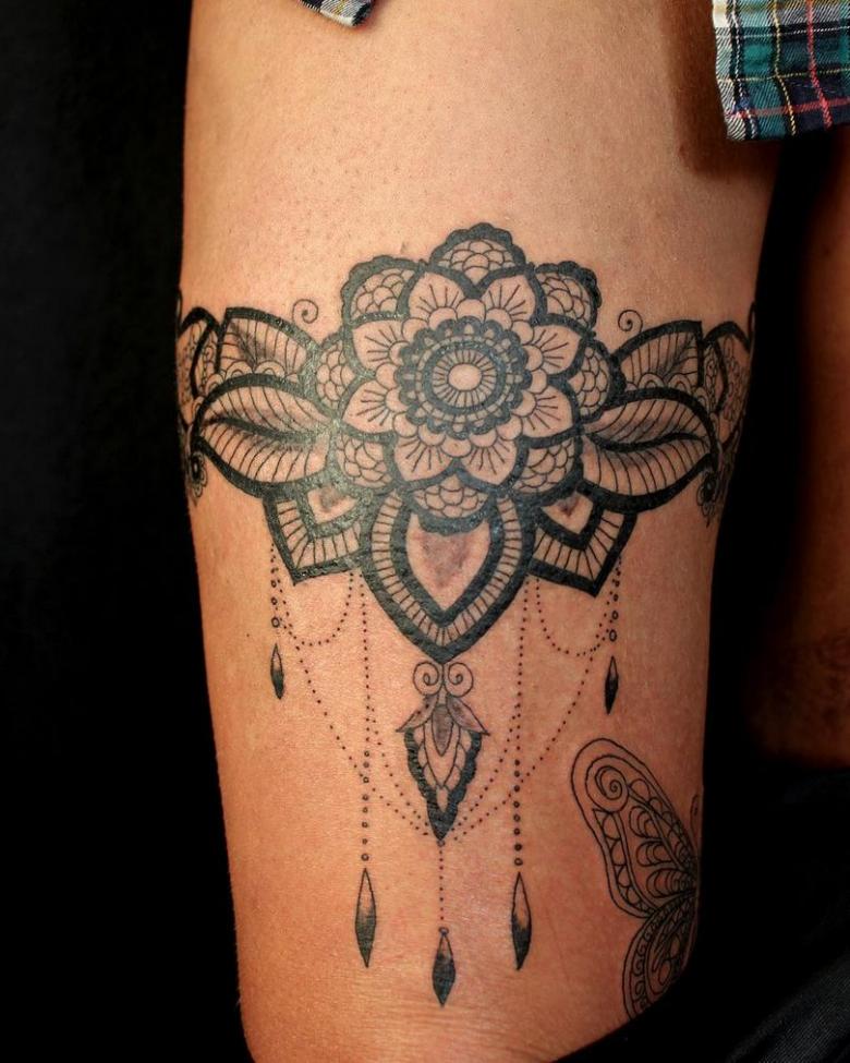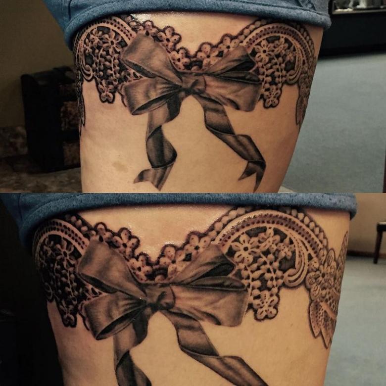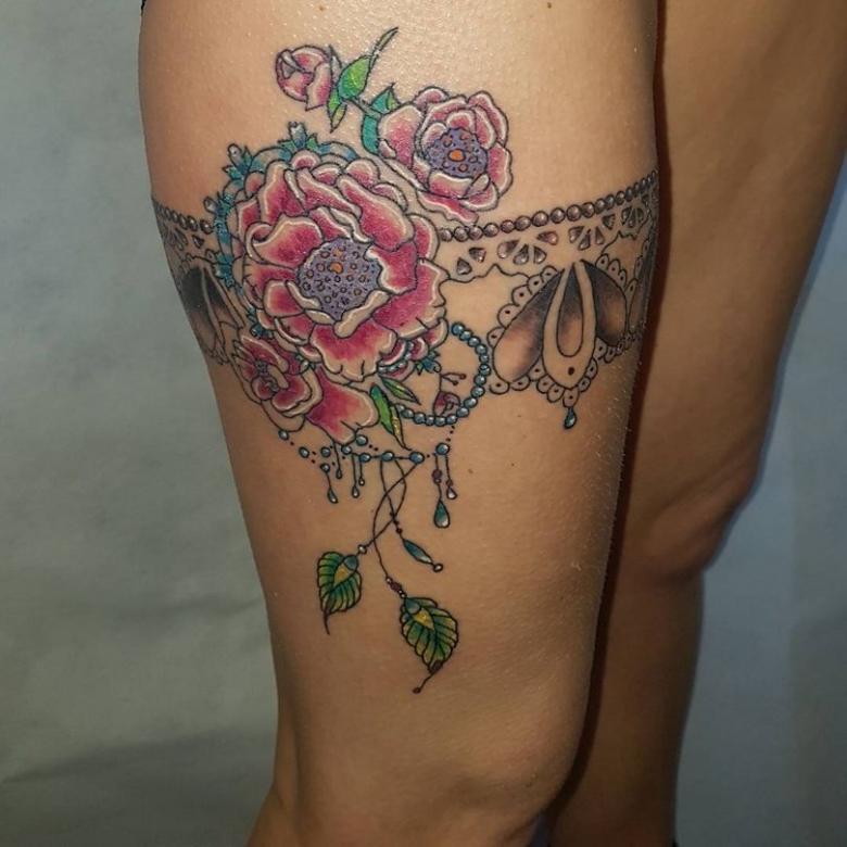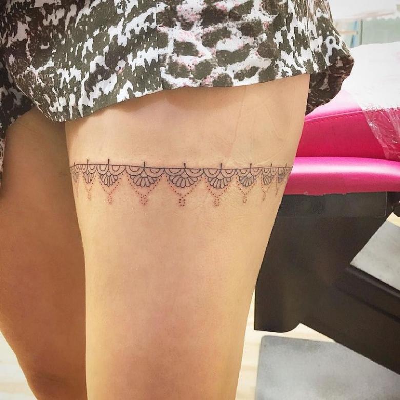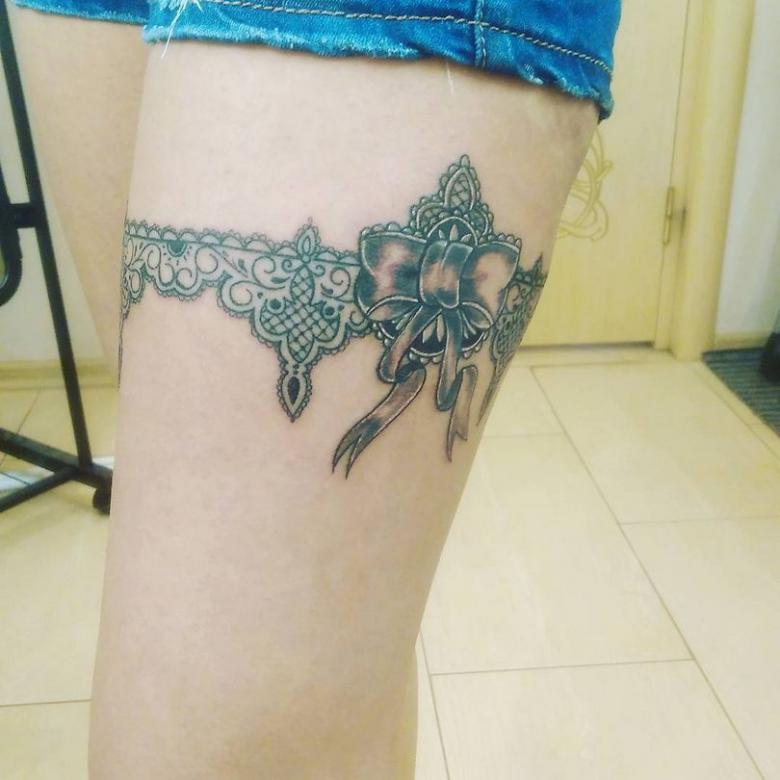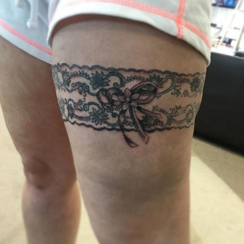 Souvent, les tatouages de jarretières sont réalisés sous la forme d'une dentelle ajourée et légère, imitant une belle matière aérée. Ces pièces étaient portées par des dames riches et raffinées, car plus la dentelle était fine, plus elle était chère. Il n'était pas tissé mais sculpté, ce qui exigeait une grande précision et une grande habileté.