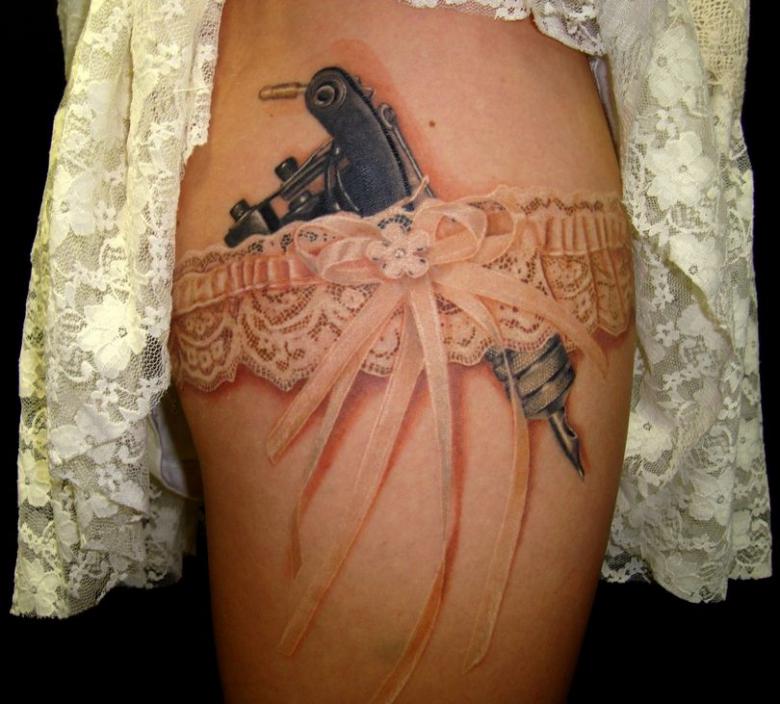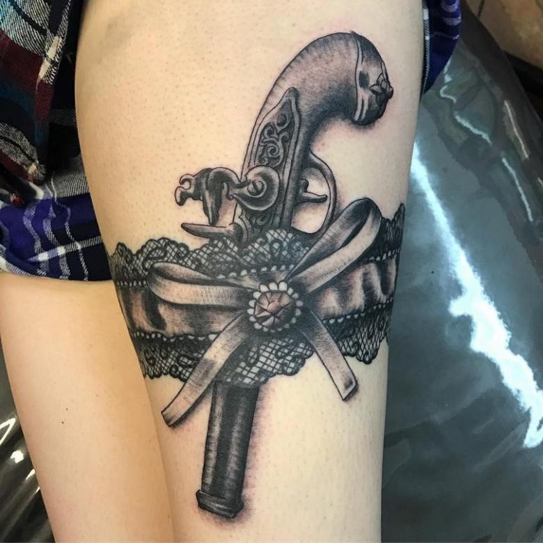 Les motifs risqués, voire criminels, contrastent avec la peau délicate de la femme et renforcent encore l'effet d'un beau tatouage de jarretière. Il peut s'agir d'armes à feu sous la dent, de couteaux, de cartouches, de crânes et d'os.