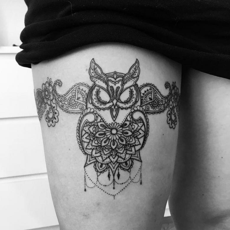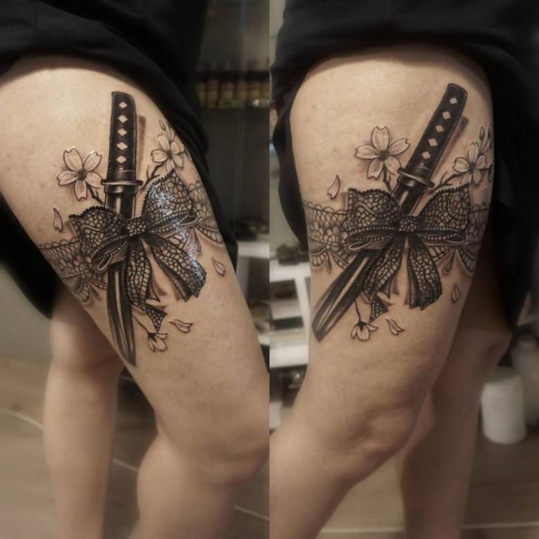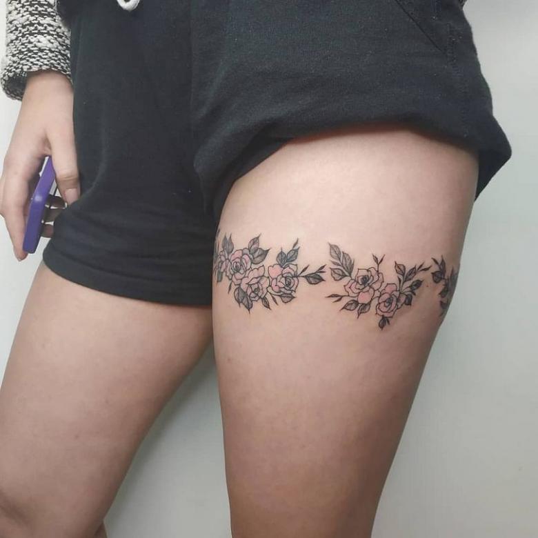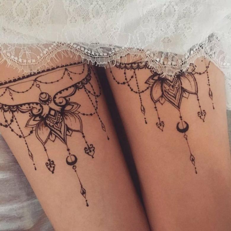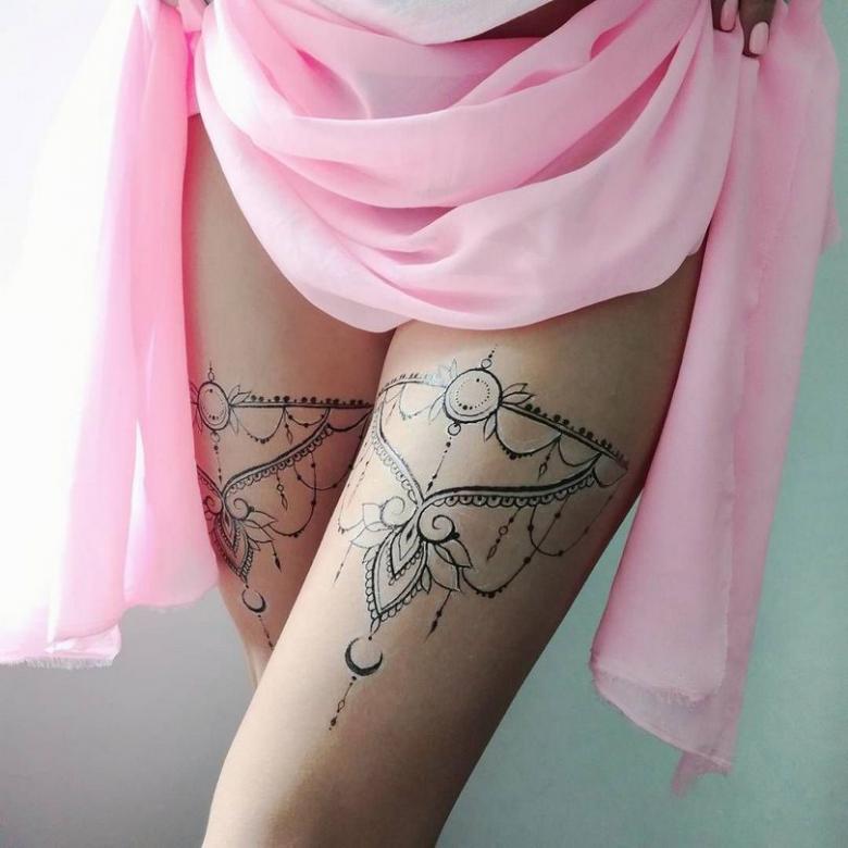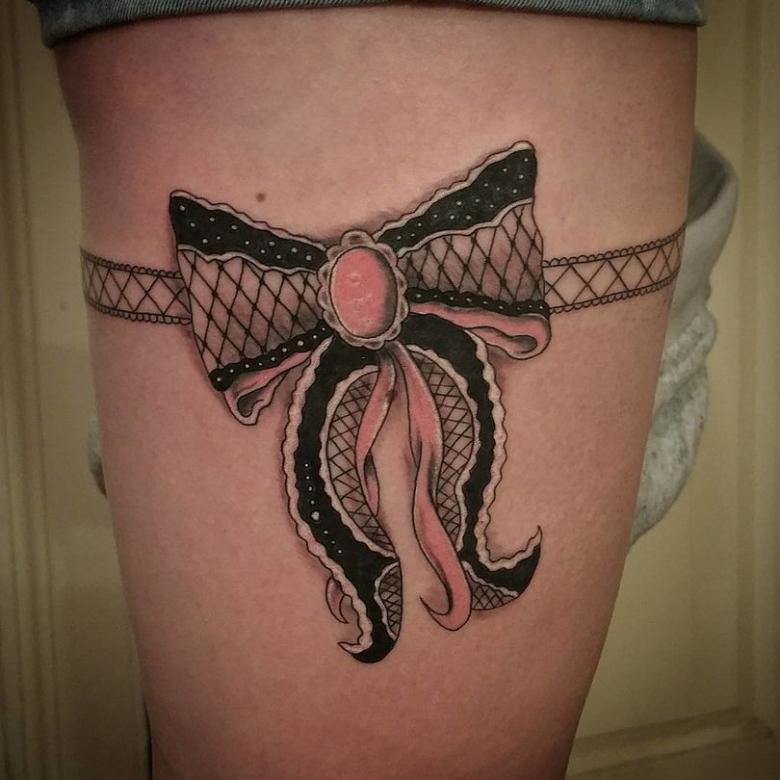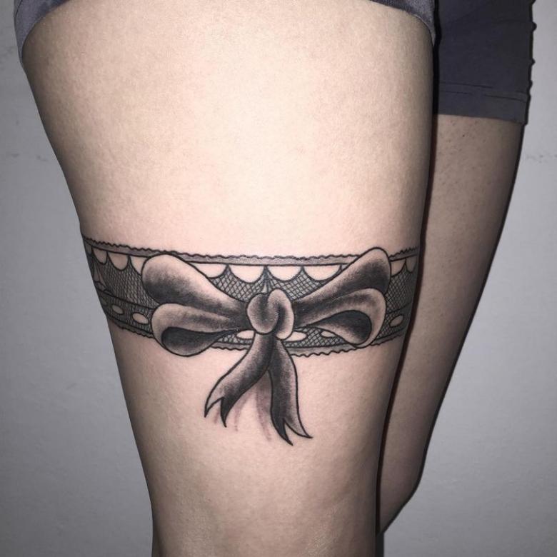 La popularité de la jarretière demeure cependant, mais son rôle est plus décoratif. Ils sont utilisés pour décorer l'endroit où les bas sont fixés sur la ceinture. Et souvent, il s'agit d'un fétiche, d'un élément de jeu érotique. Et si une fille se fait tatouer des jarretières, elle veut clairement attirer les hommes par une image spéciale, qui reste toujours sur la peau.