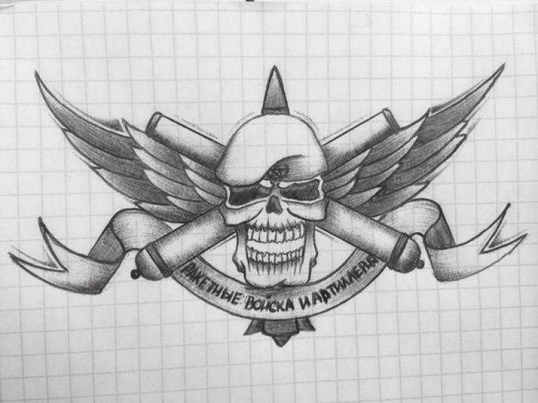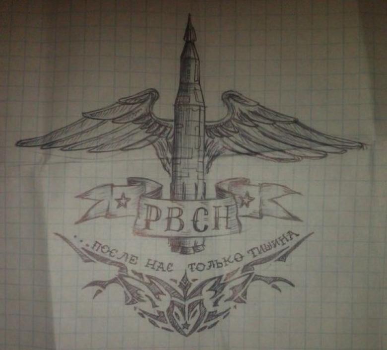 Les forces de roquettes stratégiques sont directement subordonnées à l'état-major général des forces armées russes. Il s'agit de l'une des plus jeunes branches de l'armée russe, qui a été créée en URSS en 1959 après que l'armée soviétique ait été dotée d'armes nucléaires stratégiques.La base de nombreux croquis de ces tatouages de l'armée est l'armement des forces de missiles stratégiques, qui montre le symbole d'État du blason de la Russie moderne - l'aigle bicéphale, serrant dans ses pattes deux flèches et une épée. Contre un tel signe officiel des Forces de fusées stratégiques est souvent représenté le missile avec un certain nombre d'éléments décoratifs sous la forme de :