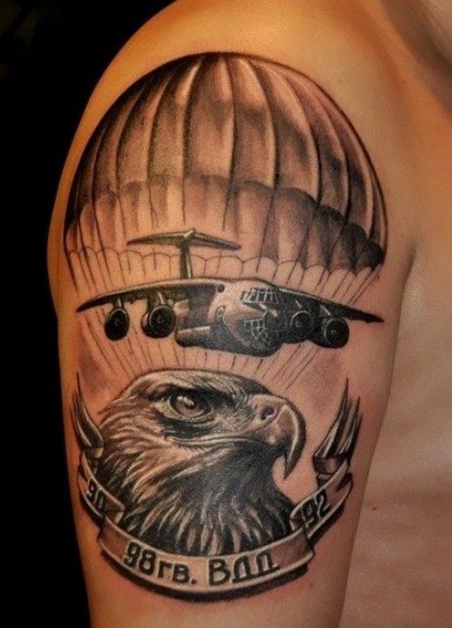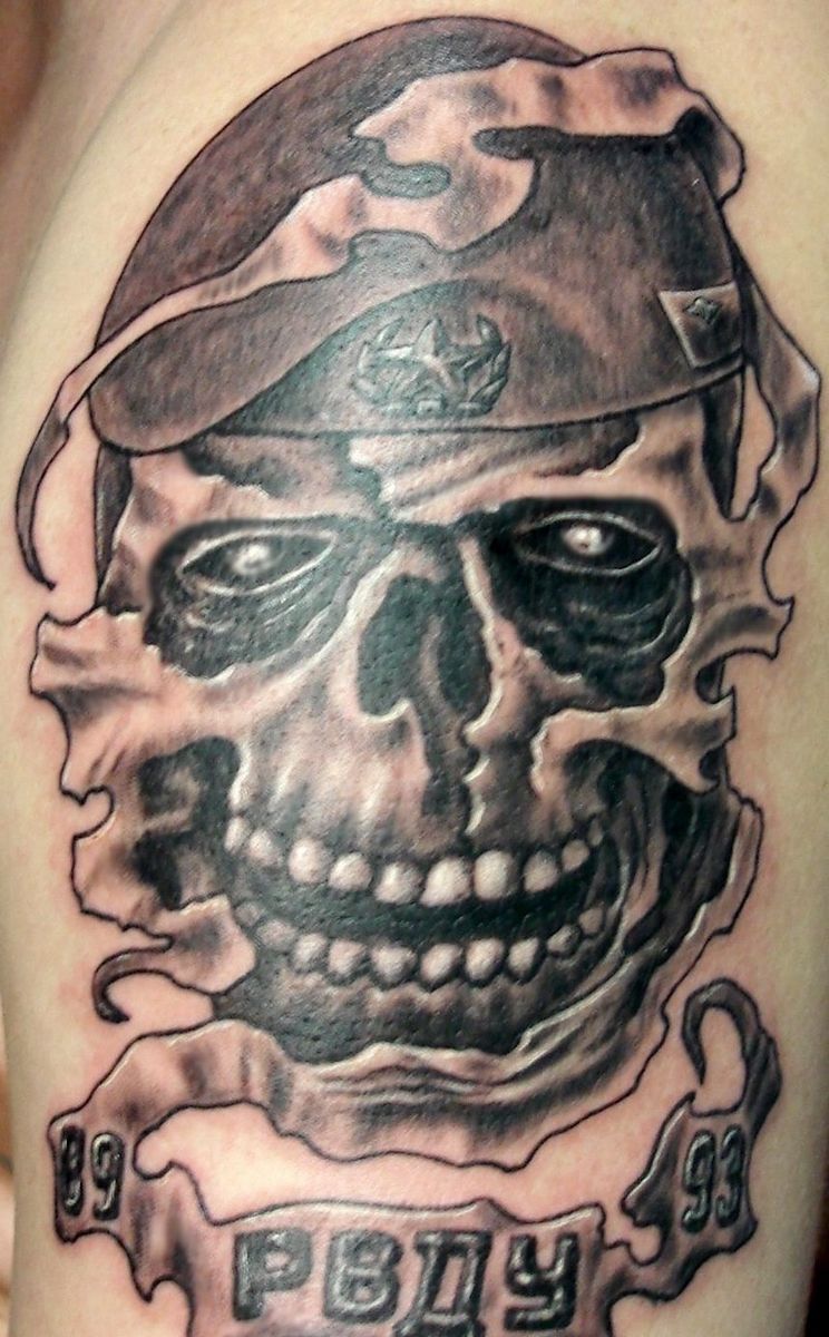 Le maître sera en mesure de créer un design individuel d'un tel tatouage militaire à partir d'un croquis prêt à l'emploi tiré d'un catalogue, en incorporant des éléments distinctifs individuels qui racontent le service du tatoueur aux initiés.