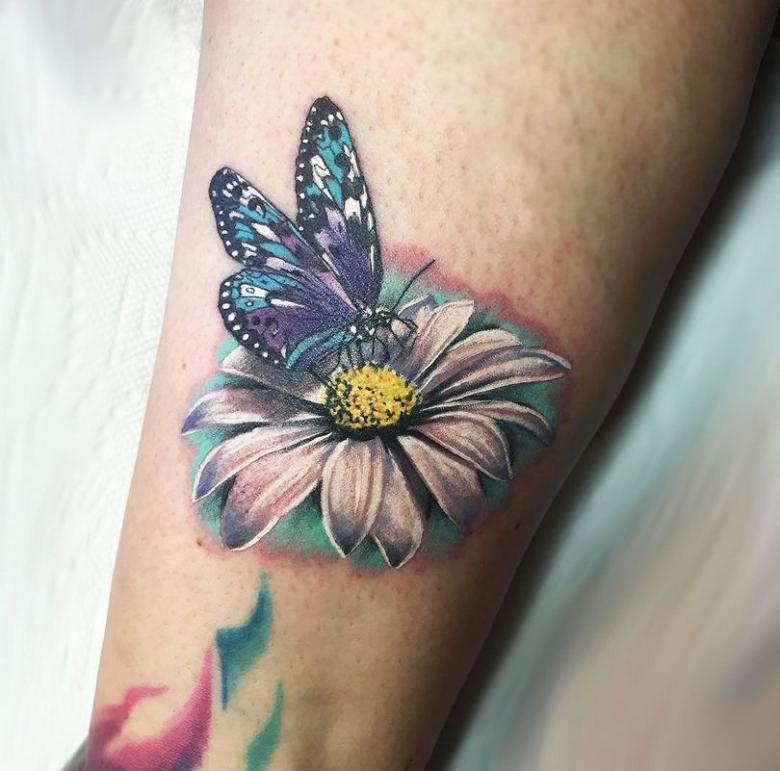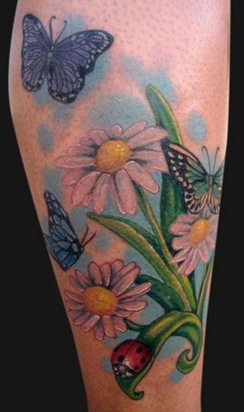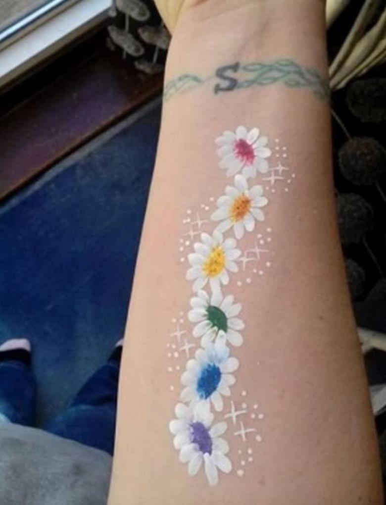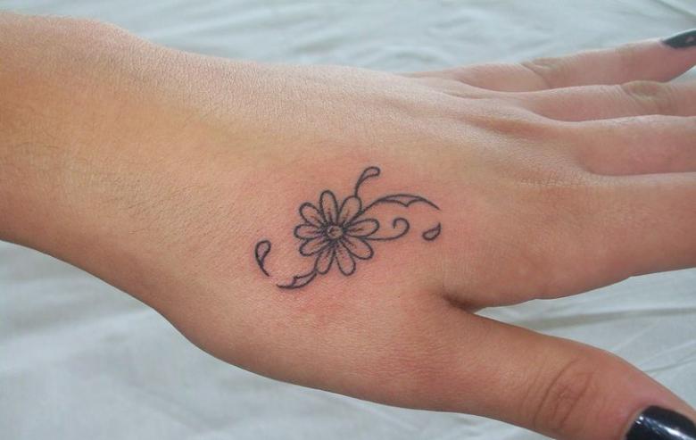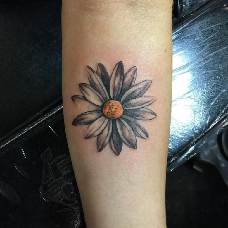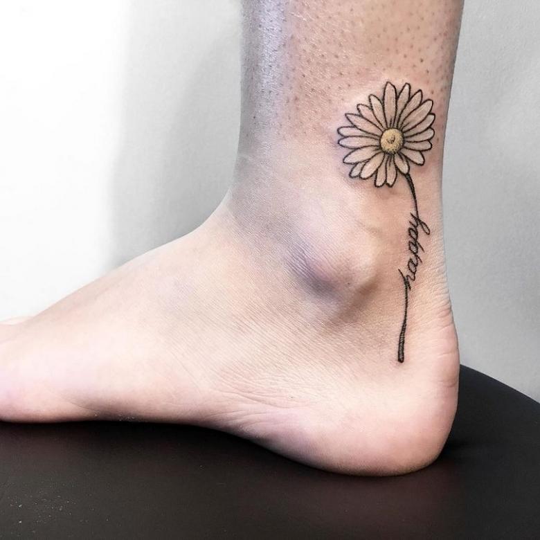 La fleur peut être complétée par divers détails - motifs, feuilles, ornements, symbole Yin-Yang, papillons, visages amusants, smiley. Les tatouages en forme de petites marguerites sont un thème très populaire. C'est une décoration féminine charmante et mignonne qui ne comporte pratiquement aucune négativité.