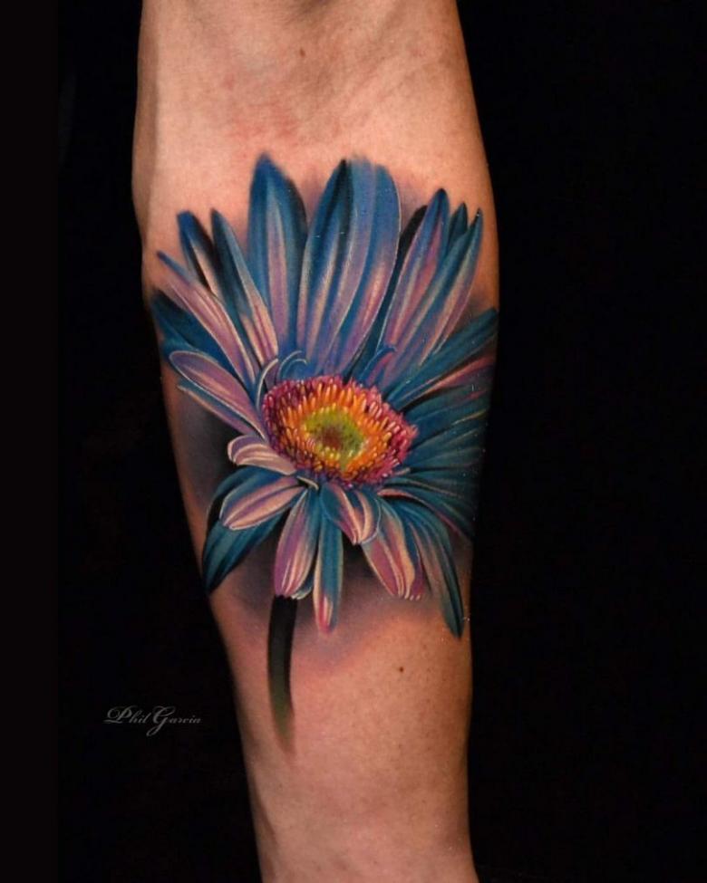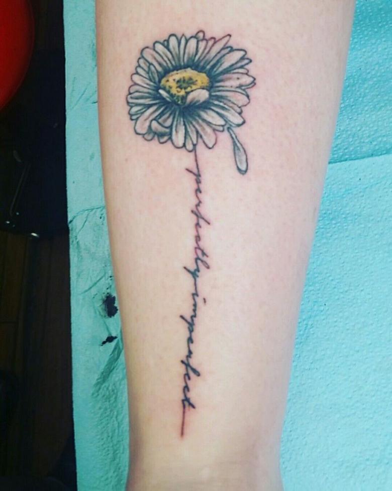Tatouage de marguerites au look intéressant sur le côté comme une ligne, au-dessus du genou, sur l'omoplate, sous la poitrine. Les personnes au goût original commandent un tatouage le long de la colonne vertébrale ou près du gros orteil. L'image la plus frappante se trouve sur l'épaule ou le bras, ce qui est une solution classique. Vous pouvez mettre un tatouage de marguerite sur votre avant-bras, avec une transition vers le coude ou la poitrine.