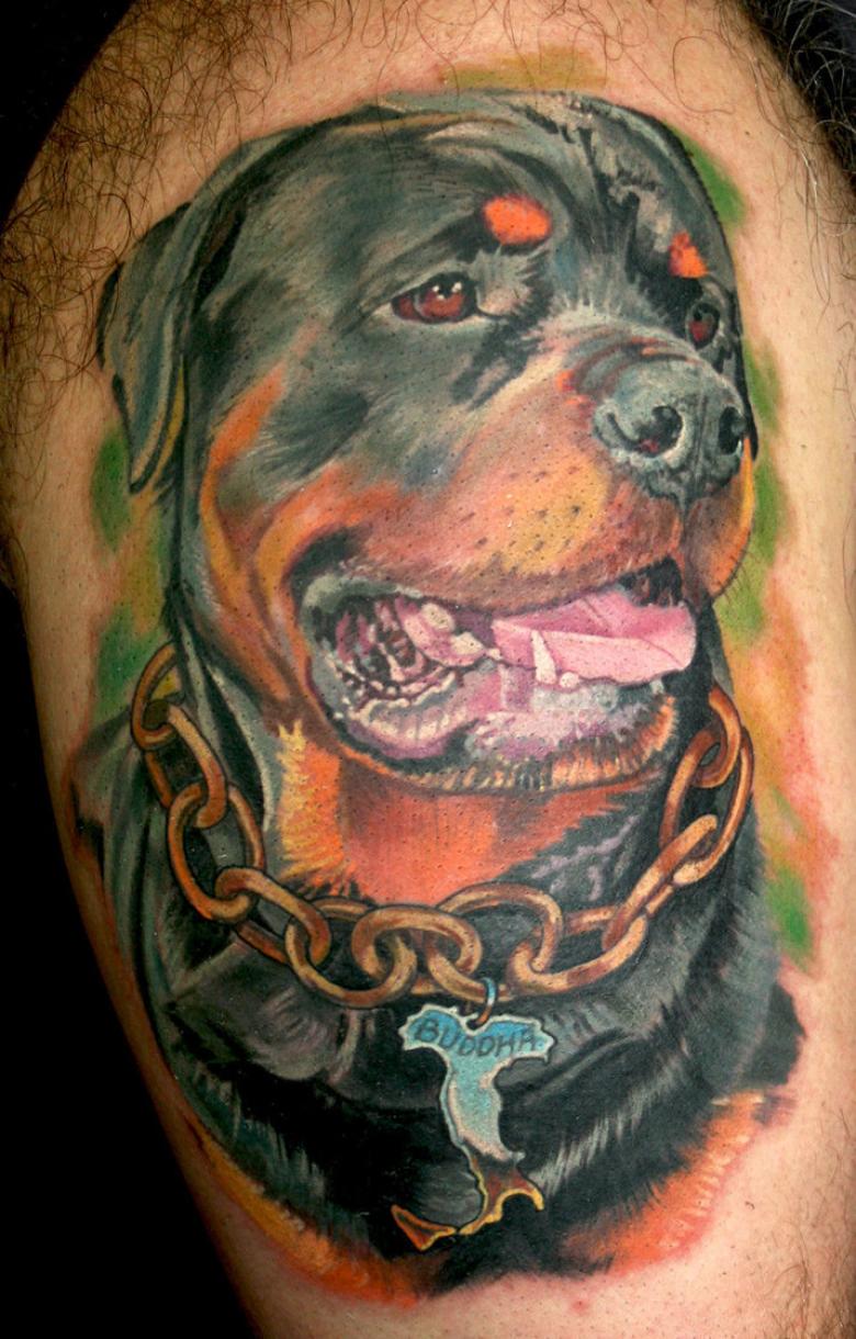 Le Rottweiler peut également être représenté avec une . collier, chaînes, étiquettes ou corde. Les croquis de chiens sont le plus souvent réalisés dans des couleurs sombres, en utilisant le noir et le rouge. Pour certaines personnes, le rêve d'avoir un animal domestique à la maison ne peut se réaliser que sur leur corps. Si une personne rêve d'un Rottweiler depuis longtemps, un tatouage représentant son ami à quatre pattes préféré sera vraiment spécial pour elle.