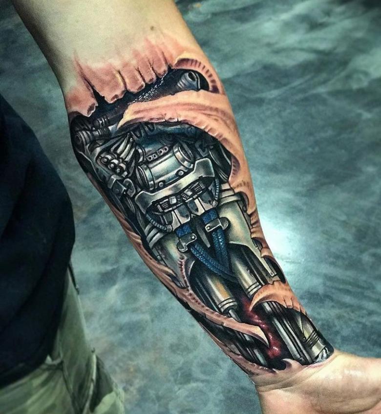 Le dessin représente le mécanisme de manière très détaillée. Les charnières, les ressorts, les engrenages, les vis - tout cela se retrouve sur ce tatouage, dont les couleurs peuvent être différentes.
