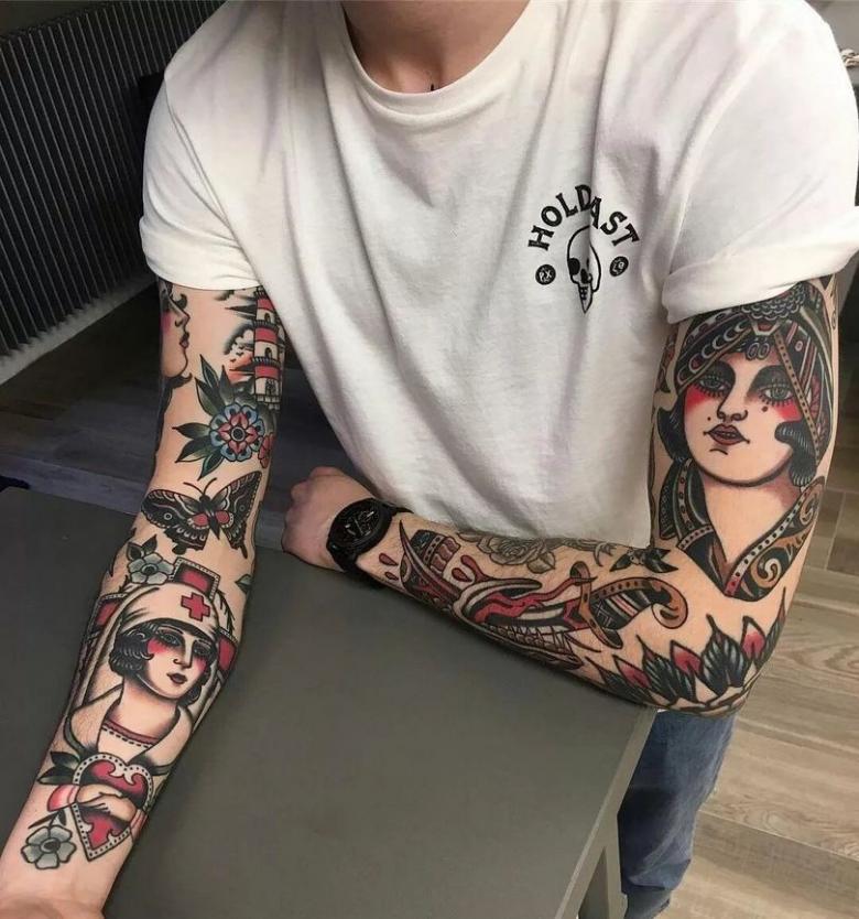 Le tatouage "manche" se retrouve aussi bien chez les femmes que chez les hommes, mais chez ces derniers, il se distingue par un contenu particulier, un mode de coloration et la structure globale de l'œuvre.