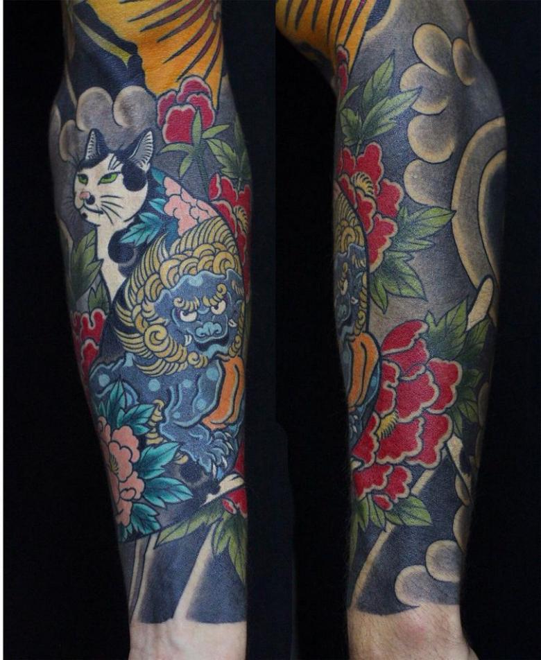 Dans les œuvres colorées, les couleurs vives sont atténuées. Cela est nécessaire pour une plus grande polyvalence du tatouage, afin qu'il puisse être assorti à différents styles de vêtements. Tout doit être à la mode, brutal et solide.