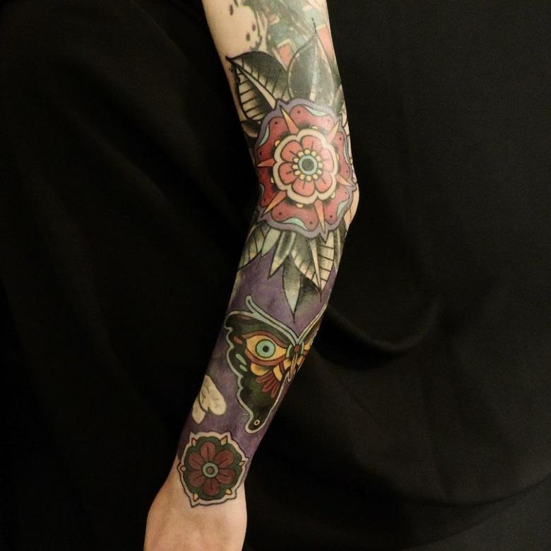 Dans d'autres variantes, le tatouage est réalisé dans le même schéma de couleurs mais avec des techniques différentes. Supposons qu'il y ait une pièce de style ornemental en haut et une pièce de style réaliste en bas.