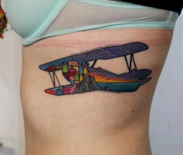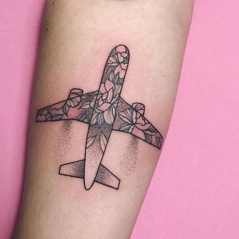 Le tatouage de l'avion lui-même se présente, en règle générale, de manière schématique - seulement une ébauche. Les filles choisissent des croquis modernes de l'avion, peints sous une feuille d'un cahier. Le tatouage semble frais et non conventionnel.