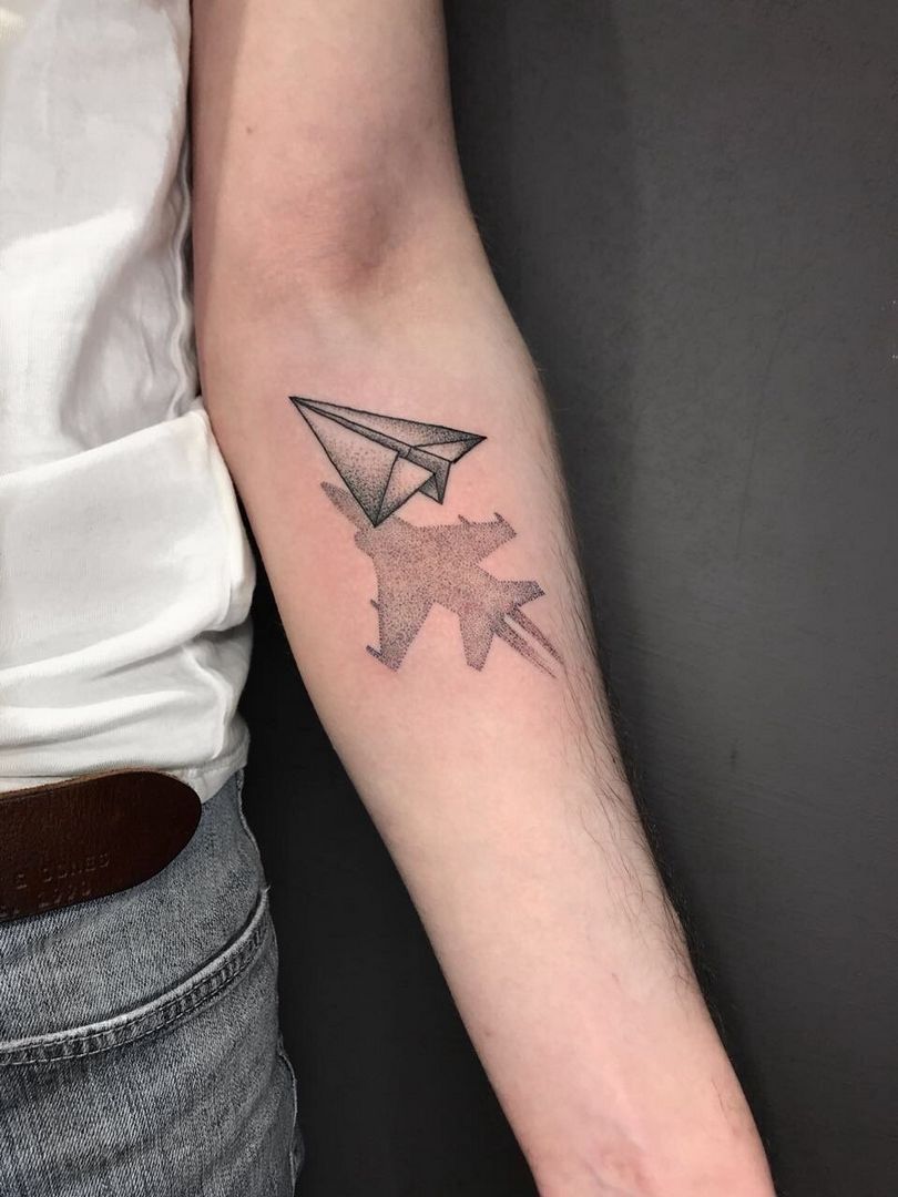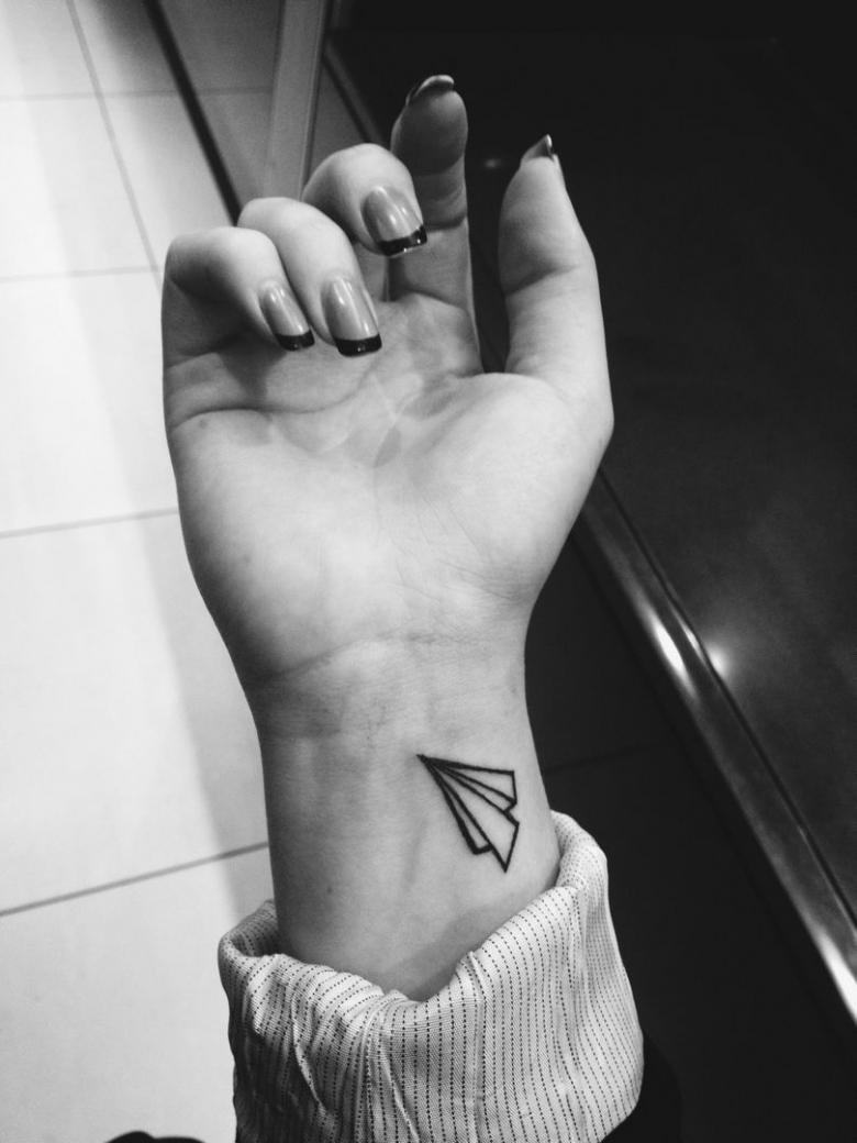 L'avion en papier symbolise l'atteinte d'un objectif, le rêve associé à la légèreté. Ce tatouage est choisi par les personnes qui fantasment souvent, font des plans pour le week-end à venir et la vie amoureuse. Les personnes qui aiment la liberté, qui n'ont pas l'habitude de respecter les règles et qui n'aiment pas les limites apprécieront également le tatouage.