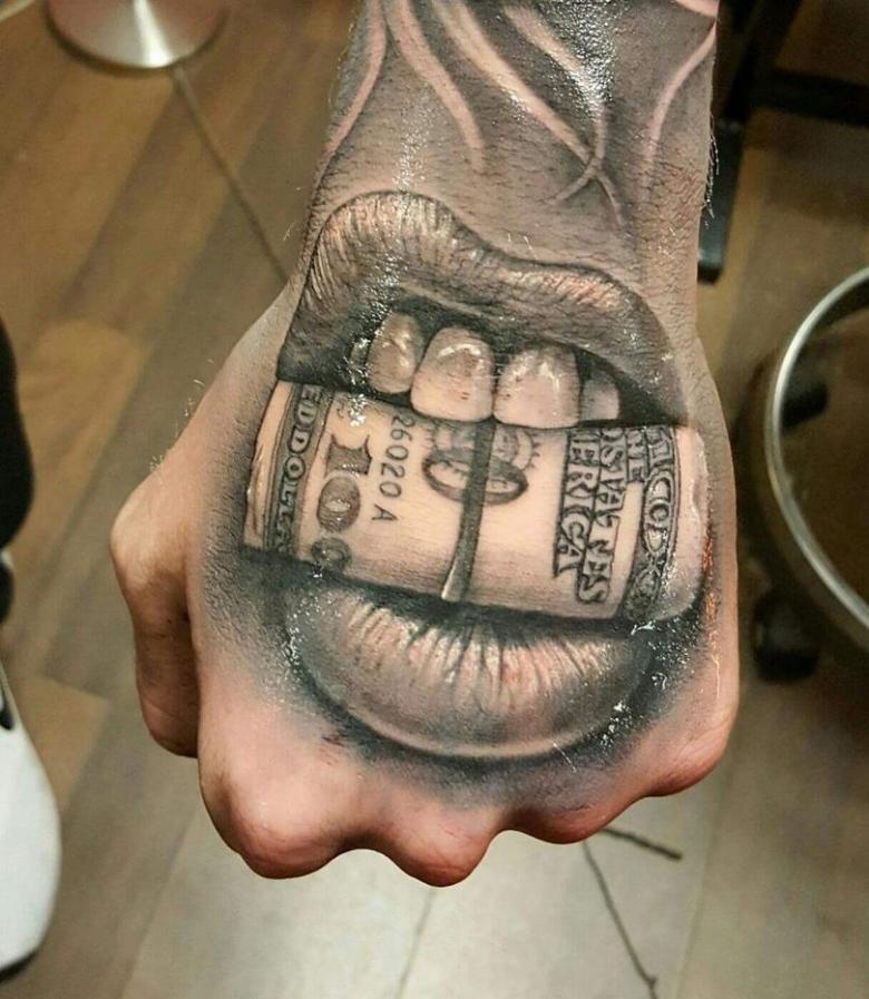 Ces tatouages ne conviennent pas seulement aux hommes d'affaires mais aussi à toute personne souhaitant renforcer son statut financier. L'image de l'argent peut être réalisée à partir d'une photo ou d'un vrai billet. Beaucoup choisissent une devise étrangère : dollars ou euros. Le design est réalisé en couleurs pour correspondre à la note originale. Ces tatouages sont appliqués sur la poitrine, le bras ou les épaules.
