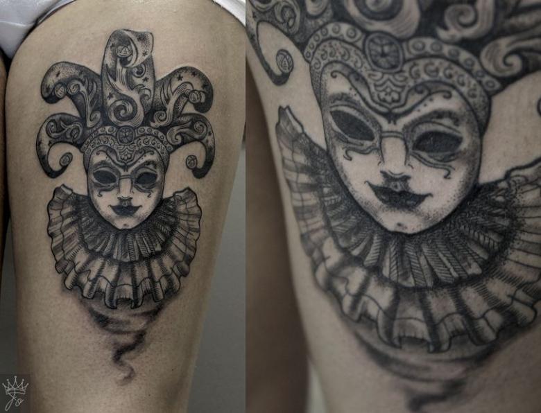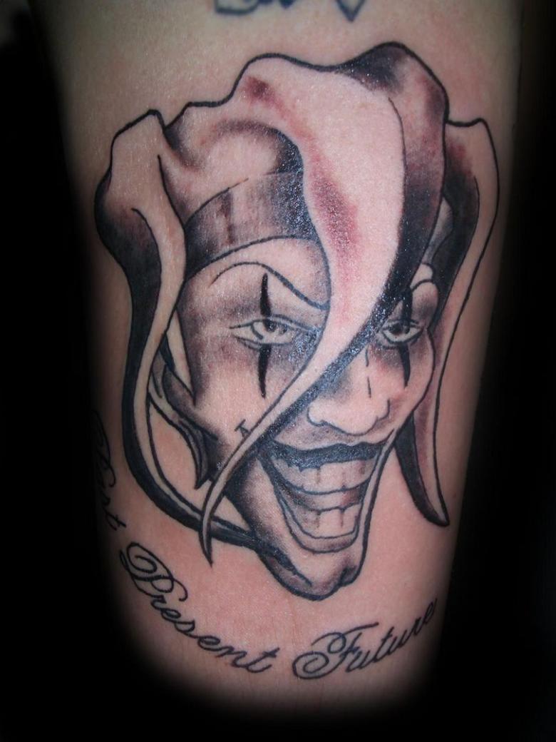 La même chose est symbolisée par le tatouage d'un bouffon avec un masque triste à la main ou un maquillage triste. Le masque ou le maquillage peut dissimuler la pudeur, l'insécurité et le secret.