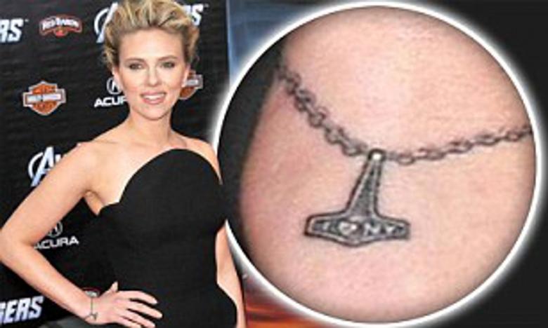 Scarlett a un bracelet tatoué sur son bras droit. Un curieux pendentif y est suspendu. L'inscription qui y figure signifie la déclaration d'amour de l'actrice à la ville de New York. La signification du tatouage n'est pas à deviner, Johansson n'a jamais caché son attitude envers sa ville natale. Le tatouage est apparu sur le poignet de l'actrice avant la première projection d'Avengers.