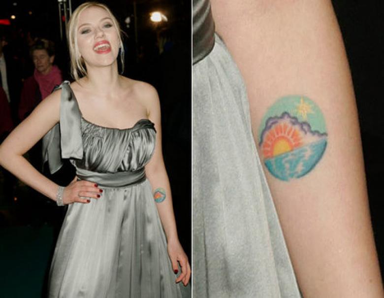 Un soleil se levant sur la mer est tatoué sur l'intérieur de son avant-bras (tatouage de soleil). Sketch conçu par Scarlett elle-même. Elle voulait que le design soit clair et coloré.