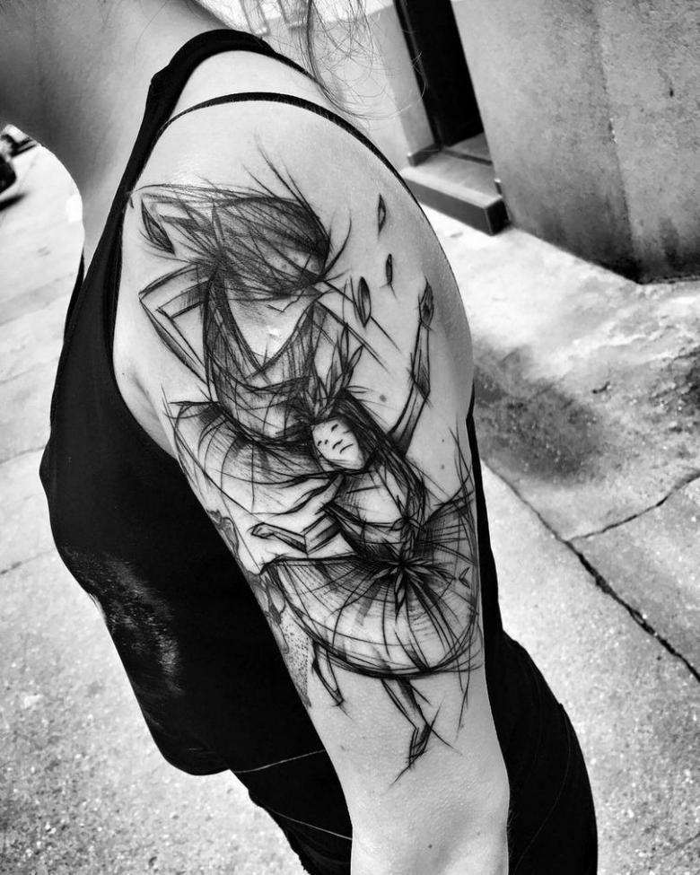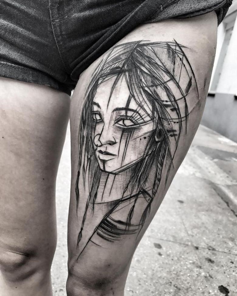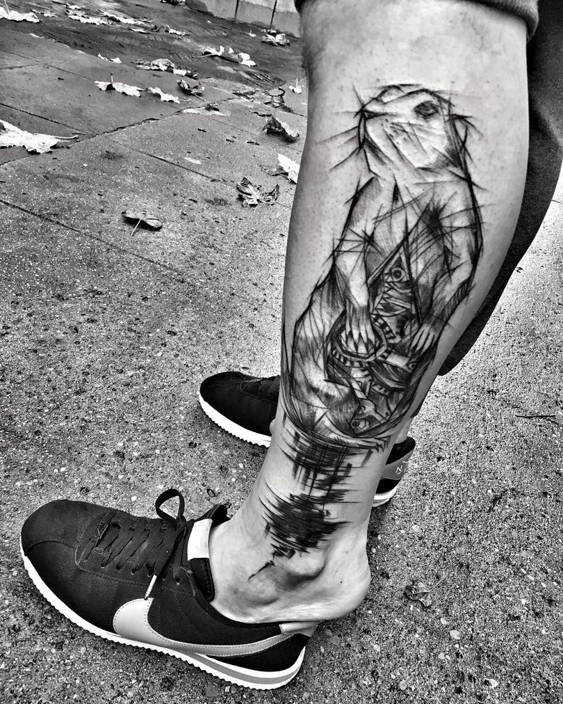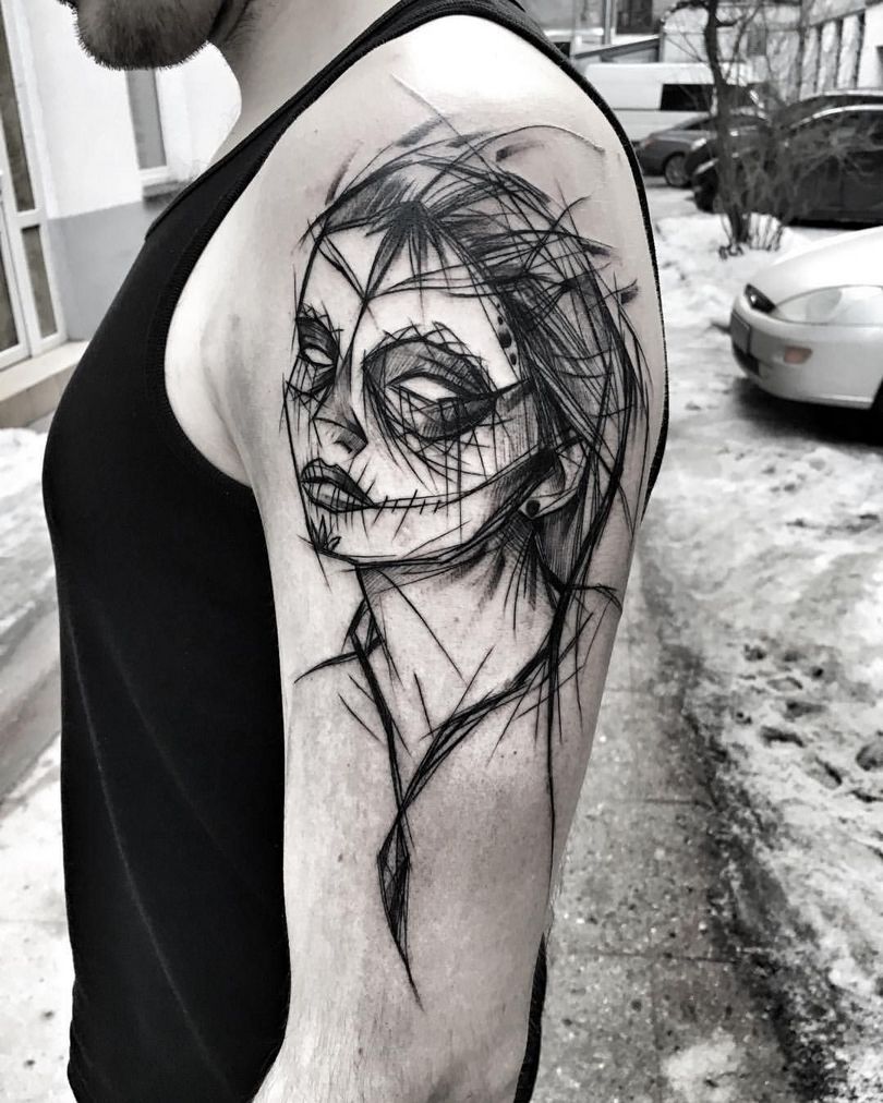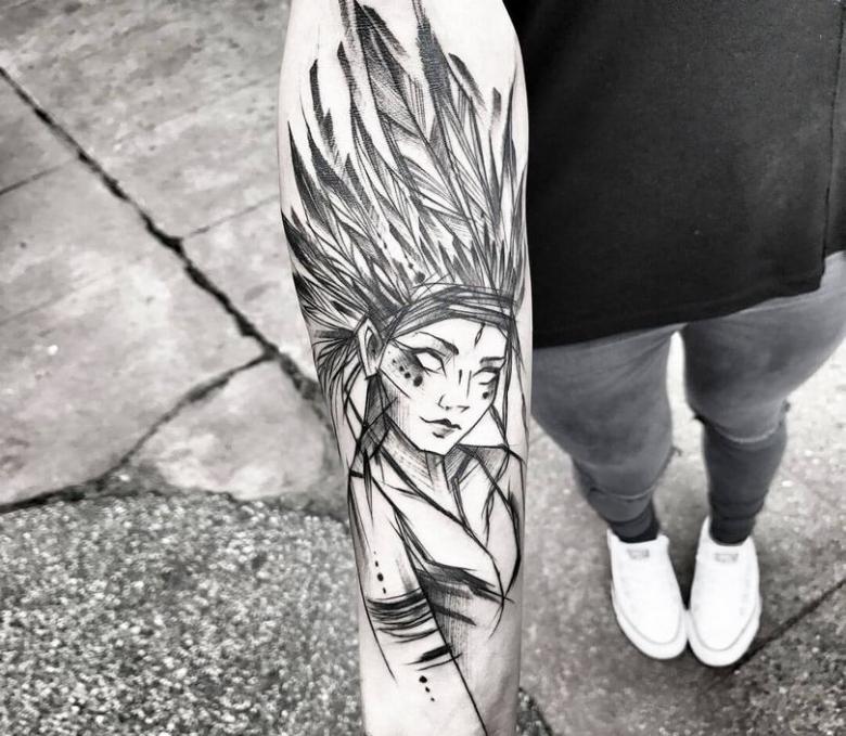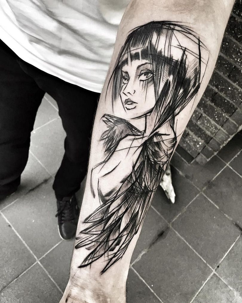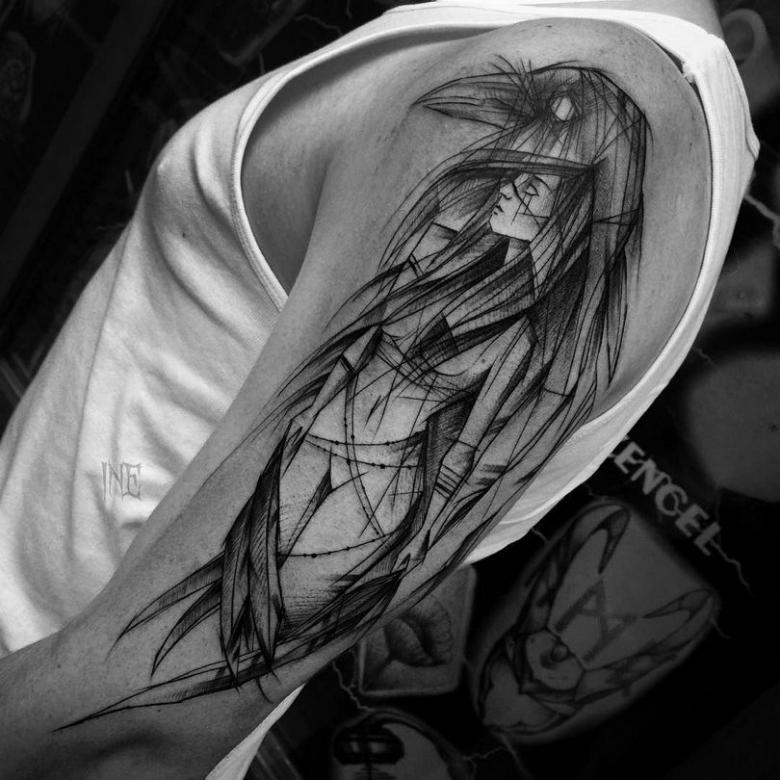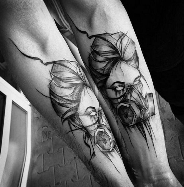 Le principal avantage de cette tendance est l'absence de frontières claires et l'excellente combinaison avec d'autres styles. Dans la plupart des cas, le tatouage dans le style du croquis ressemble un peu à une vieille photo. Elle est réalisée principalement en noir et blanc.