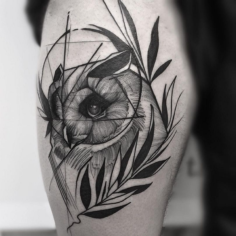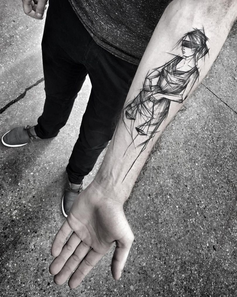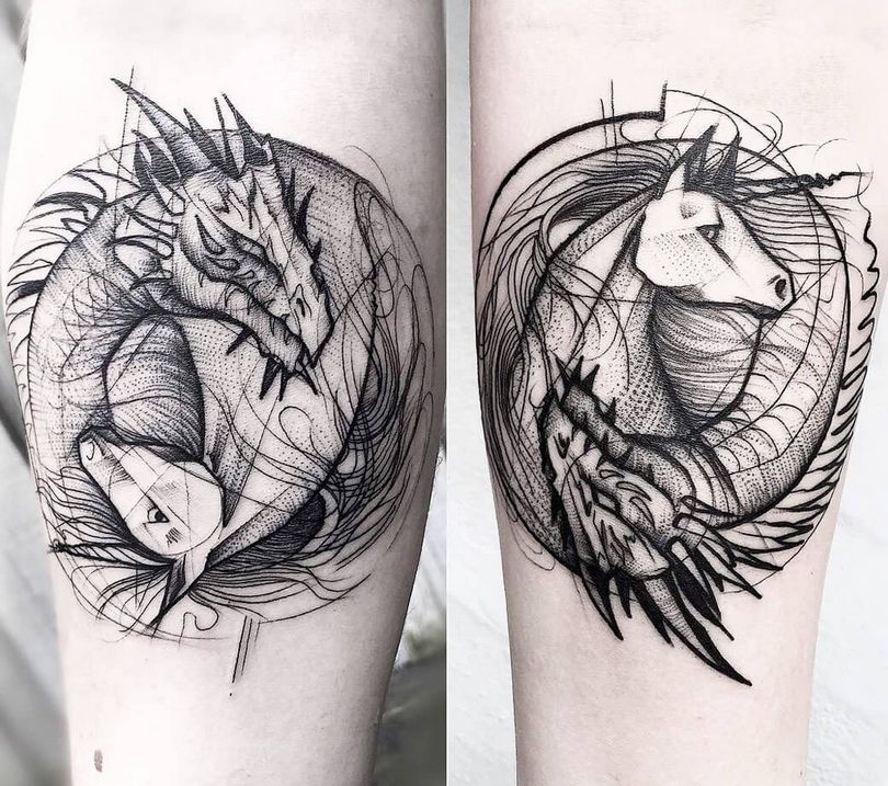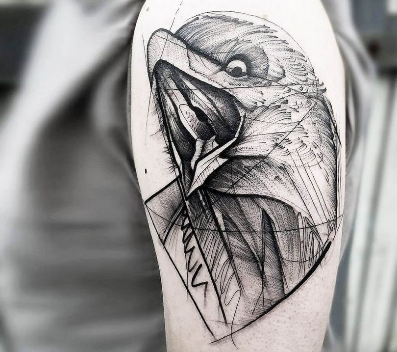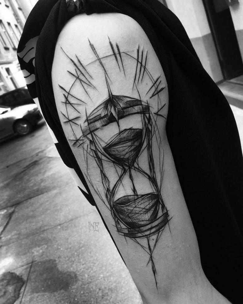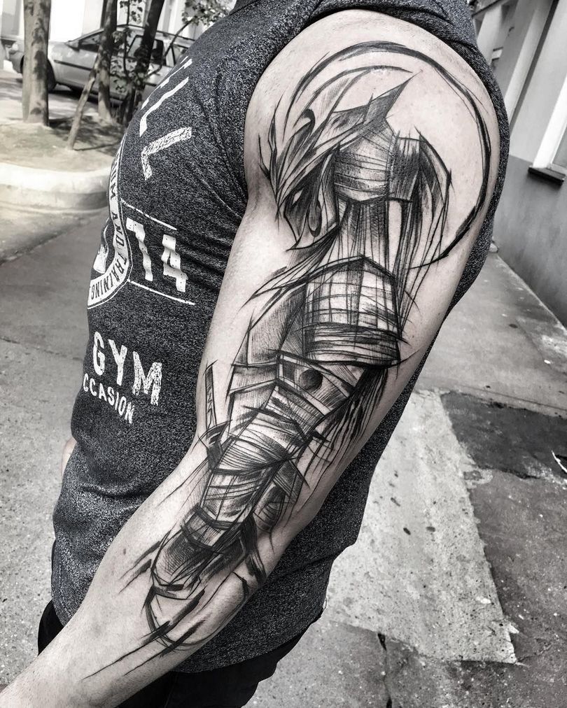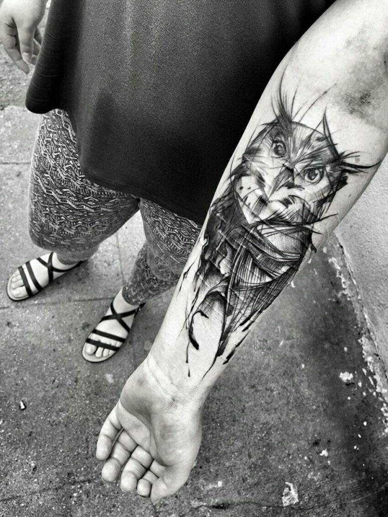 Le principal avantage de cette tendance est l'absence de frontières claires et l'excellente combinaison avec d'autres styles. Dans la plupart des cas, le tatouage dans le style du croquis ressemble un peu à une vieille photo. Elle est réalisée principalement en noir et blanc.