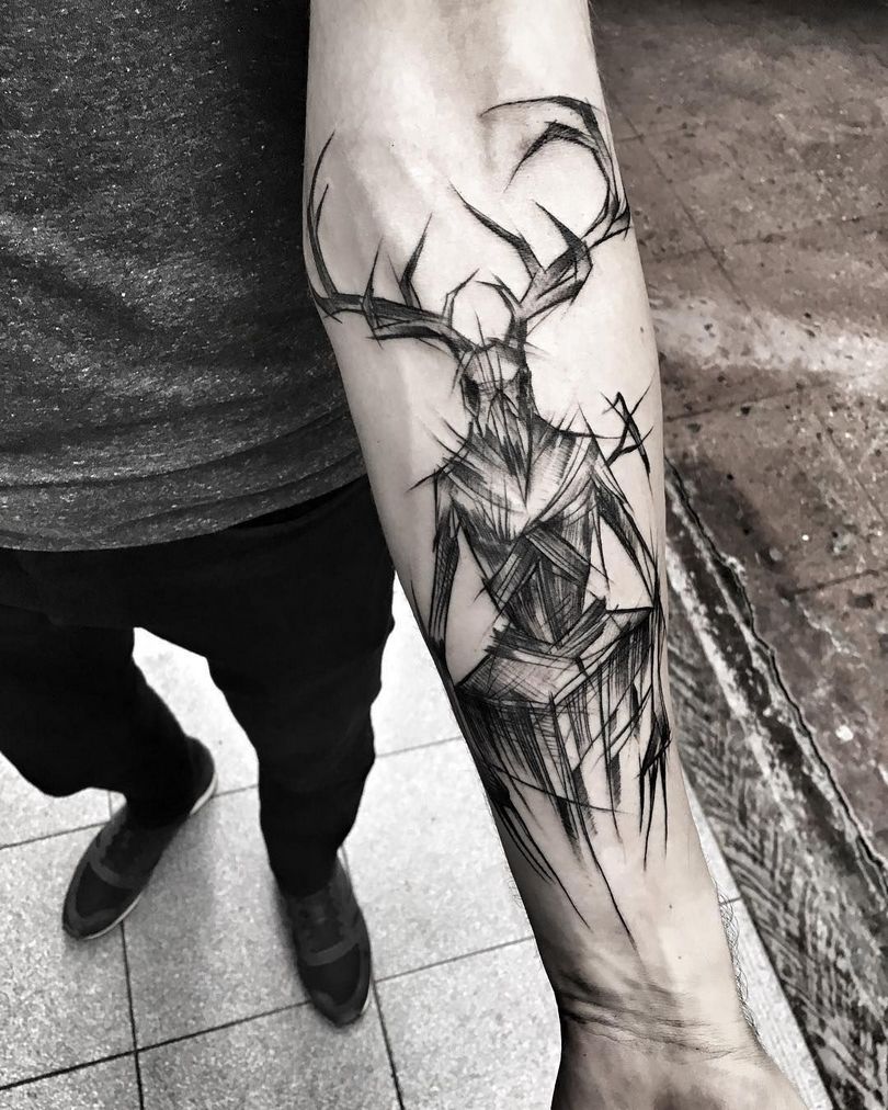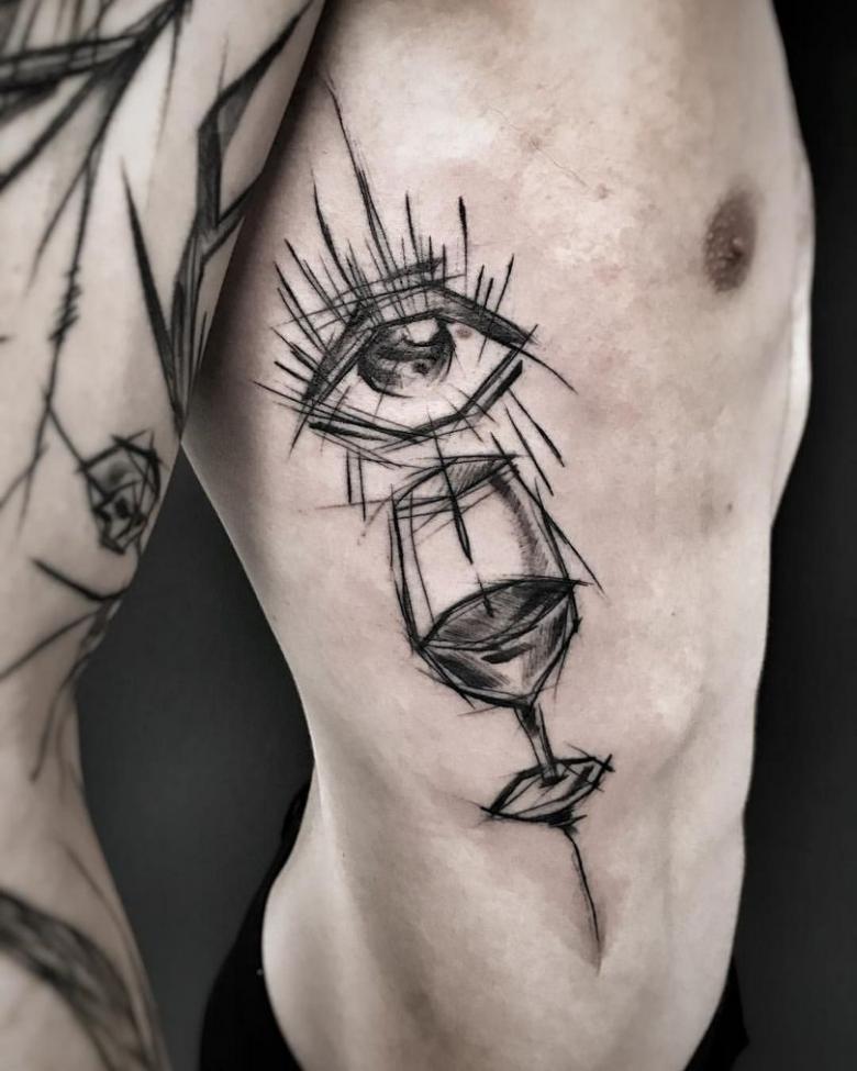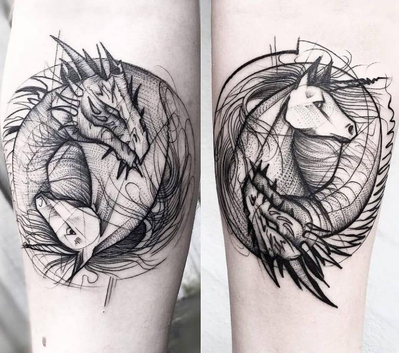 Les tatouages par croquis commencent par une simple esquisse. Ensuite, l'auteur le retrace minutieusement : il ajoute un jeu d'ombres, des détails savamment pensés. Très souvent, grâce à la diligence du maître, une belle esquisse, remplie de sens profond, est reçue. Par conséquent, à l'avenir, le client décide de laisser le tatouage sans autre modification. Les principaux traits distinctifs d'une telle direction sont l'absence de détails superflus et de prétention excessive qui détourne l'attention des détails importants du design.