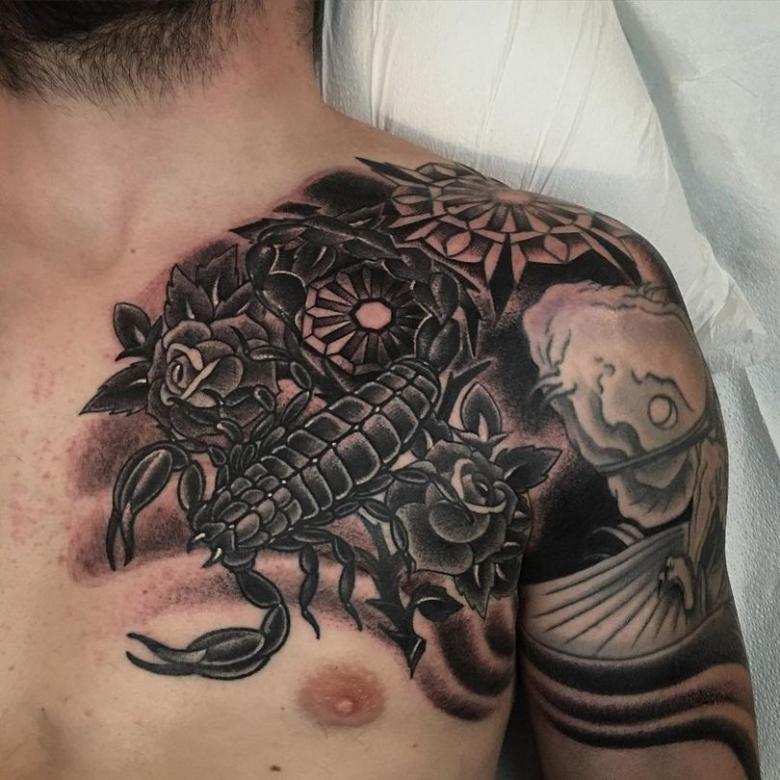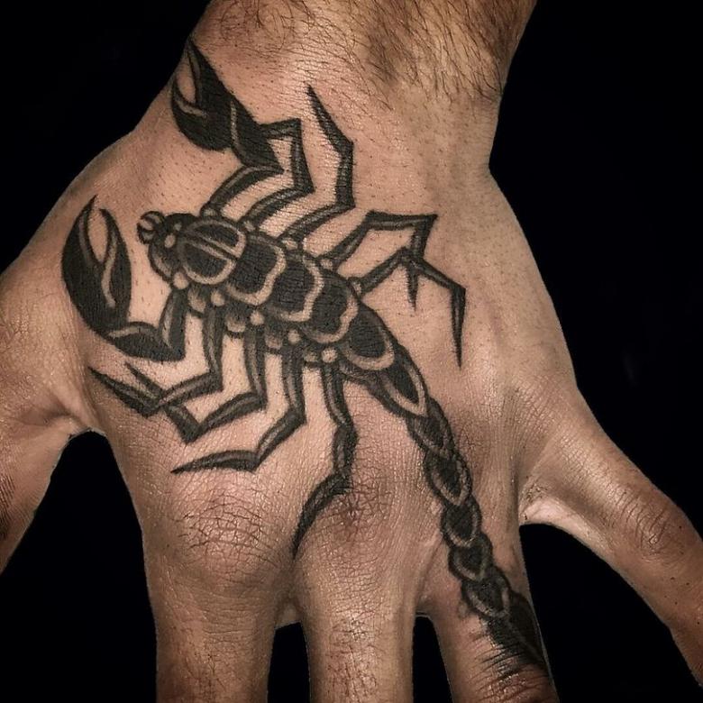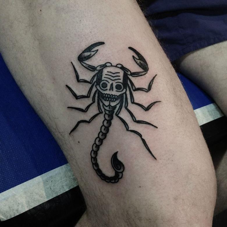 Ce motif est très populaire chez les hommes. En parlant du nuage de significations, nous pouvons mentionner les principaux concepts - pouvoir, passion, protection, secret, contrôle et énergie sexuelle. Le tatouage est très symbolique et porte toujours une histoire claire et l'identification de la personne avec un insecte dangereux.