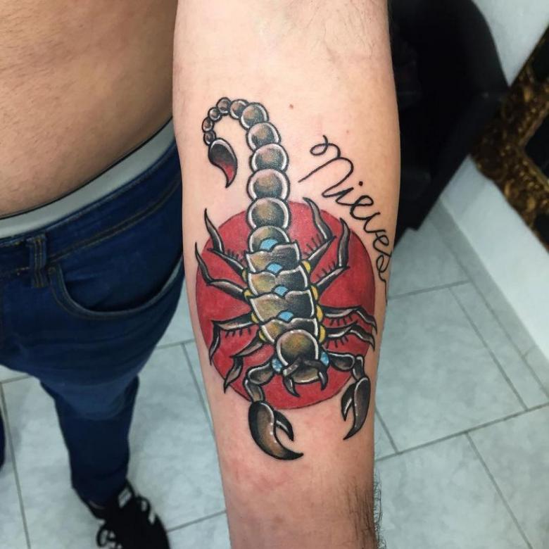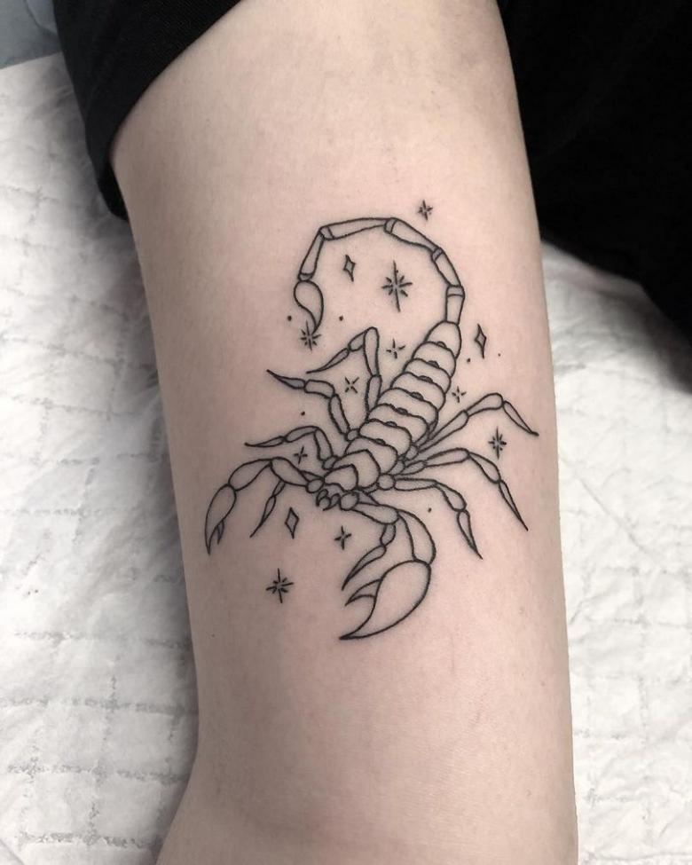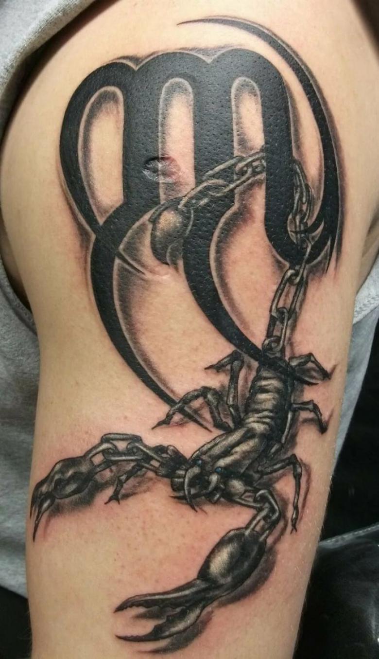 Ici, tout est simple. De nombreuses personnes nées entre le 24 octobre et le 22 novembre se font un symbole astrologique. Cela est facile à comprendre lorsque vous voyez la lettre latine "m" à côté de l'image d'un insecte, ou séparément la lettre avec une flèche au bout.