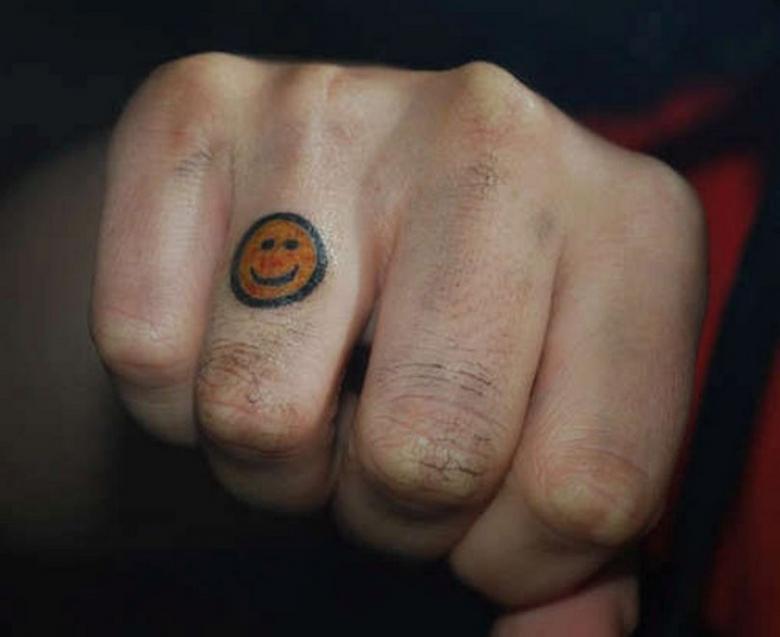 Les hommes optent pour la version classique - un simple visage jaune avec un sourire jusqu'aux oreilles. Il est placé sur les mains - mains, avant-bras et épaules. Parfois, une solution non conventionnelle peut être envisagée : un tatouage de visage souriant sur les doigts, comme une bague. Pour les hommes, ce symbole signifie également la tranquillité d'esprit et une approche positive de la réalité.