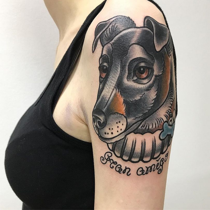 L'image du chien représente souvent l'espièglerie et une attitude énergique. Ce tatouage convient aux personnes qui n'ont pas perdu cette espièglerie enfantine que beaucoup de gens oublient avec le temps.