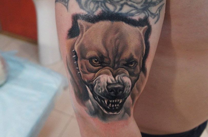 Par exemple, les chiens qui aboient ou grognent sont utilisés comme un symbole d'avertissement inquiétant. Dans ce cas, le chien sera une image d'agressivité, reflétant l'essence du propriétaire du tatouage.