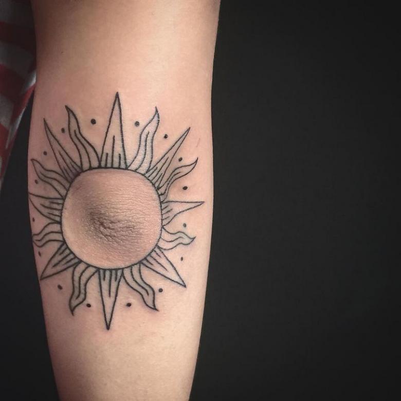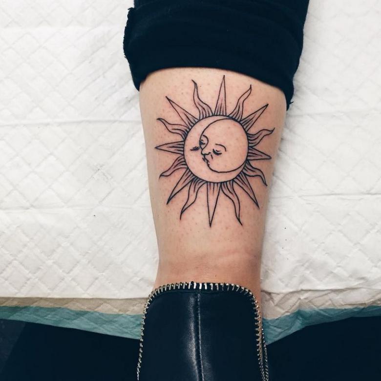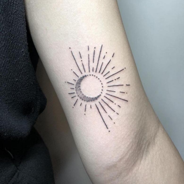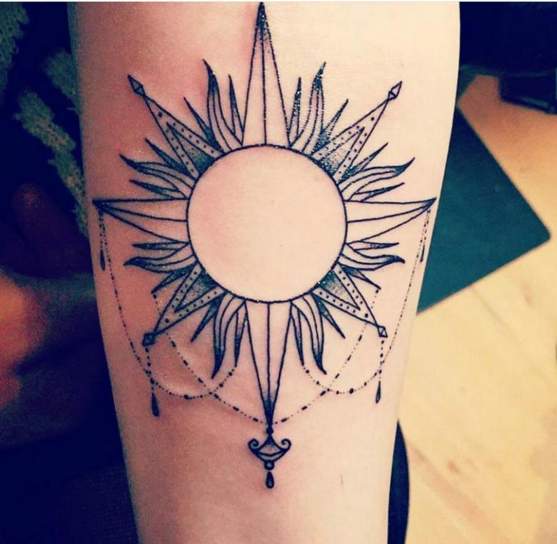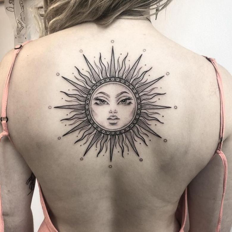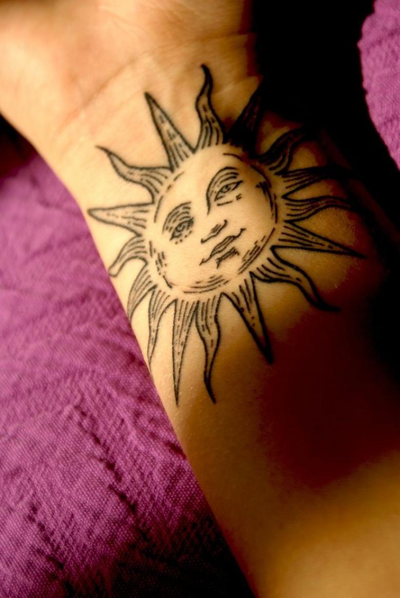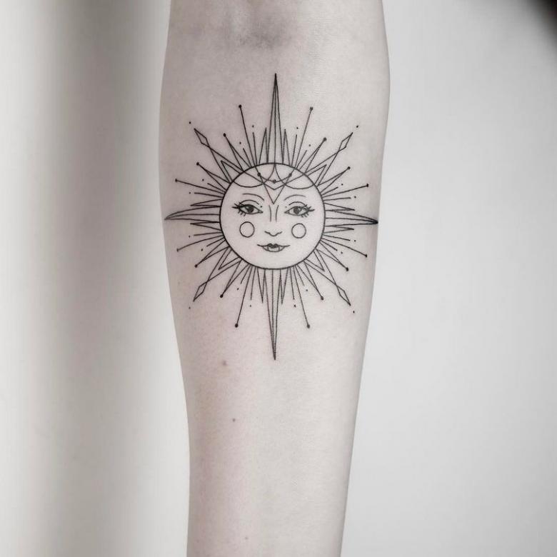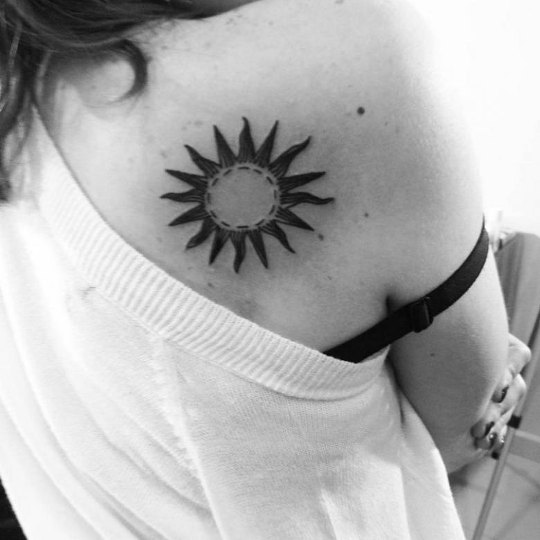 Le soleil semble très harmonieux sur le corps d'une belle jeune fille, symbolisant la lumière omniprésente de la vérité, la renaissance à une nouvelle vie. La jambe, la clavicule, le poignet, l'épaule et le cou sont des emplacements possibles pour le tatouage.