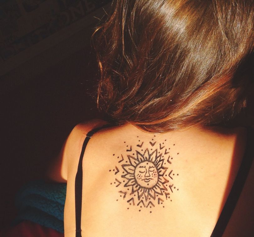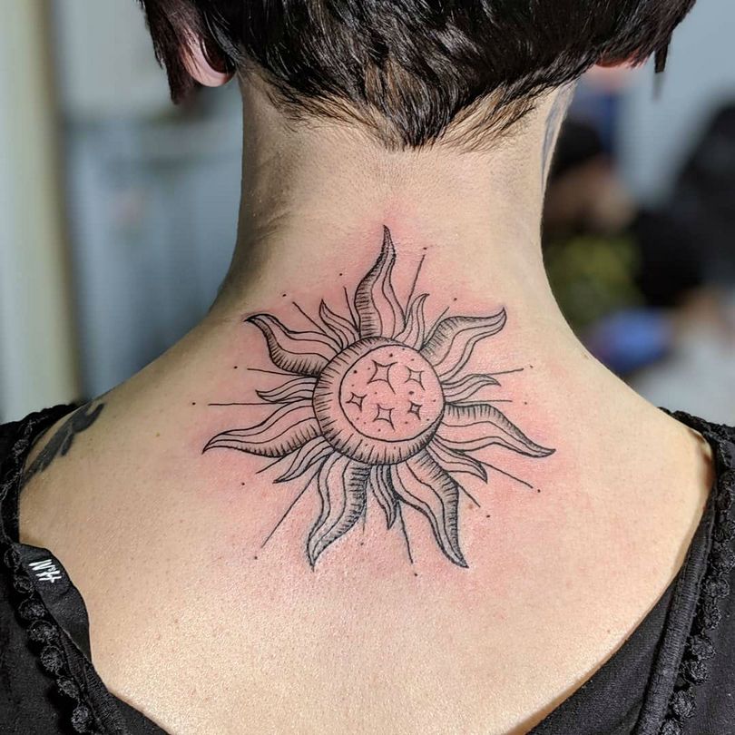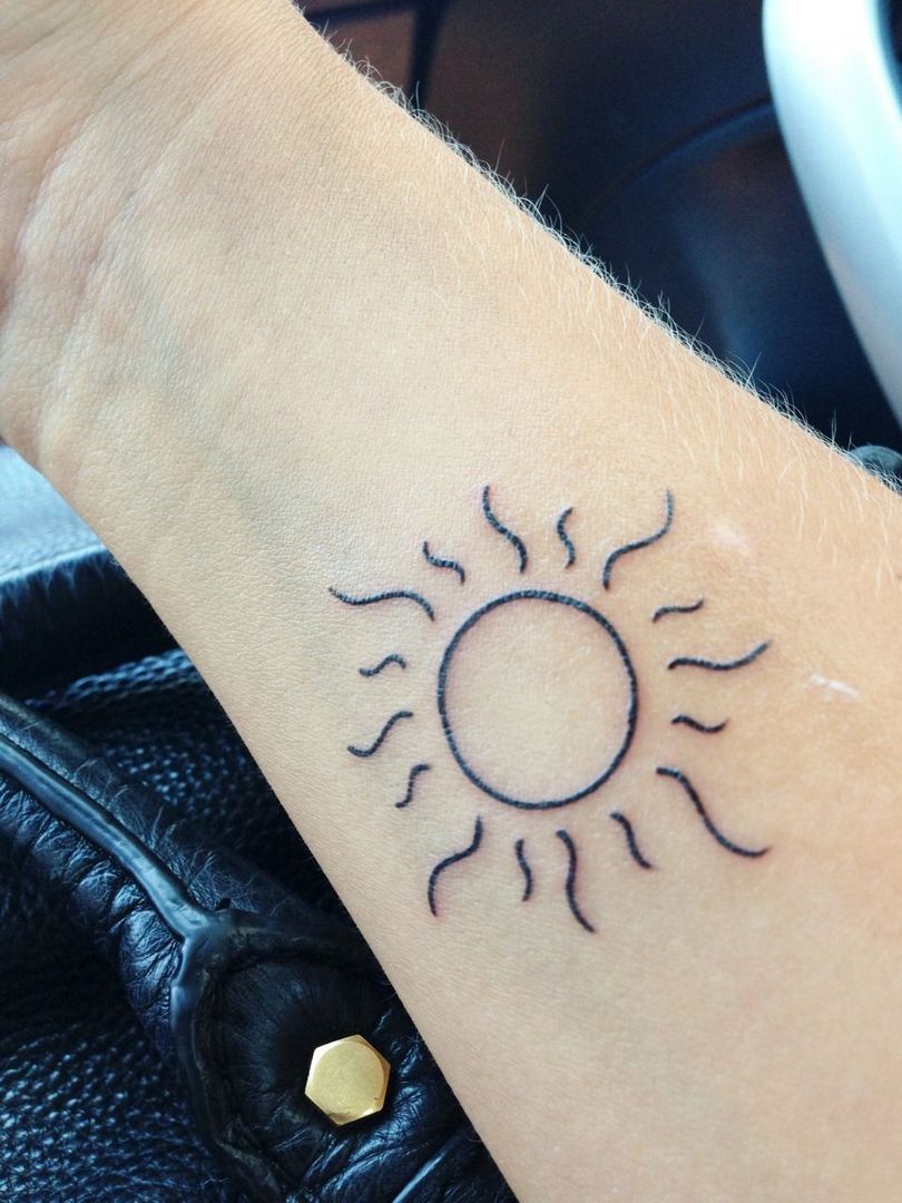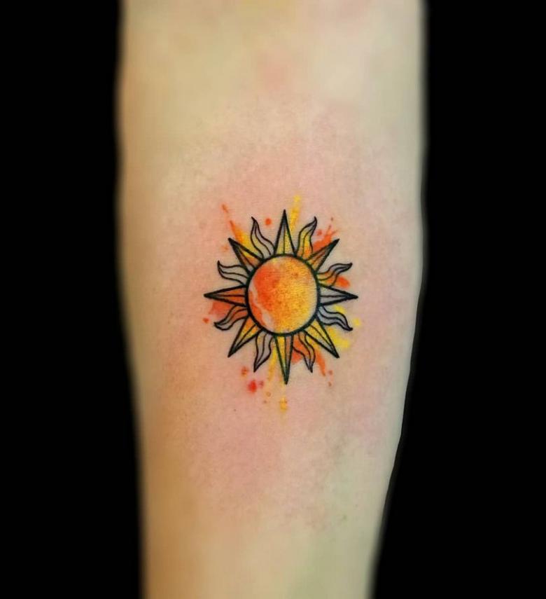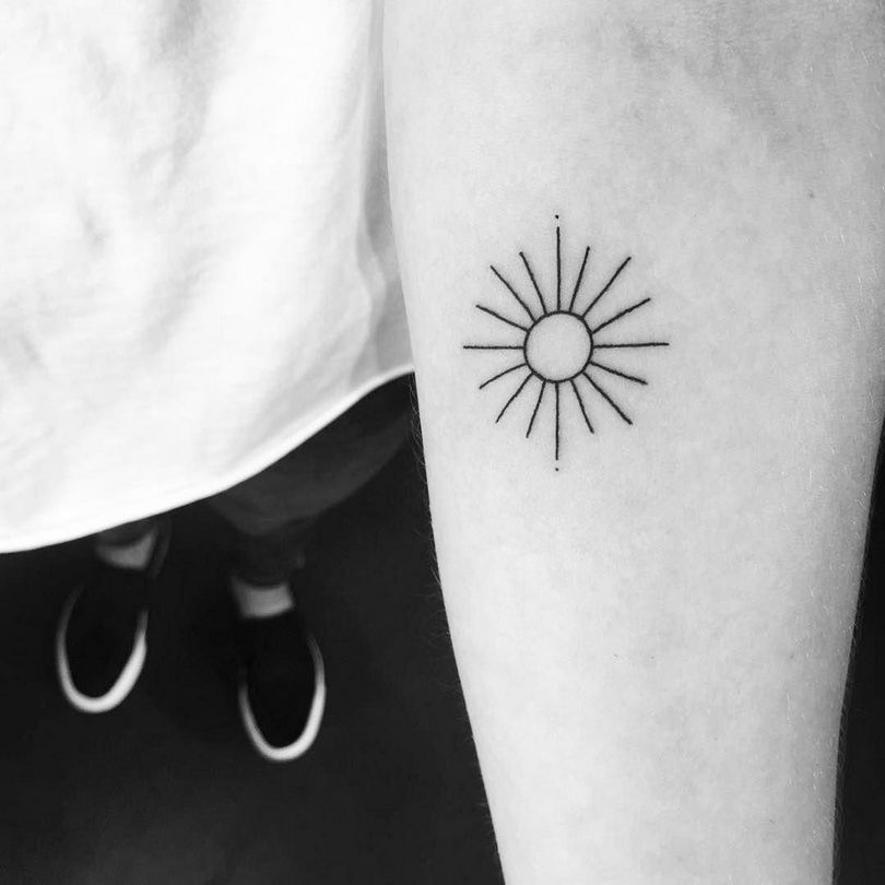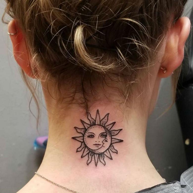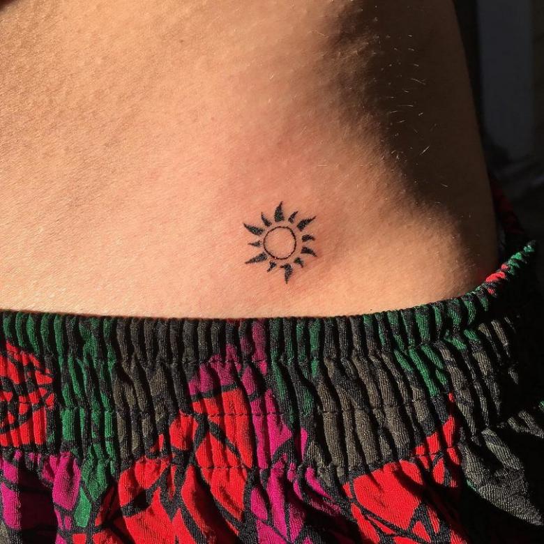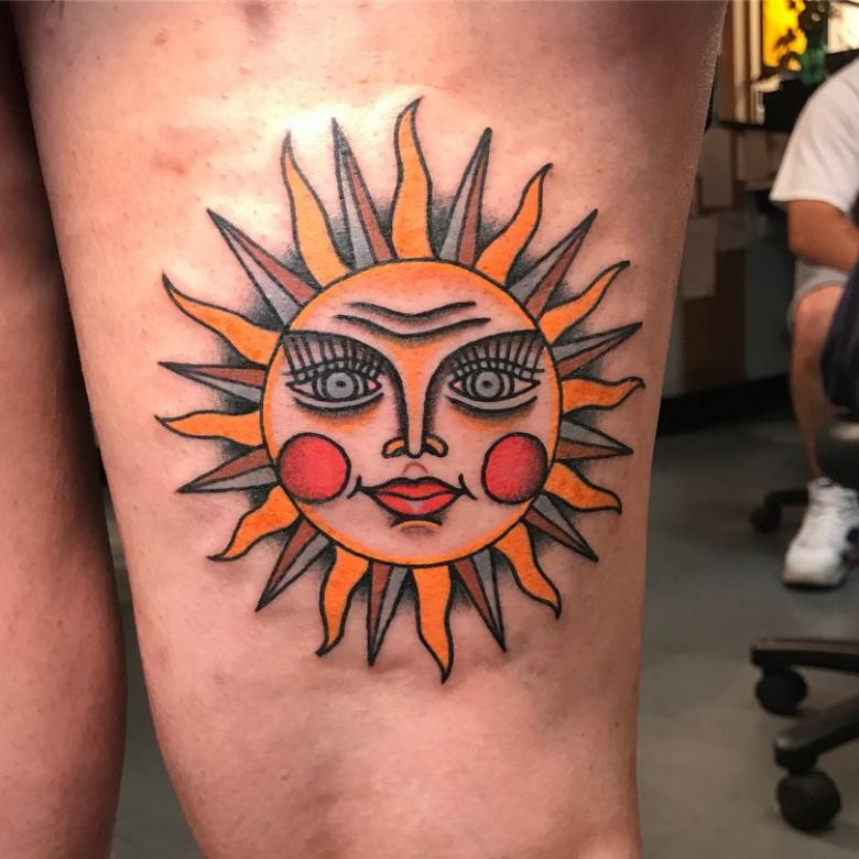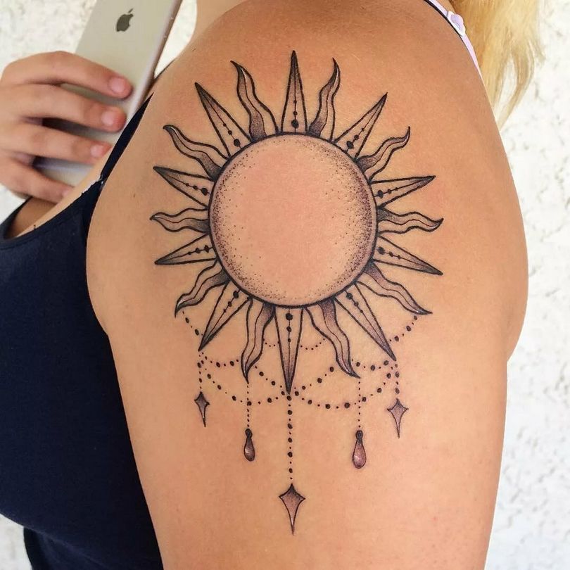 Le soleil semble très harmonieux sur le corps d'une belle jeune fille, symbolisant la lumière omniprésente de la vérité, la renaissance à une nouvelle vie. La jambe, la clavicule, le poignet, l'épaule et le cou sont des emplacements possibles pour le tatouage.