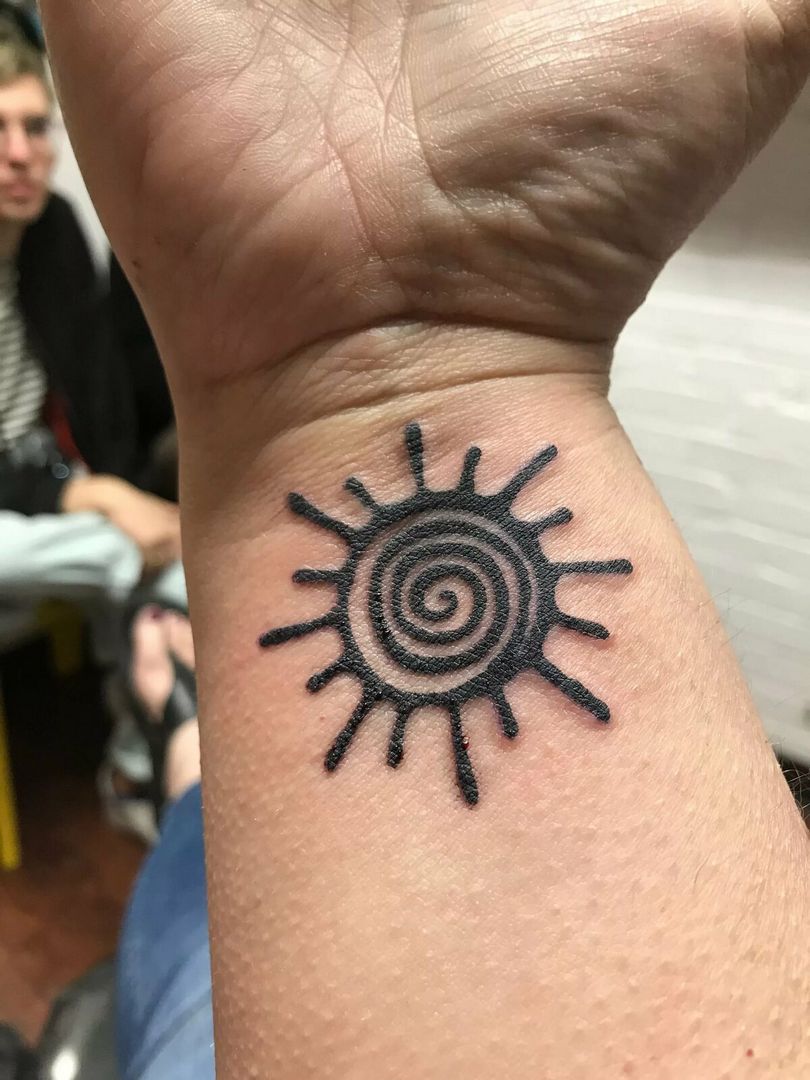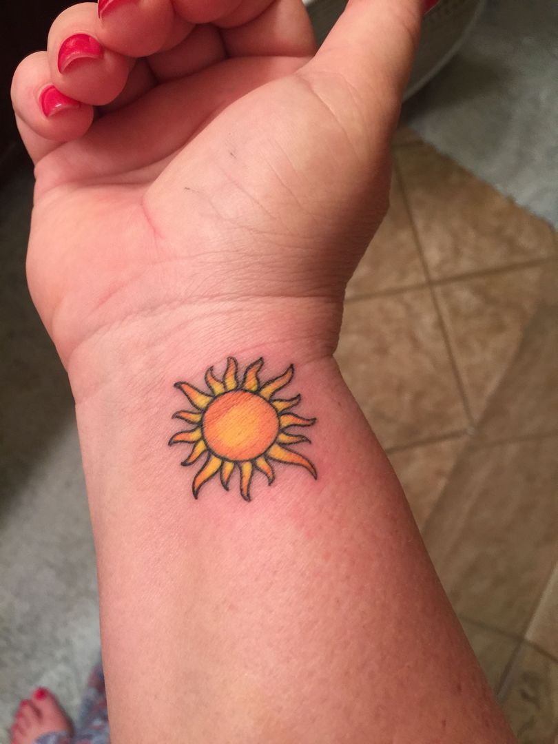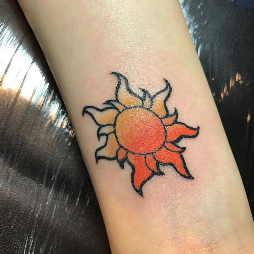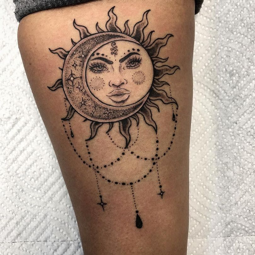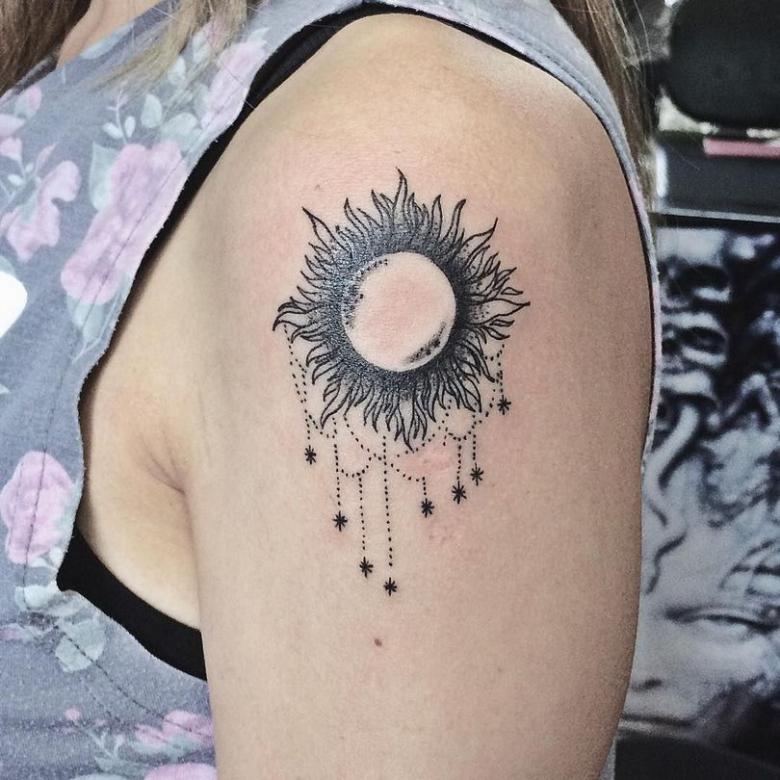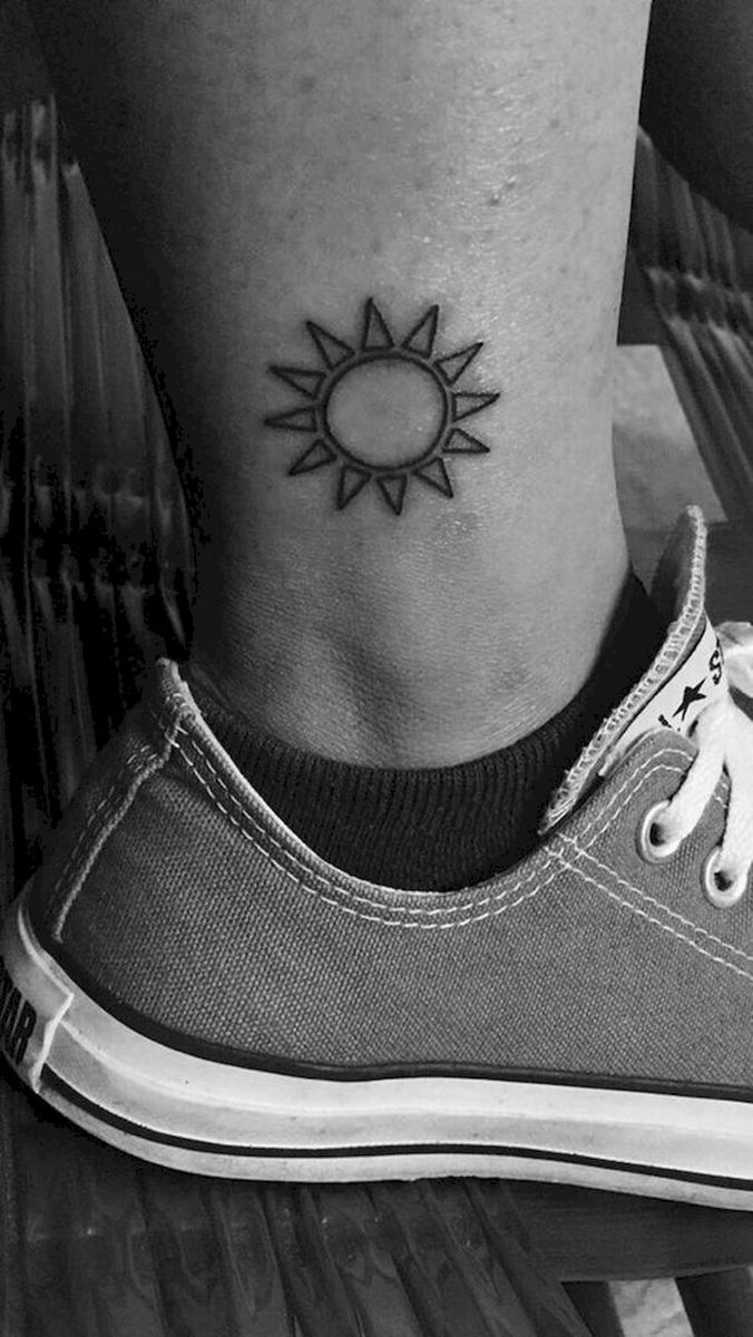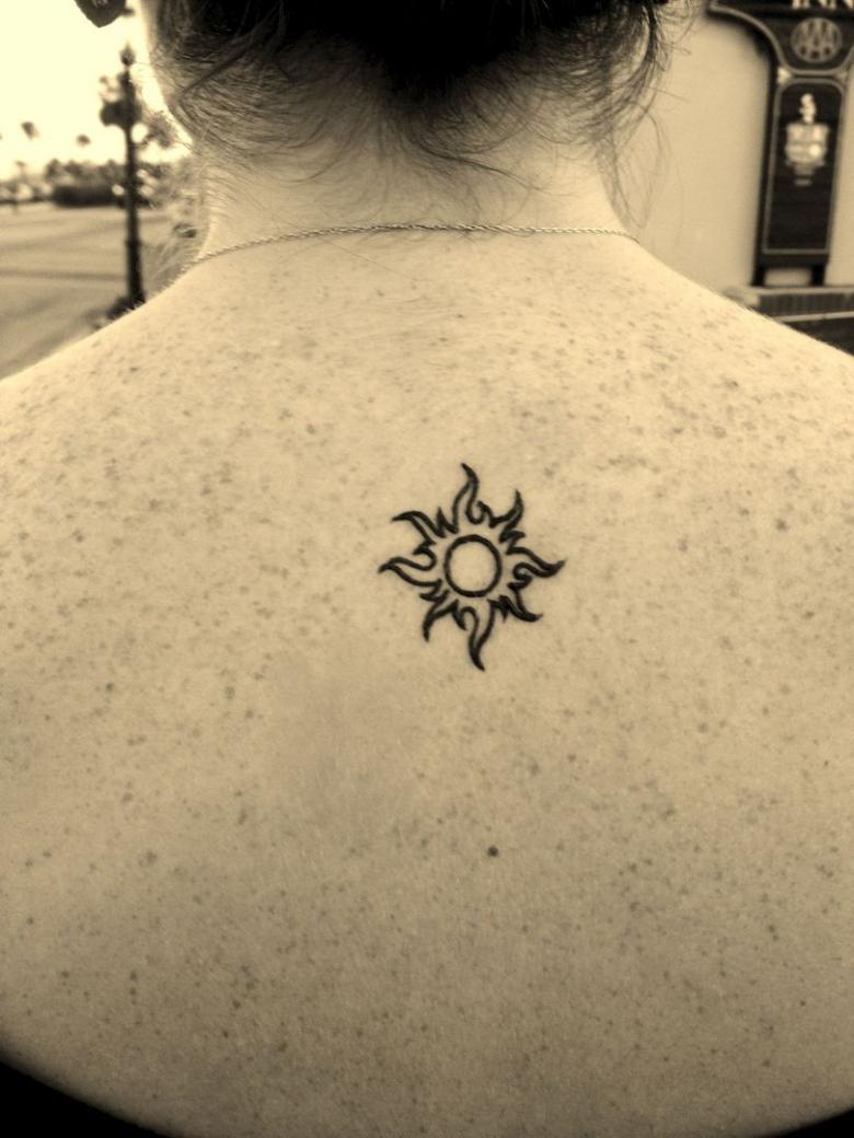 Le soleil semble très harmonieux sur le corps d'une belle jeune fille, symbolisant la lumière omniprésente de la vérité, la renaissance à une nouvelle vie. La jambe, la clavicule, le poignet, l'épaule et le cou sont des emplacements possibles pour le tatouage.