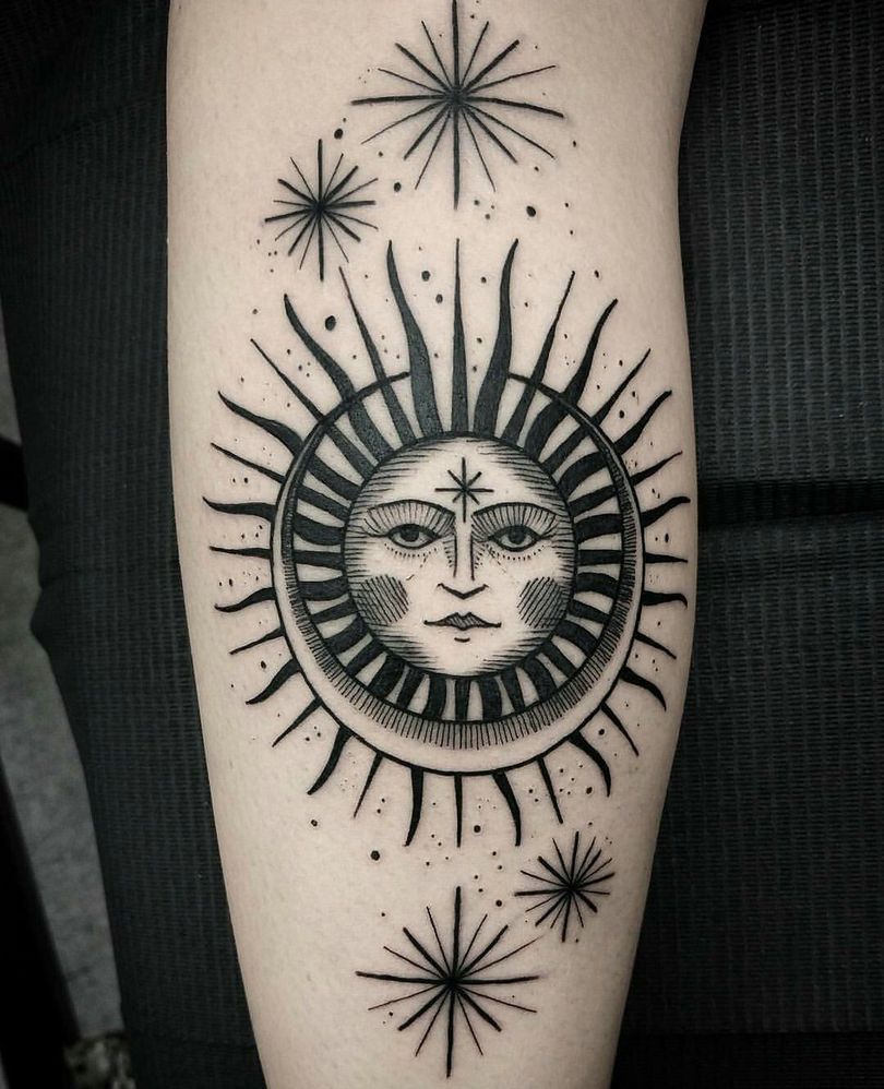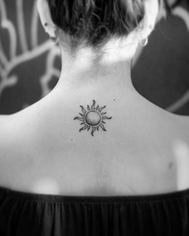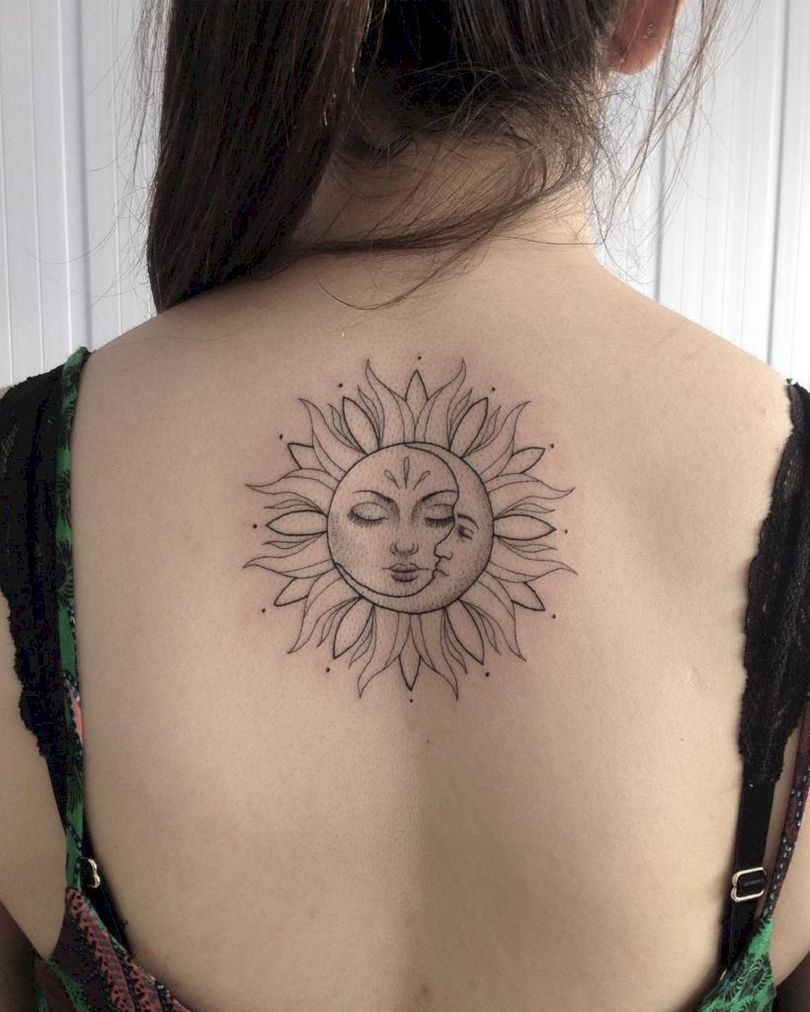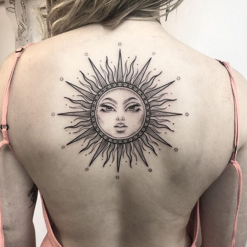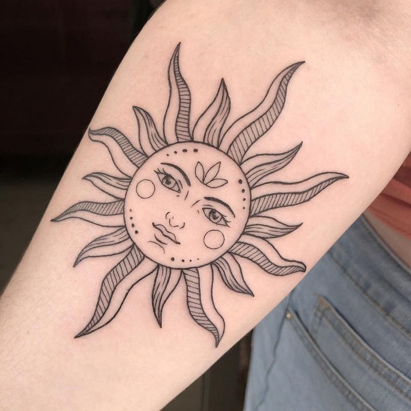 Le soleil est un thème universel pour les tatouages masculins et féminins. Évidemment, les femmes choisissent des thèmes plus sophistiqués et le style du tatouage peut être radicalement différent.
