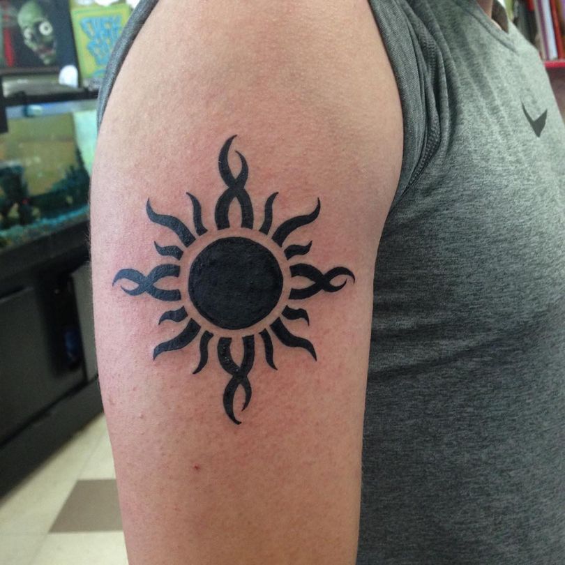 On dit que l'image du soleil noir vient des pays scandinaves. Le système figuratif de l'unité et de la lutte des contraires est rempli de nombreux phénomènes. Nous pouvons y nommer le don de la prévoyance et les ténèbres de l'ignorance, le soleil brillant de la planète des vivants et le soleil noir de l'au-delà. Un tatouage avec un soleil noir peut signifier un penchant pour l'occulte et une croyance dans l'au-delà.