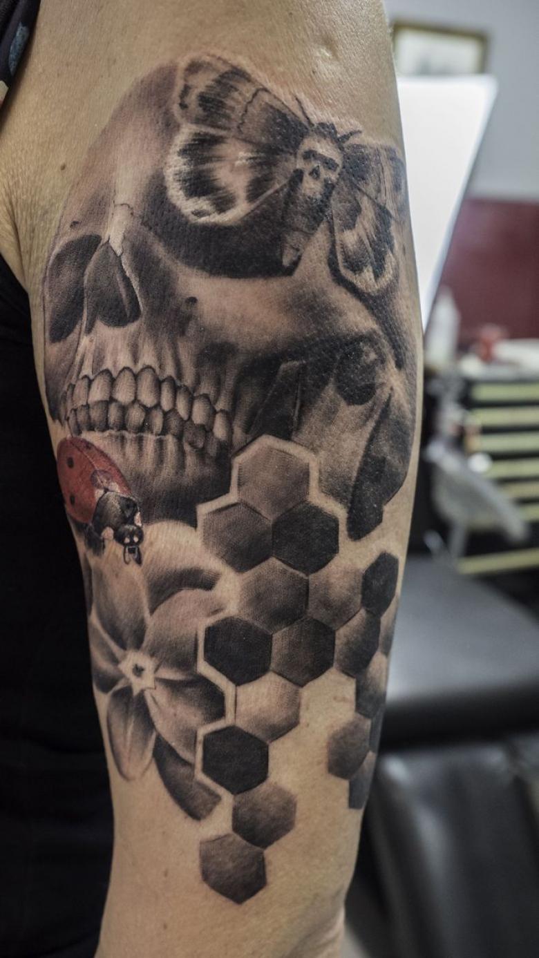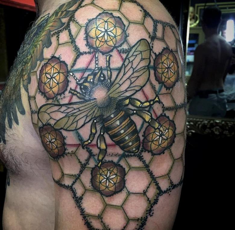 - Le motif du tatouage d'une abeille en nid d'abeille sur le corps a une signification philosophique importante. Par exemple, il peut signifier l'unité avec la nature. Il est difficile d'en comprendre la signification exacte chez une personne en particulier, car elle est généralement associée à une autre image. Un exemple courant est la combinaison avec une tête de mort, un cœur, des abeilles, etc.