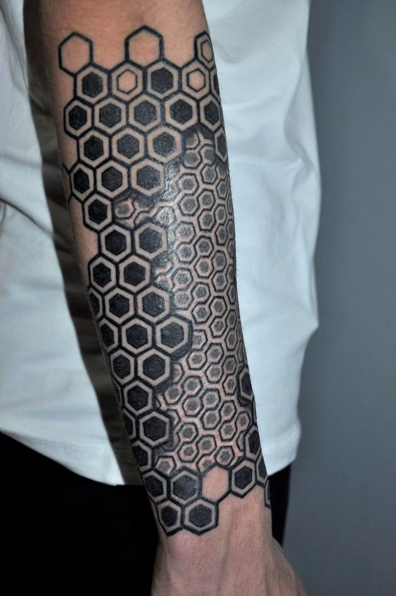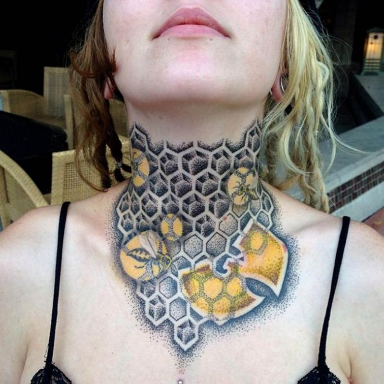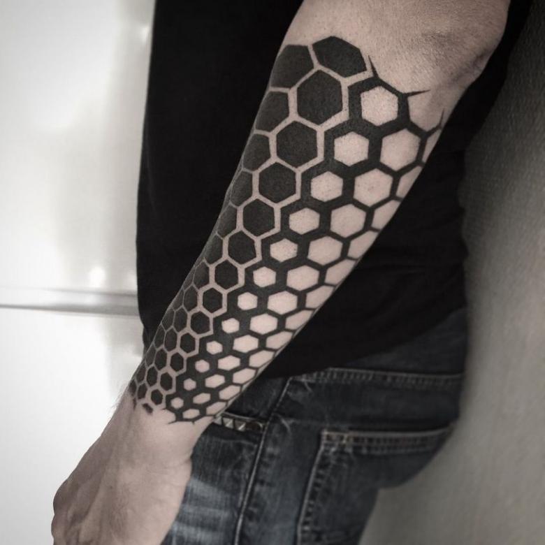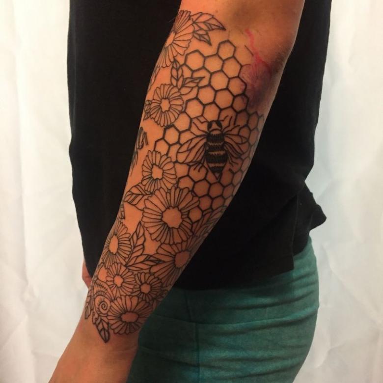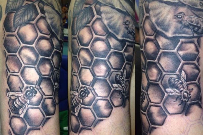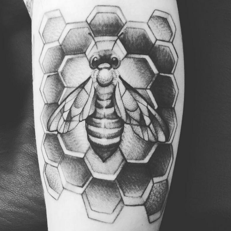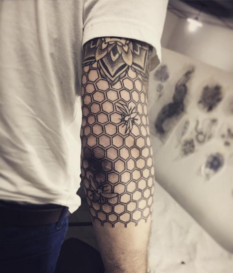 Tatouage avec nid d'abeille : signification pour les filles et les hommes, le lieu d'application (sur le bras, la manche, la jambe), croquis originaux et idées de photos