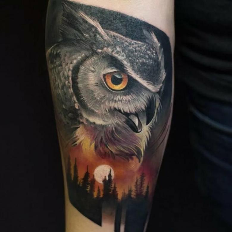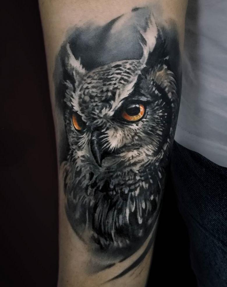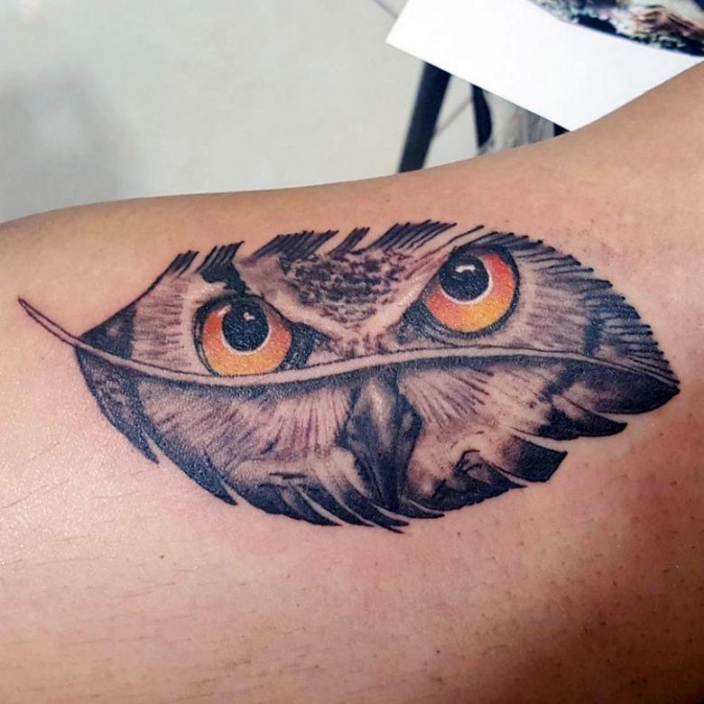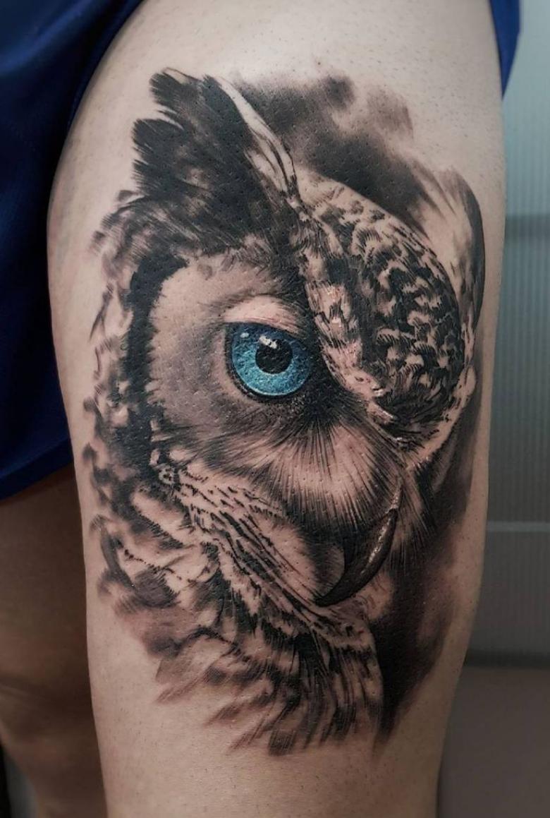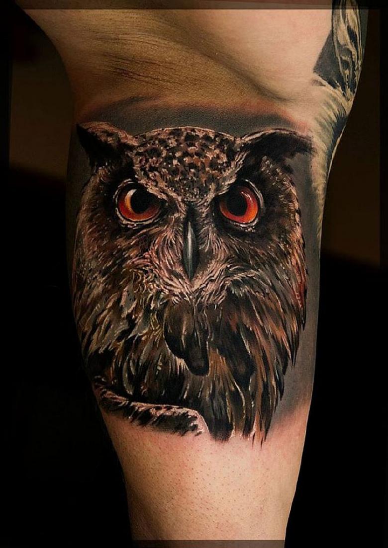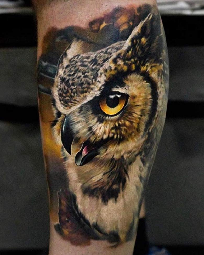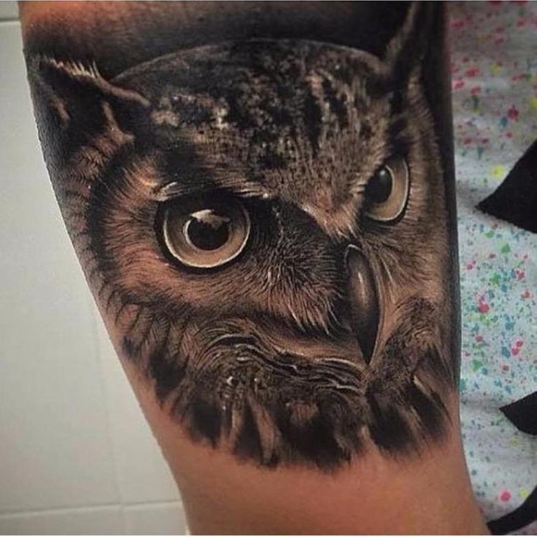 Le réalisme est souligné par la profondeur et la saturation des couleurs, les ombres et la pénombre, qui donnent au tatouage un aspect tridimensionnel et donnent l'impression qu'une chouette regarde droit dans l'âme.