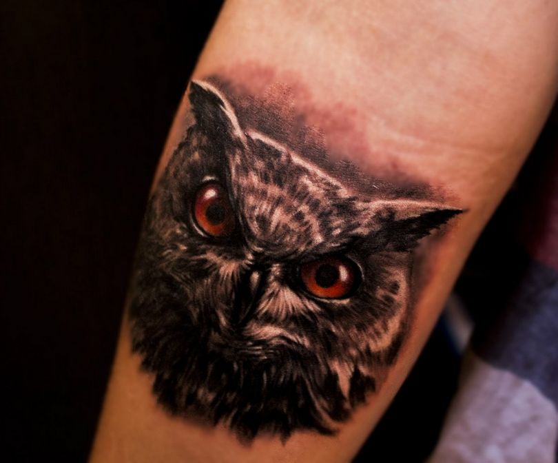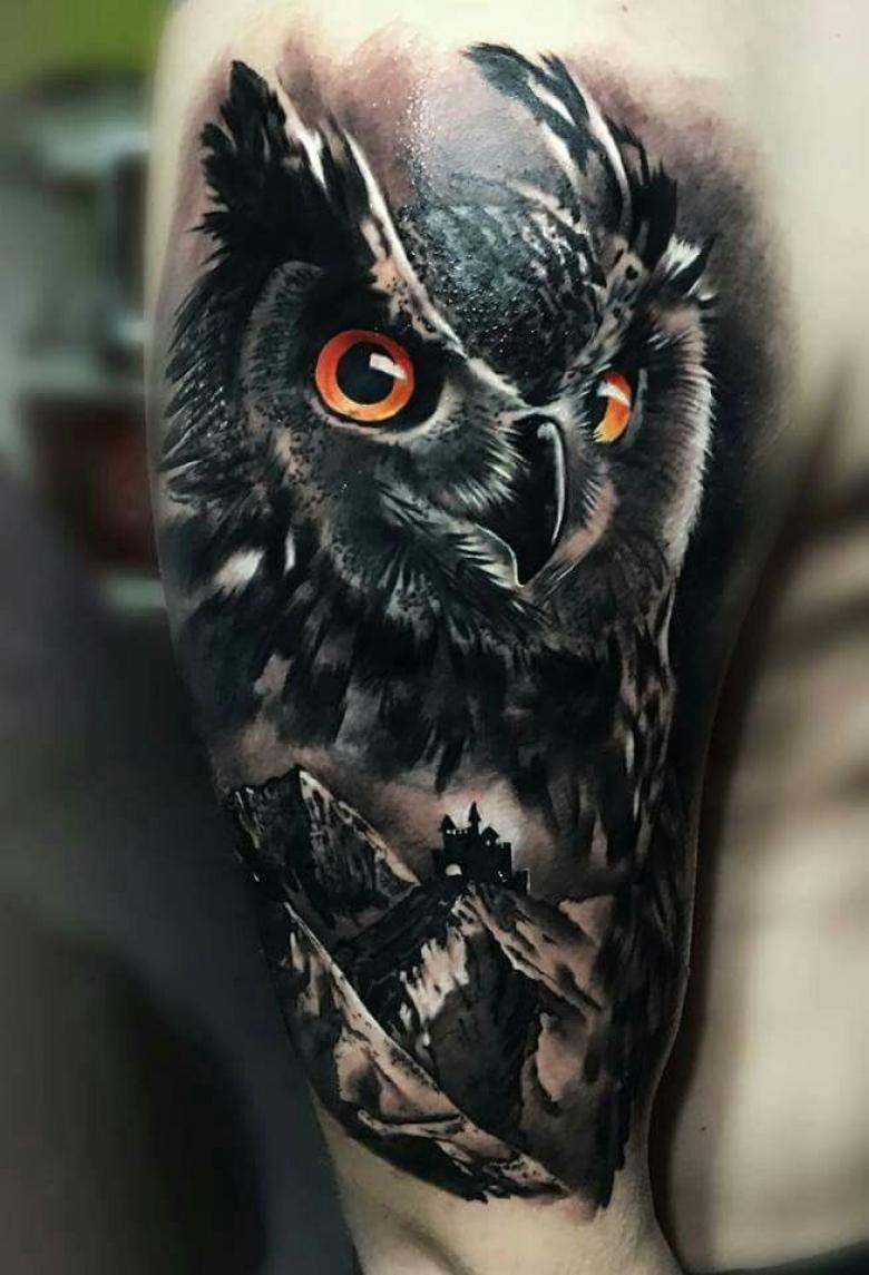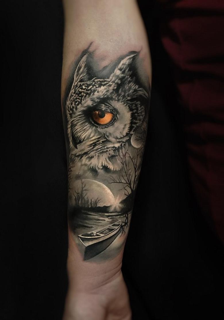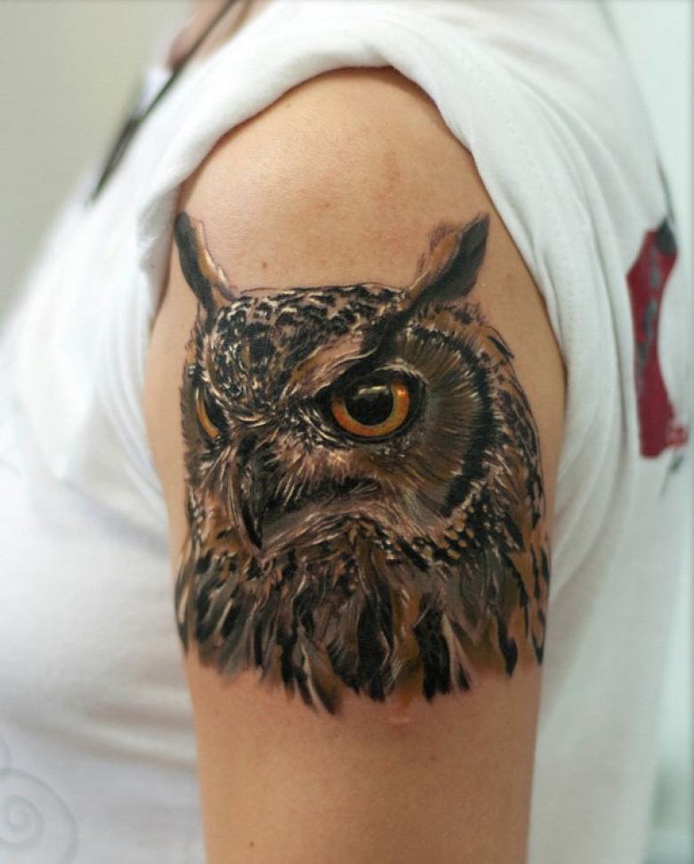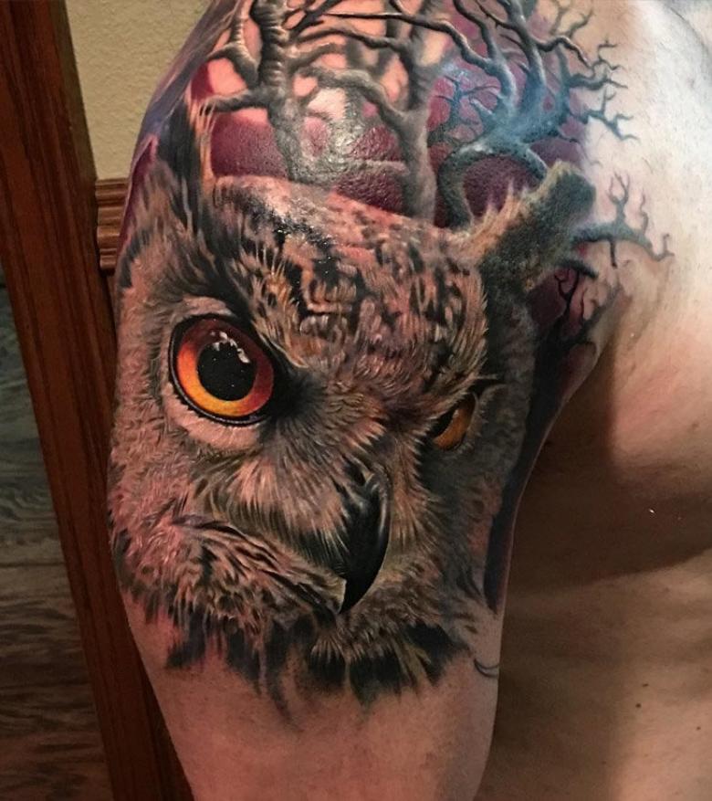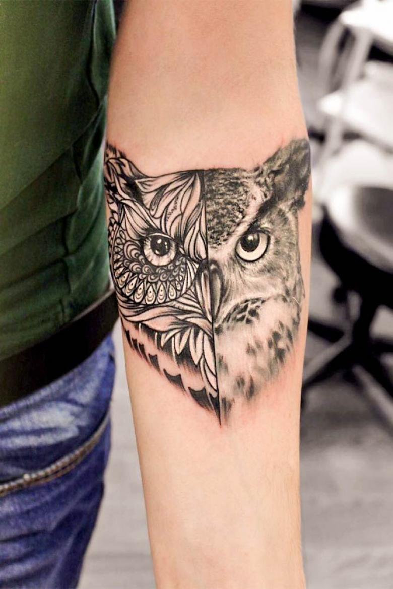 Le réalisme est souligné par la profondeur et la saturation des couleurs, les ombres et la pénombre, qui donnent au tatouage un aspect tridimensionnel et donnent l'impression qu'une chouette regarde droit dans l'âme.