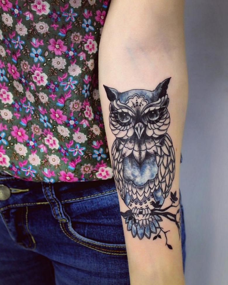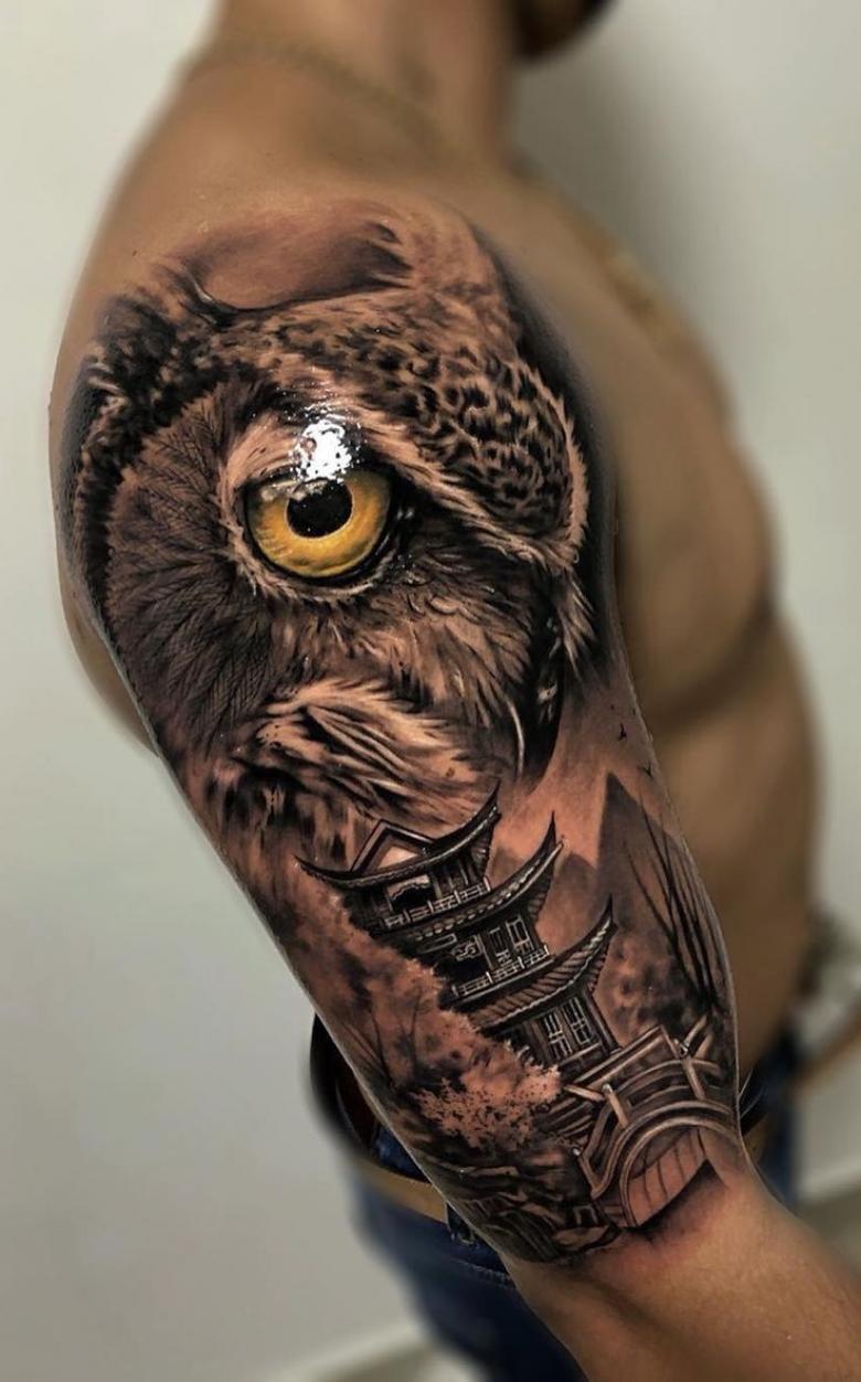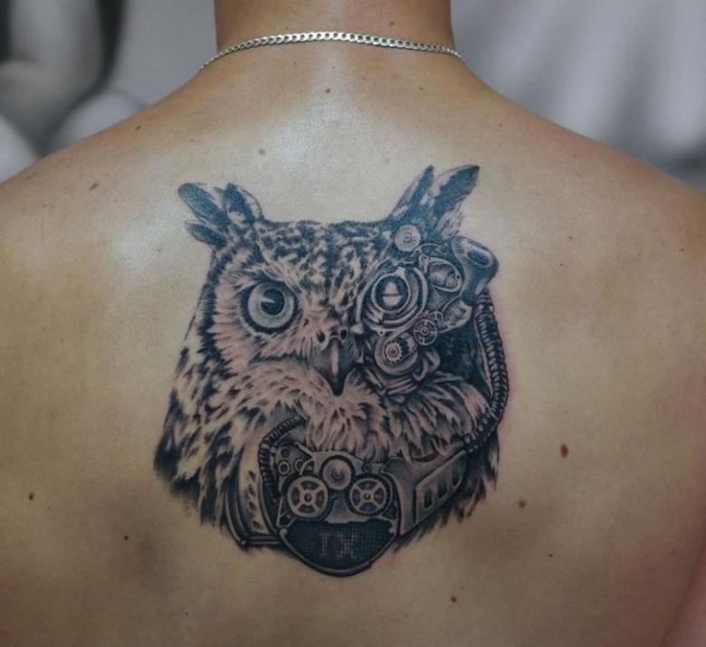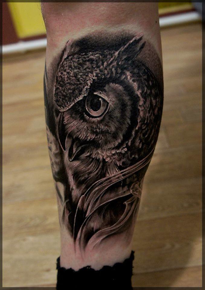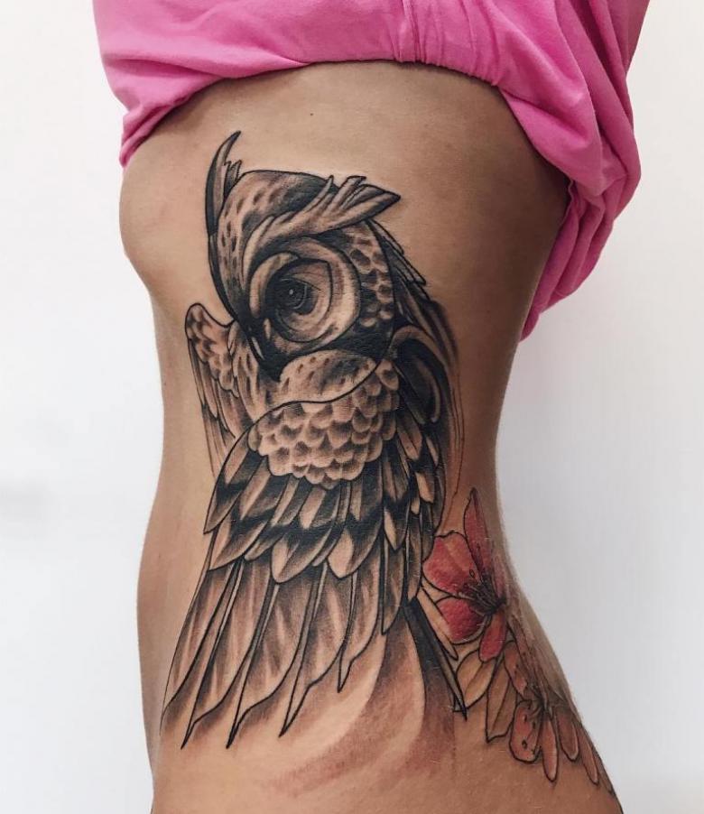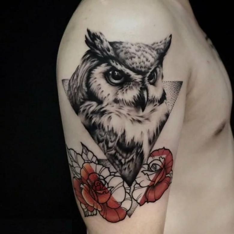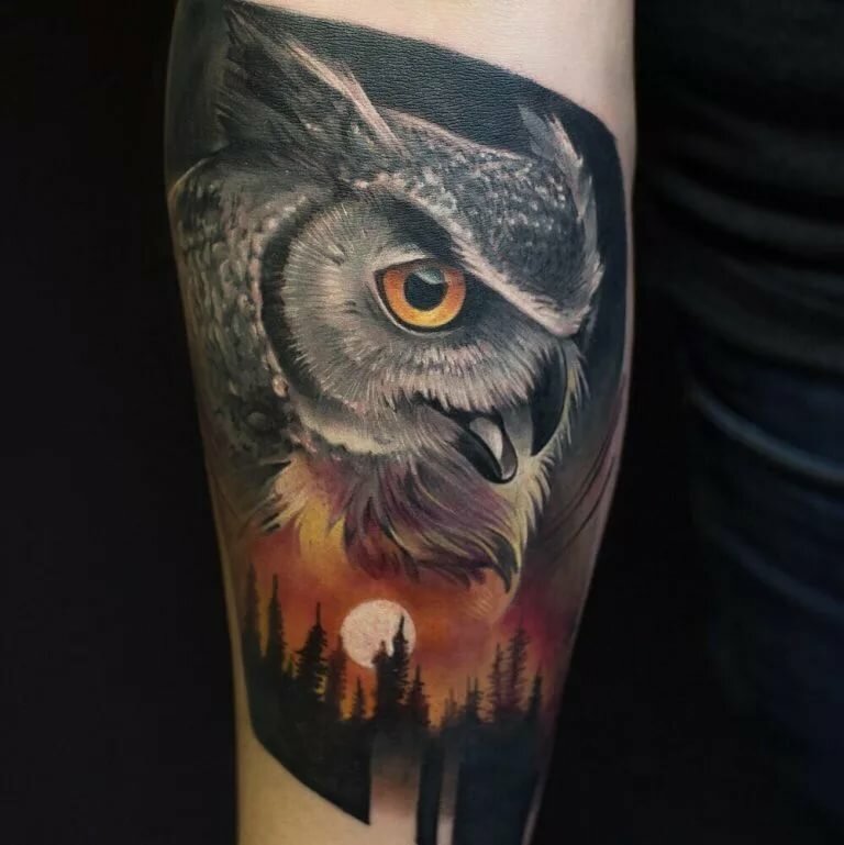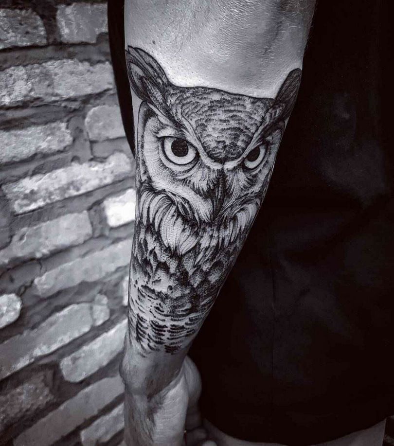 Le réalisme est souligné par la profondeur et la saturation des couleurs, les ombres et la pénombre, qui donnent au tatouage un aspect tridimensionnel et donnent l'impression qu'une chouette regarde droit dans l'âme.