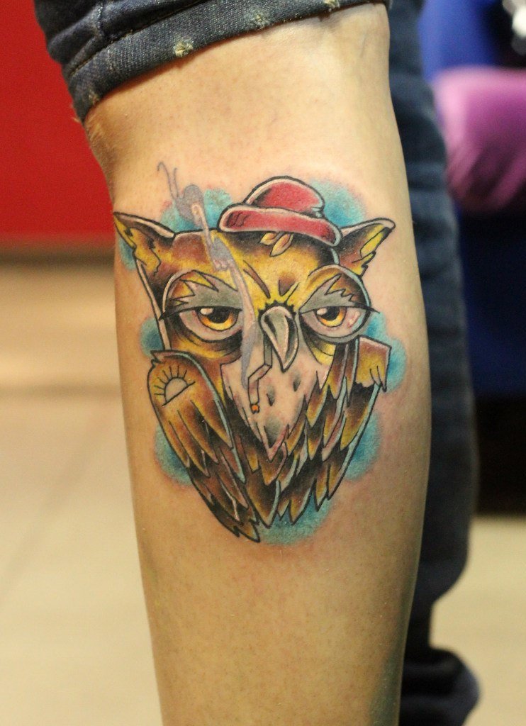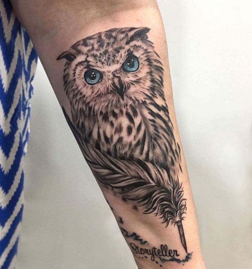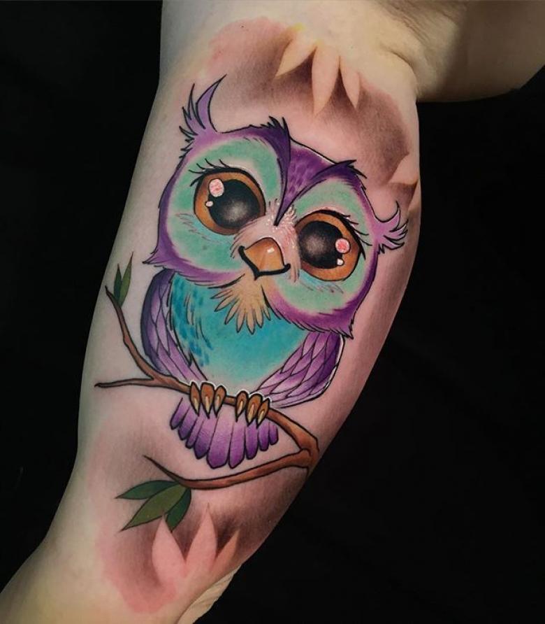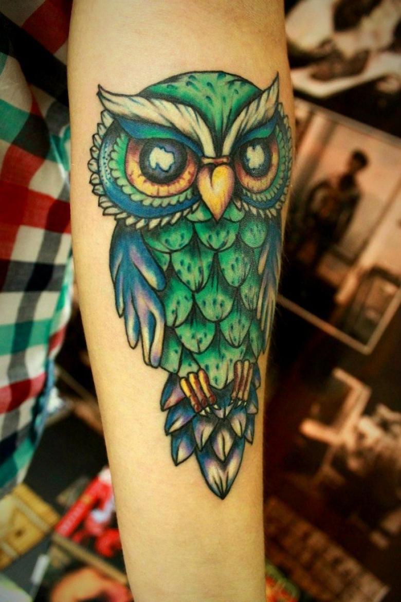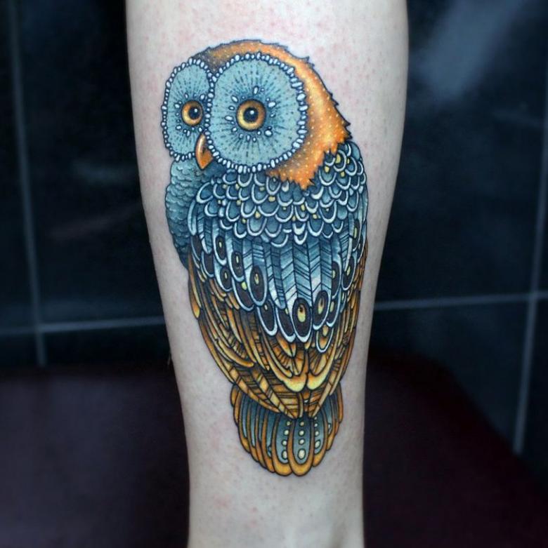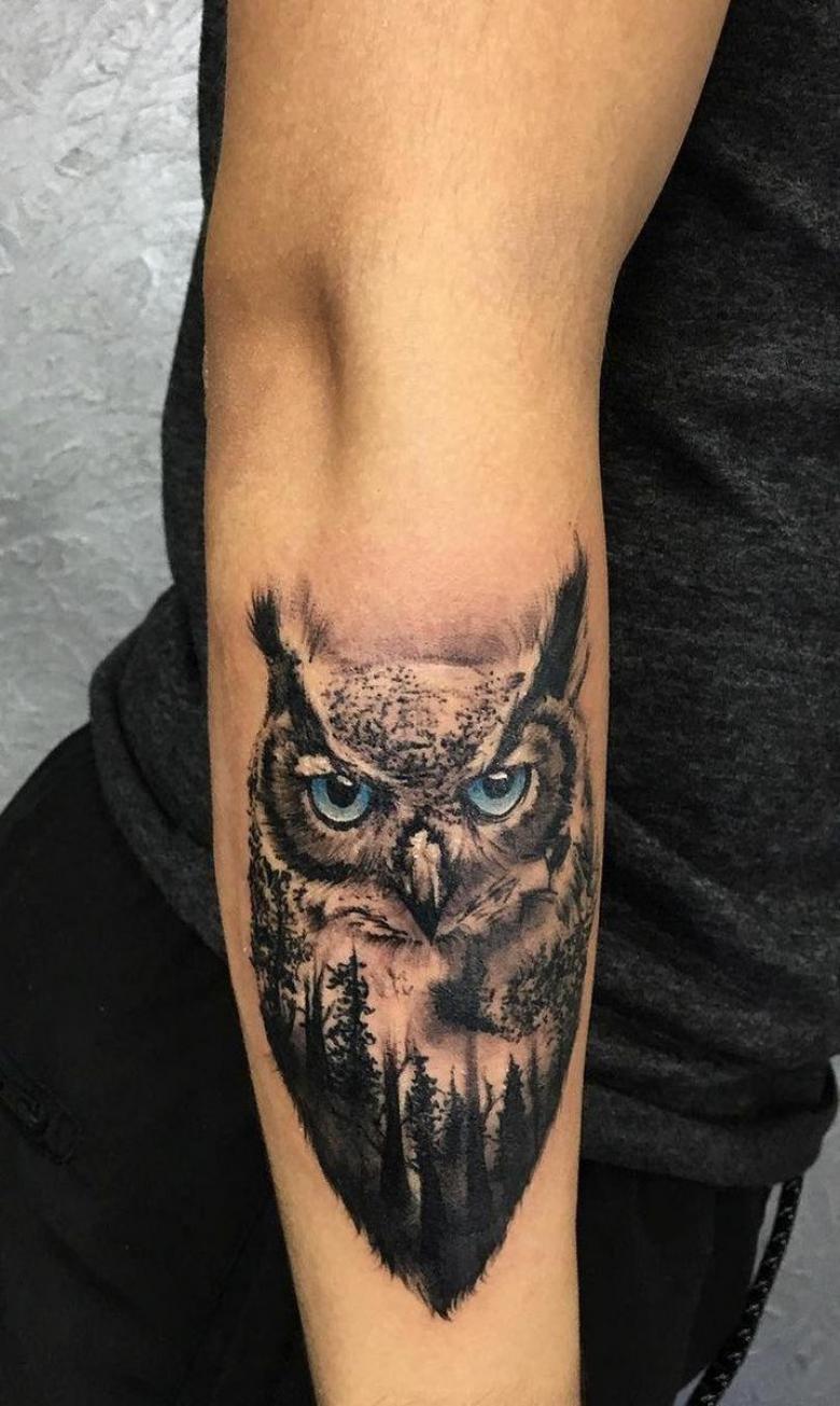 Le réalisme est souligné par la profondeur et la saturation des couleurs, les ombres et la pénombre, qui donnent au tatouage un aspect tridimensionnel et donnent l'impression qu'une chouette regarde droit dans l'âme.