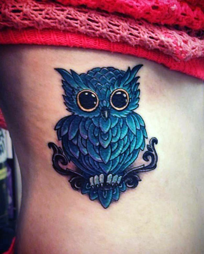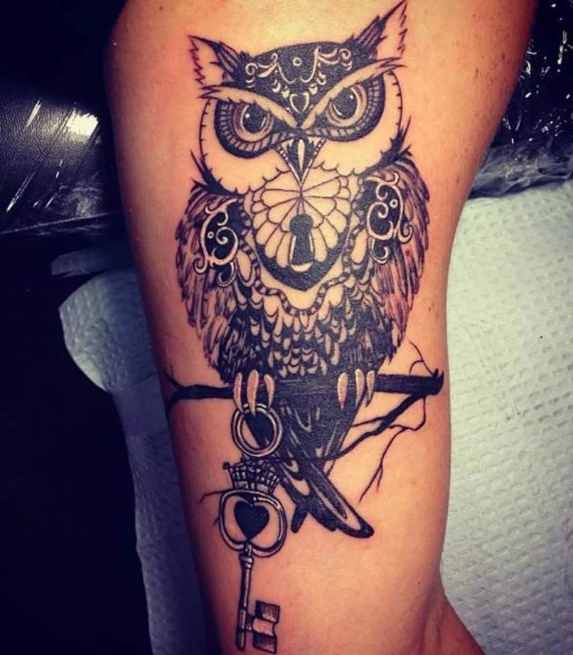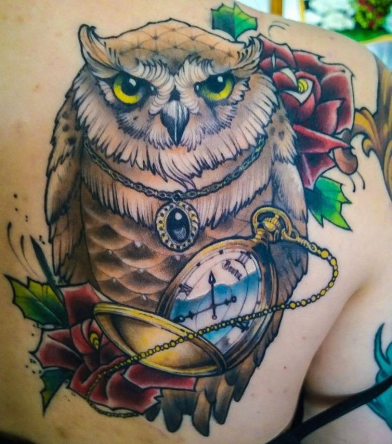 - une chouette avec une horloge suggère que le porteur du tatouage est conscient du caractère éphémère du temps qui lui est imparti et apprécie chaque minute de sa précieuse vie.
