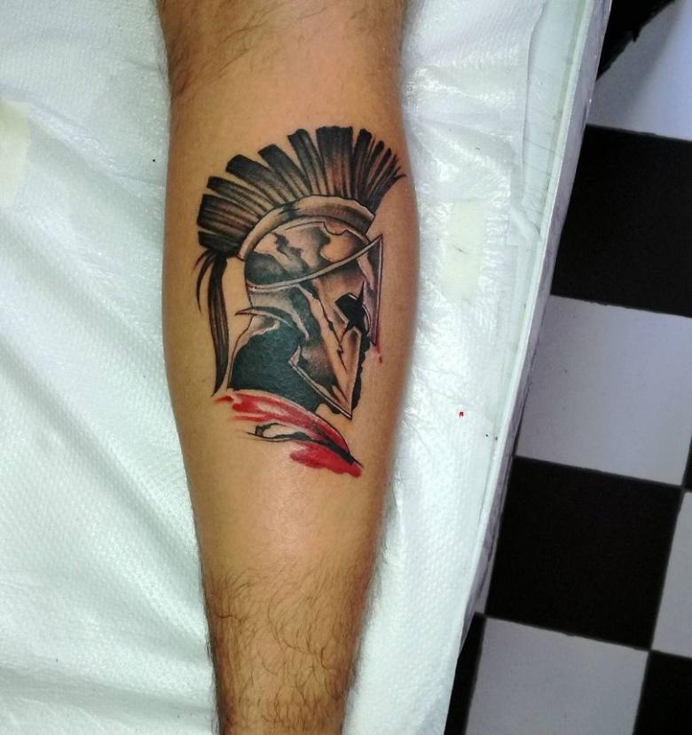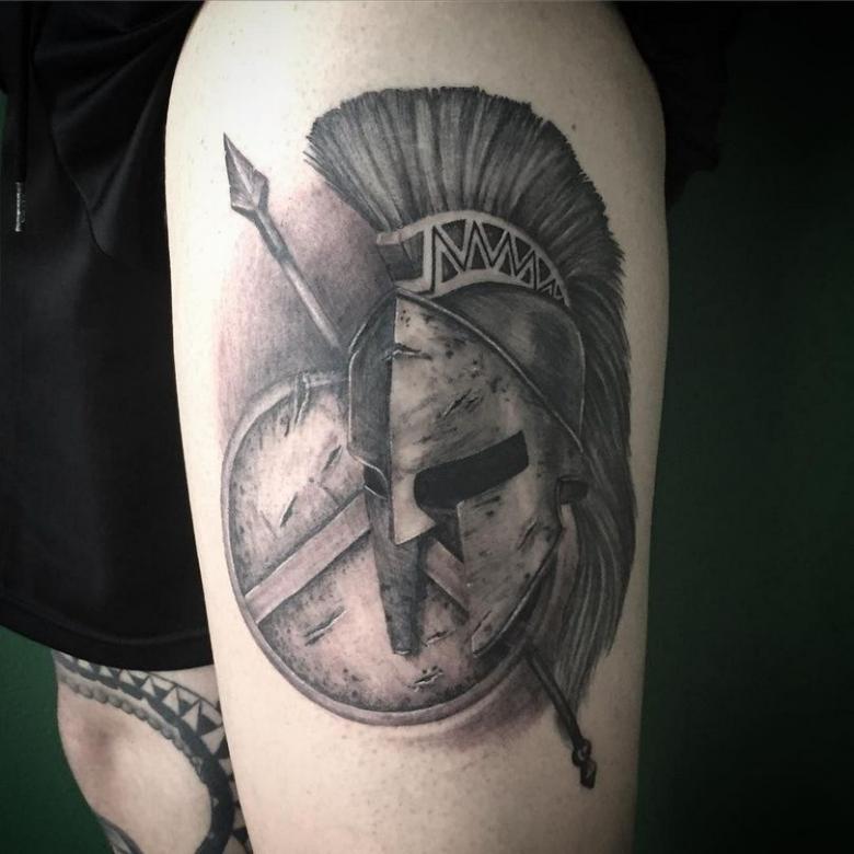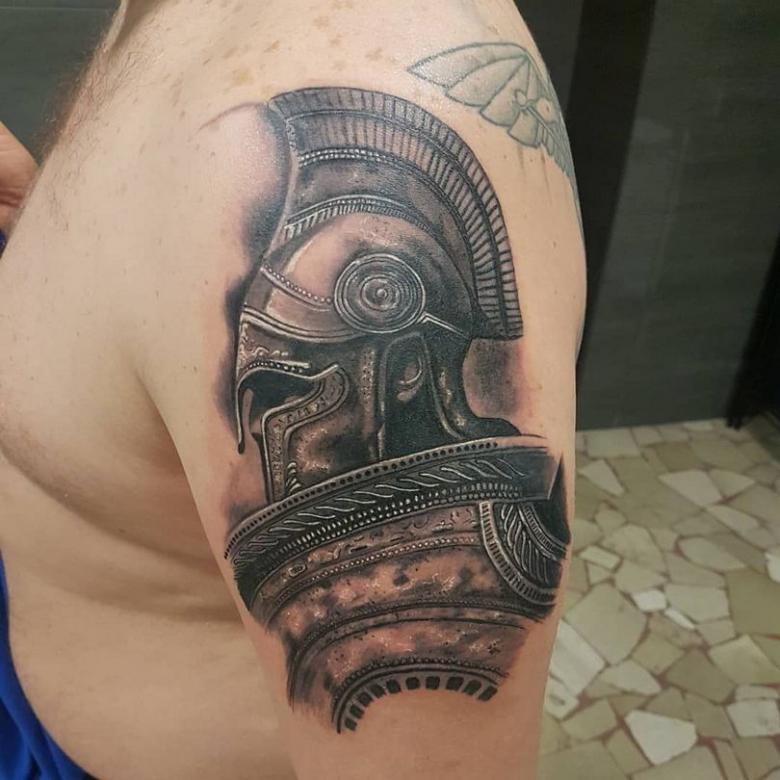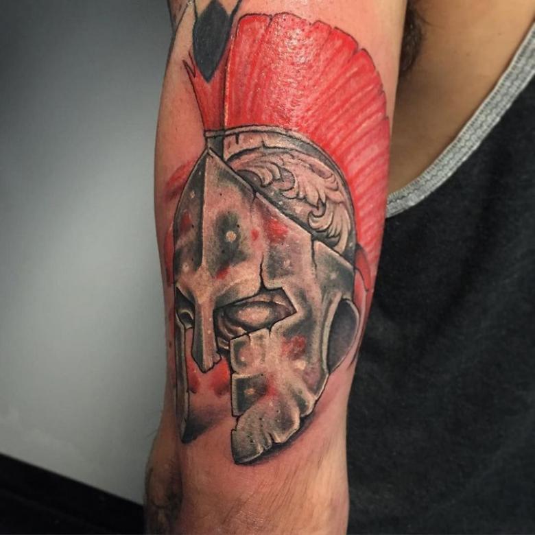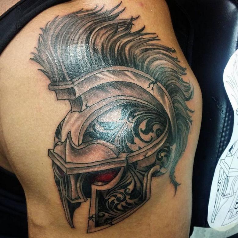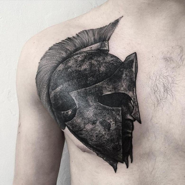 Le tatouage casque de combat spartiate symbolise la force et l'endurance, car un ensemble d'armes et de protection spartiate pesait environ 30 kg. Le tatouage de casque souligne l'équanimité d'un homme, sa capacité à être au-dessus de ses ennemis et de ses détracteurs.