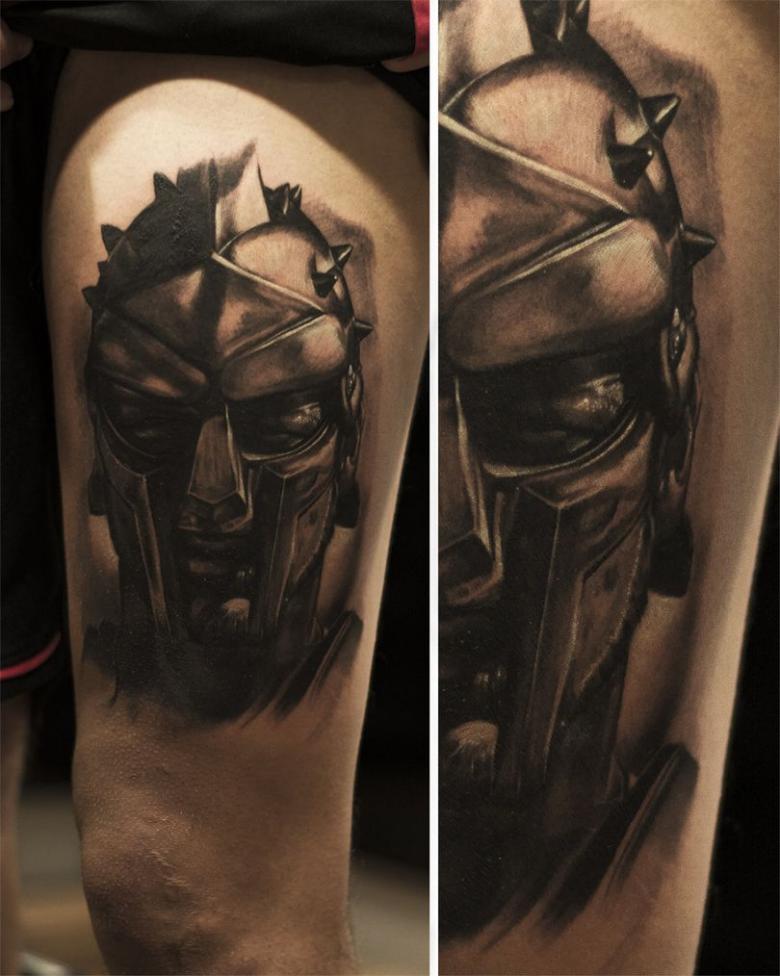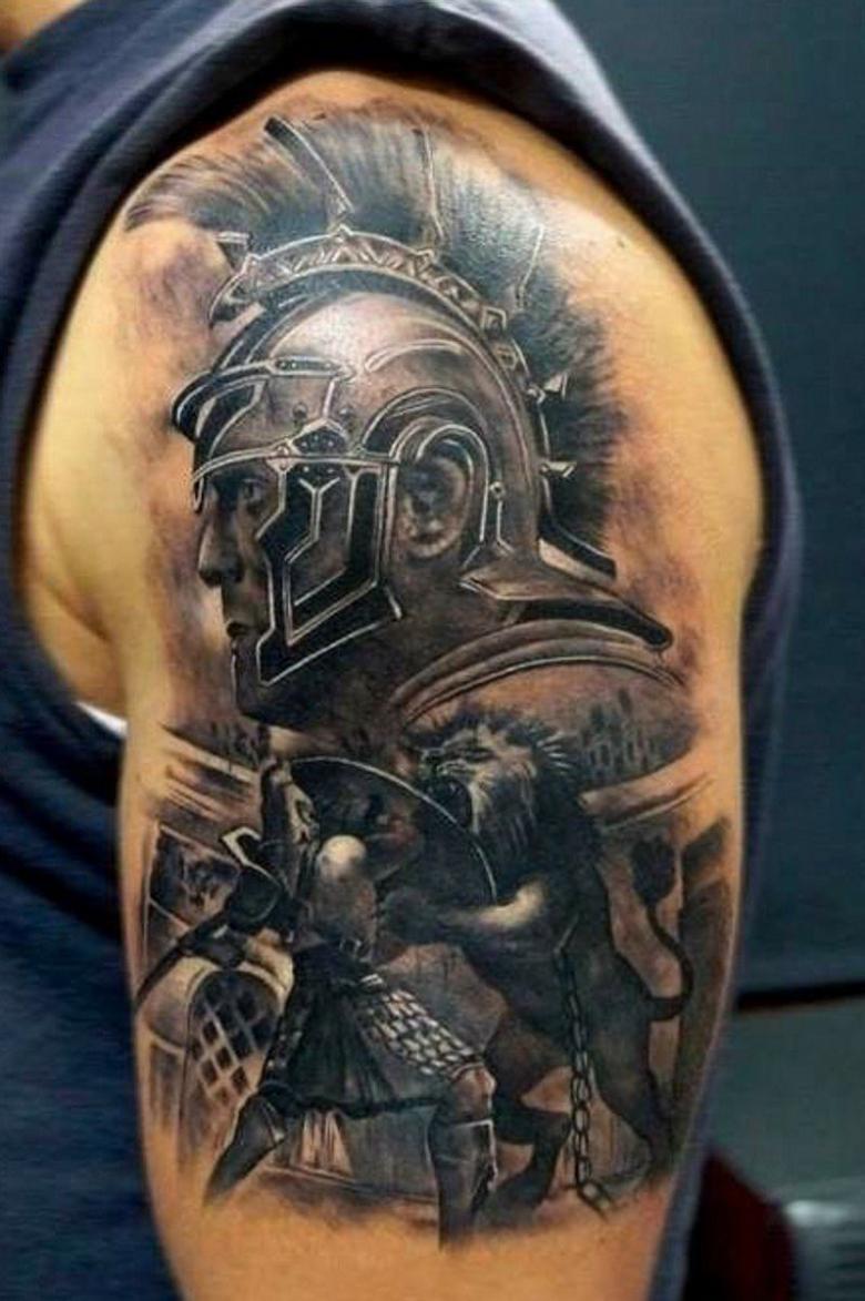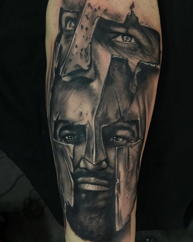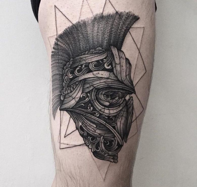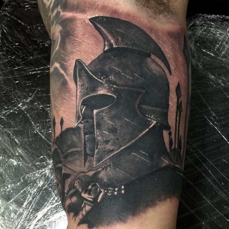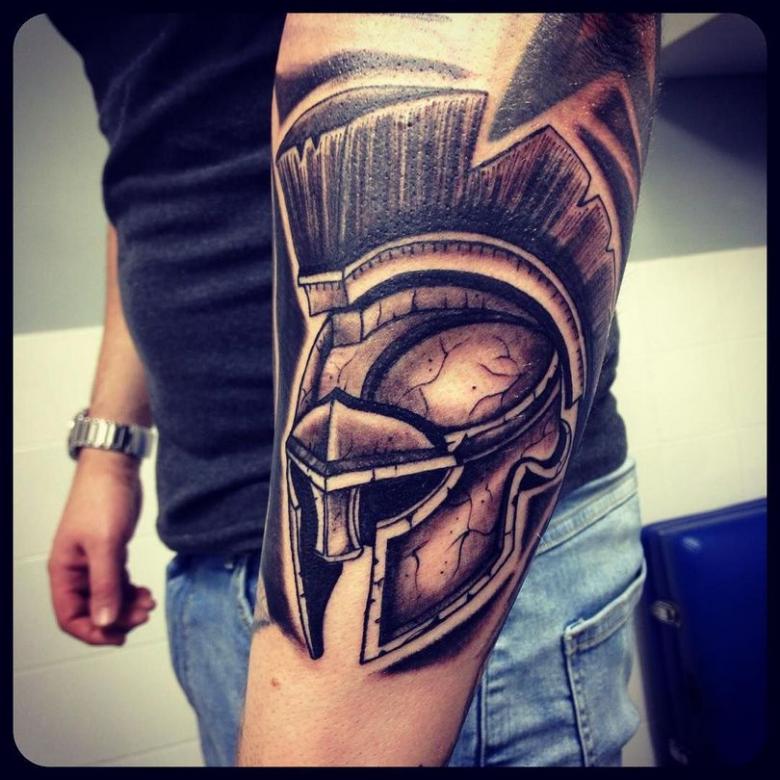 Le tatouage casque de combat spartiate symbolise la force et l'endurance, car un ensemble d'armes et de protection spartiate pesait environ 30 kg. Le tatouage de casque souligne l'équanimité d'un homme, sa capacité à être au-dessus de ses ennemis et de ses détracteurs.