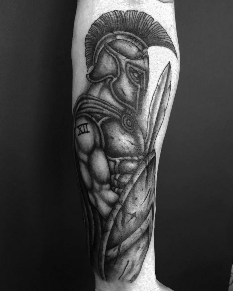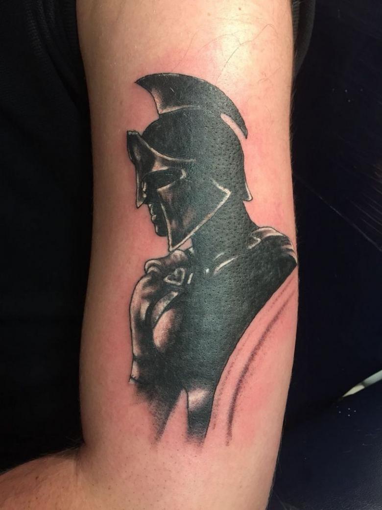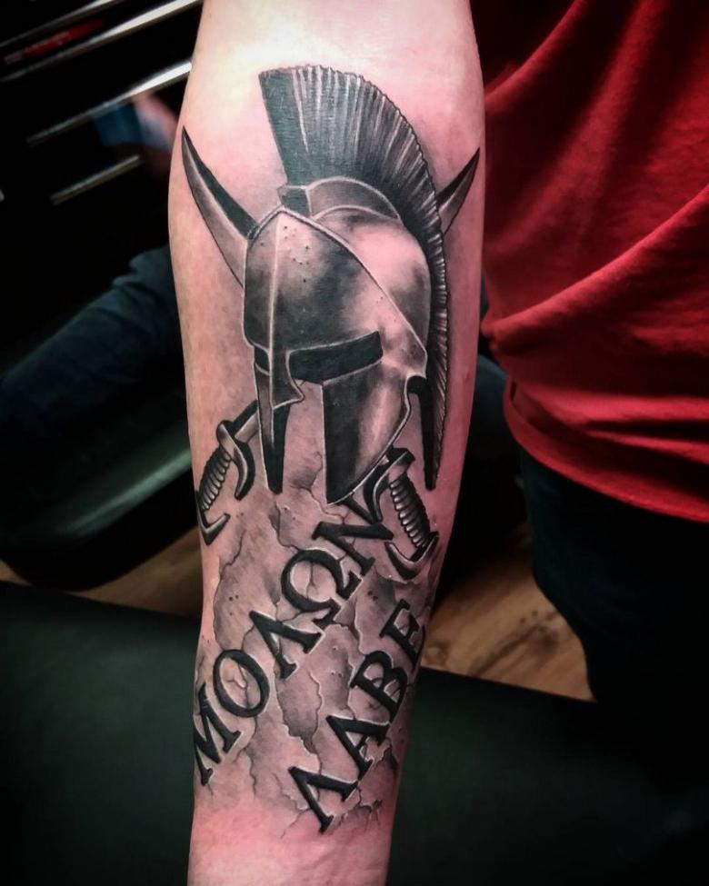 Tatouage Spartiate - signification, motifs pour hommes (y compris les ailes et le casque d'un Spartiate, 300 Spartiates), où appliquer (sur le bras, l'épaule, la jambe, le mollet, la poitrine), photos