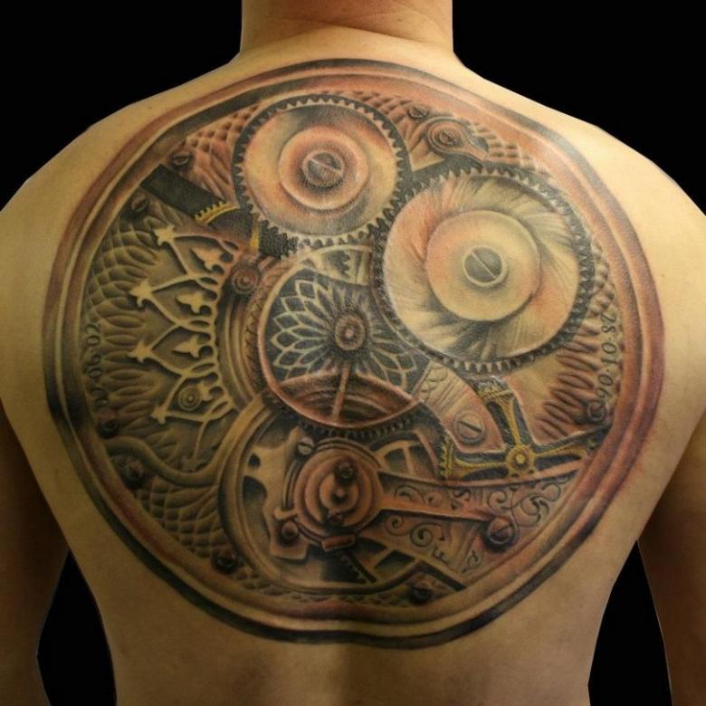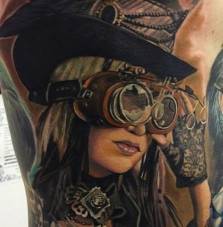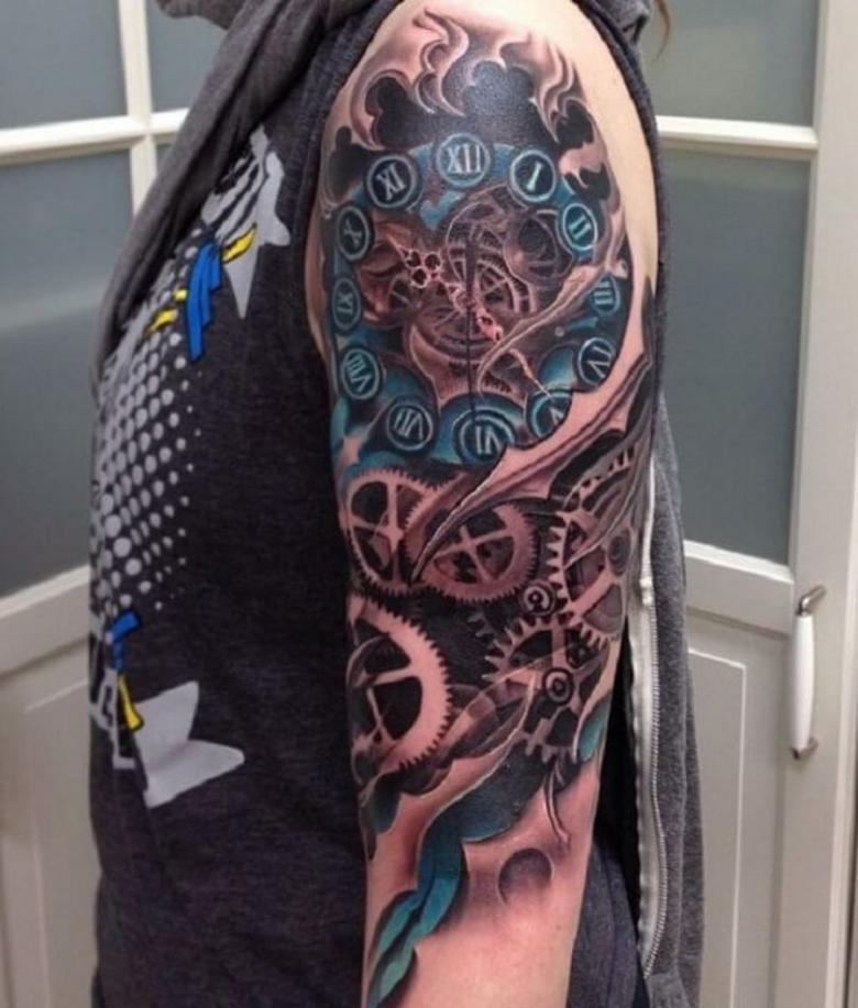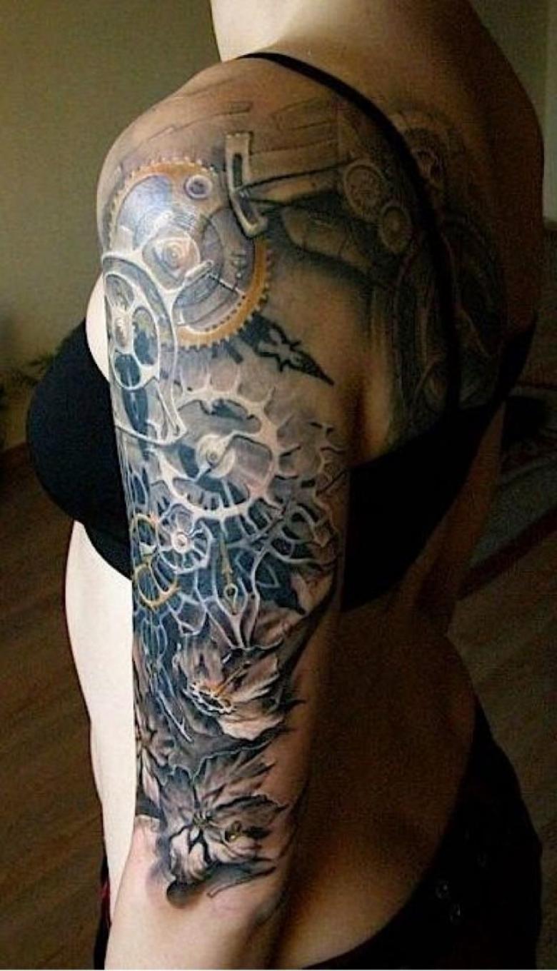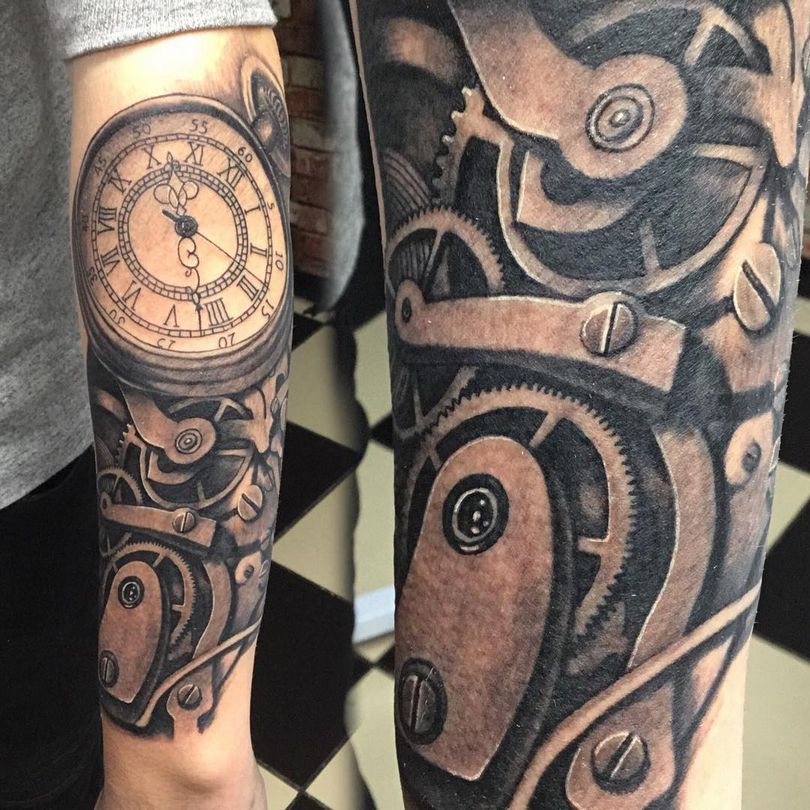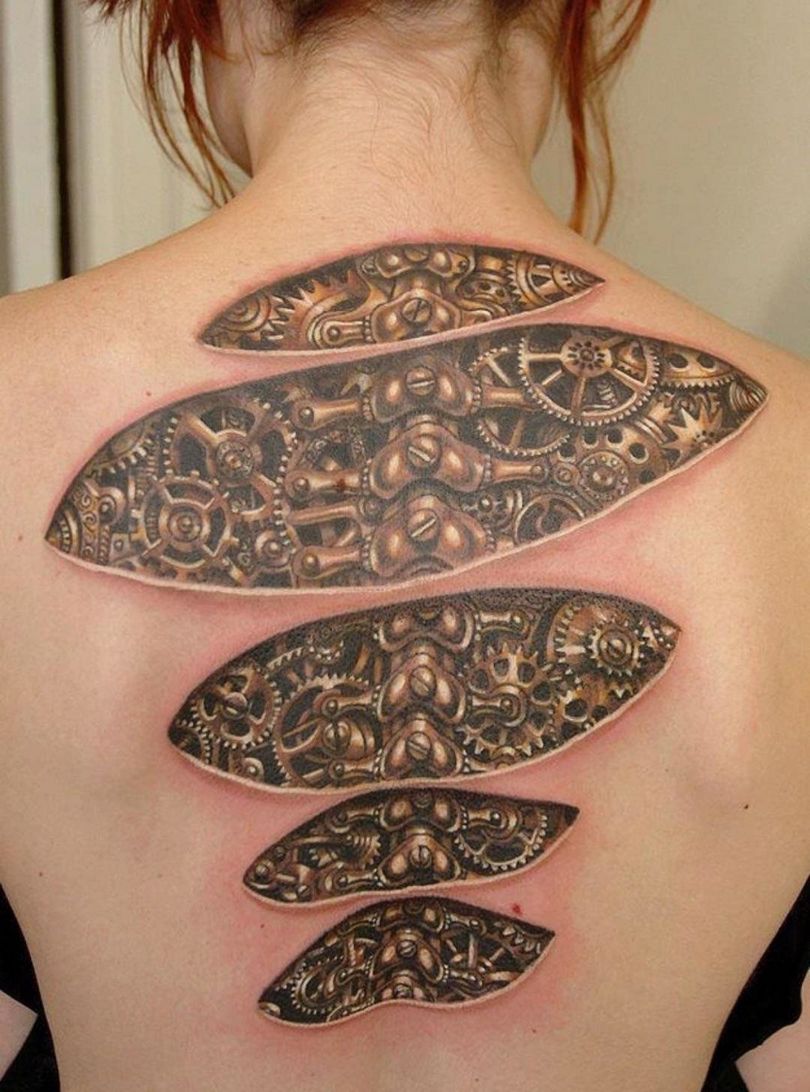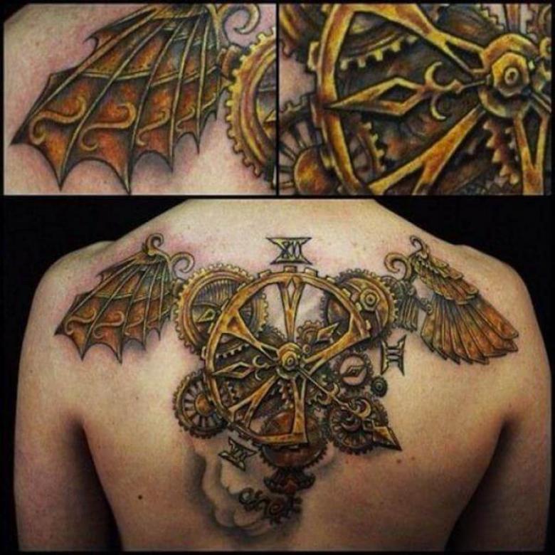 Les tatouages steampunk qui couvrent l'ensemble du bras ou du dos sont généralement conçus avec des motifs biomécaniques : comme s'il y avait des pièces mécaniques, des cadrans, des tuyaux, des engrenages sous la peau. Il y a souvent une imitation de l'absence de peau, ou des incisions et des déchirures délibérément grossières.