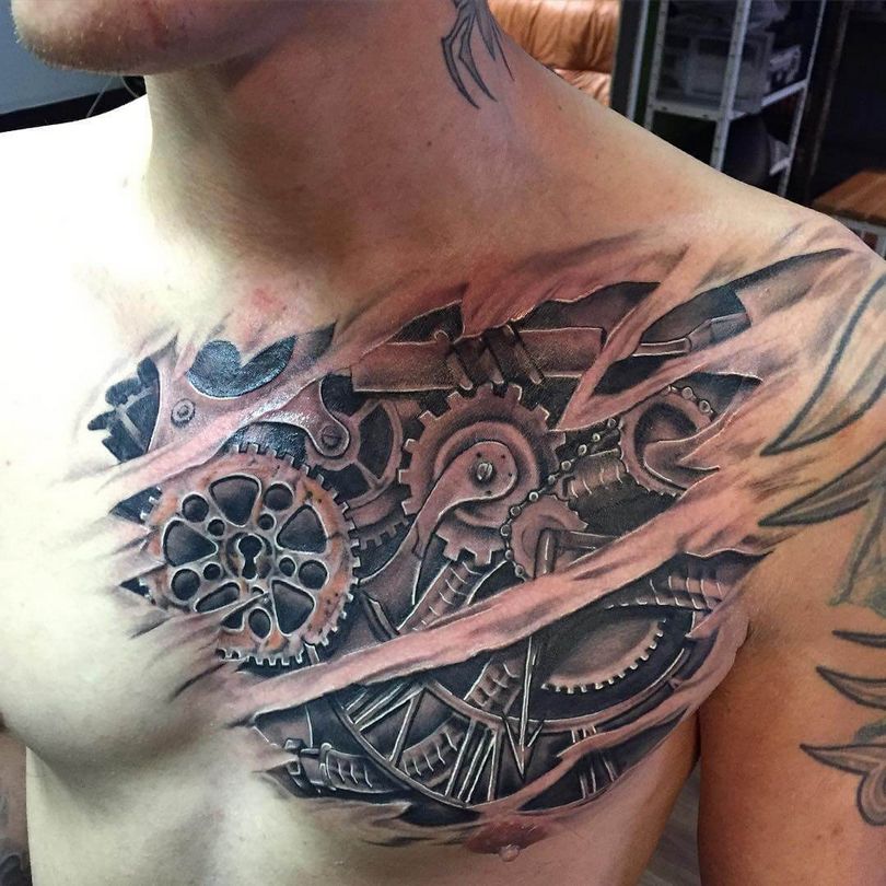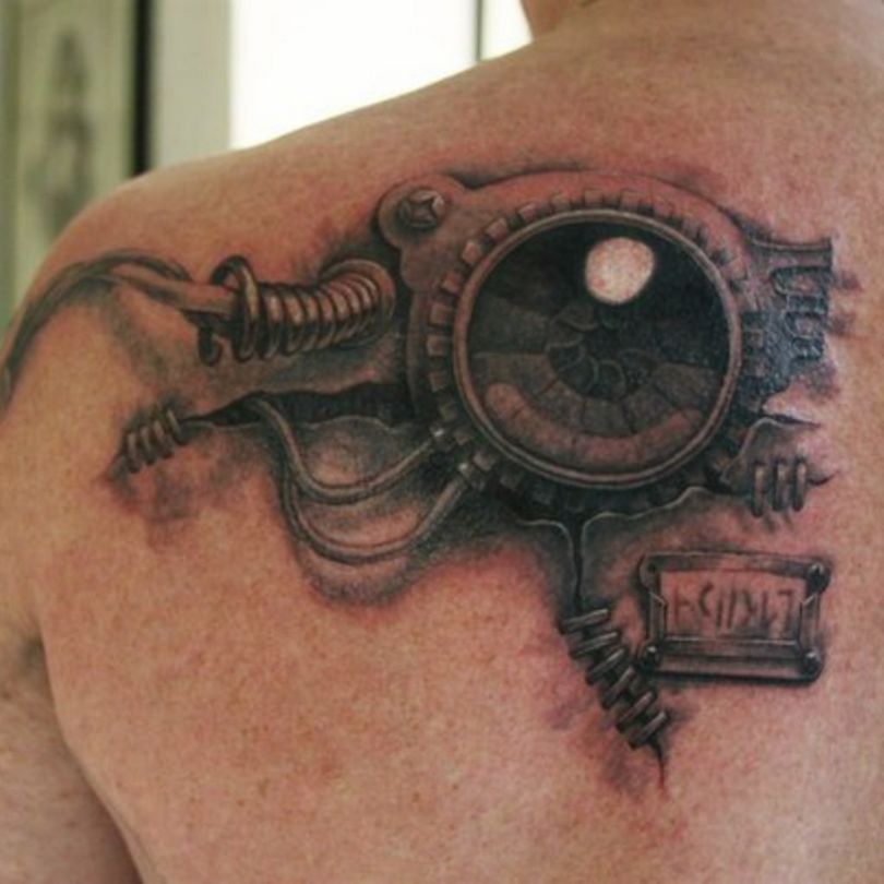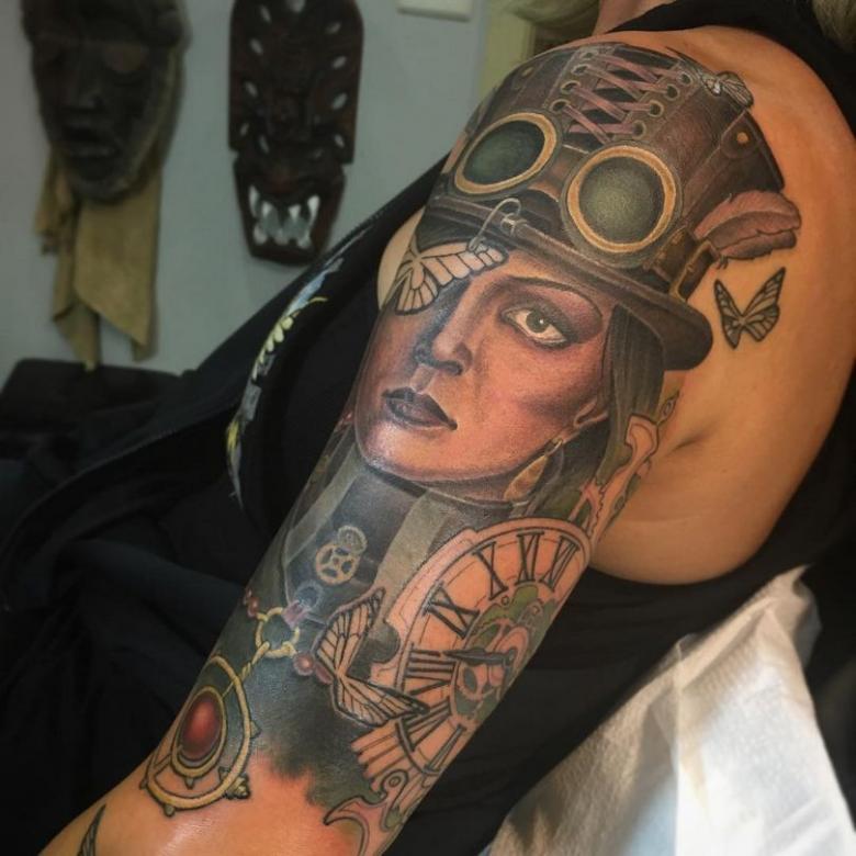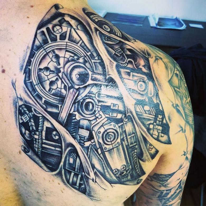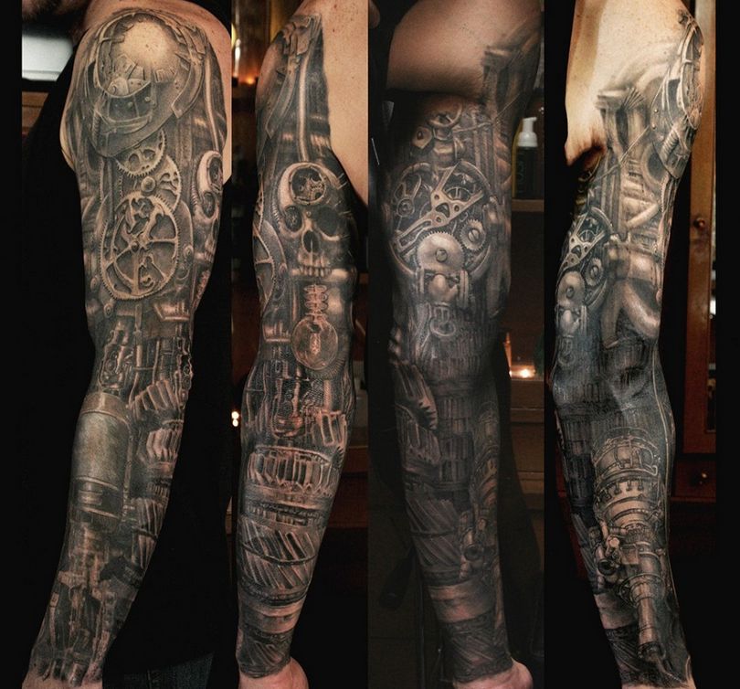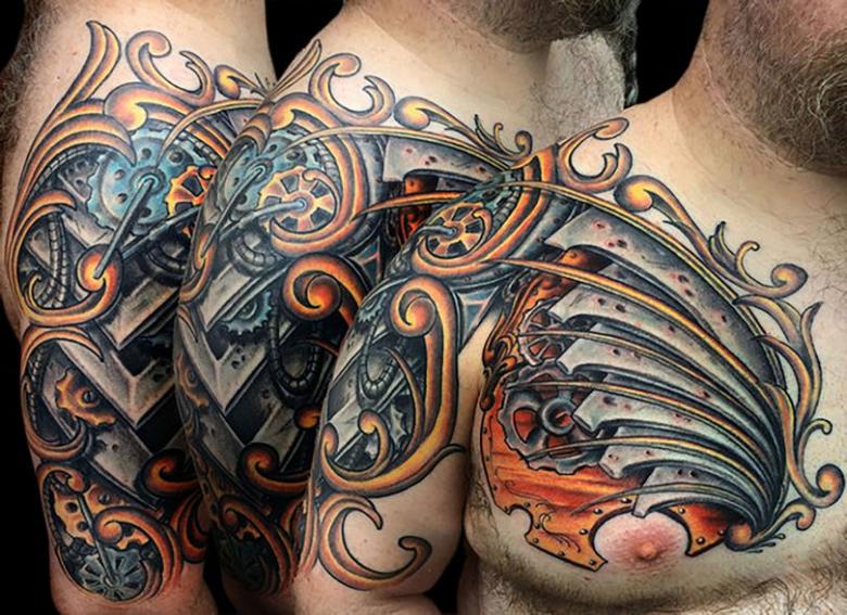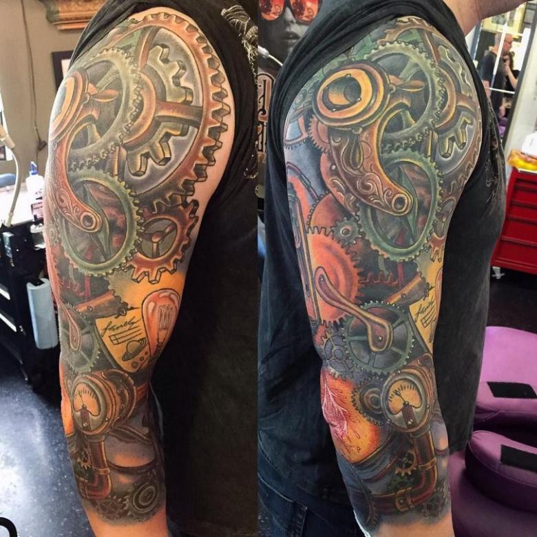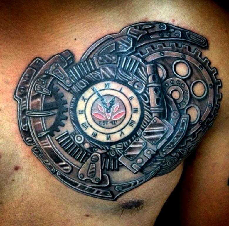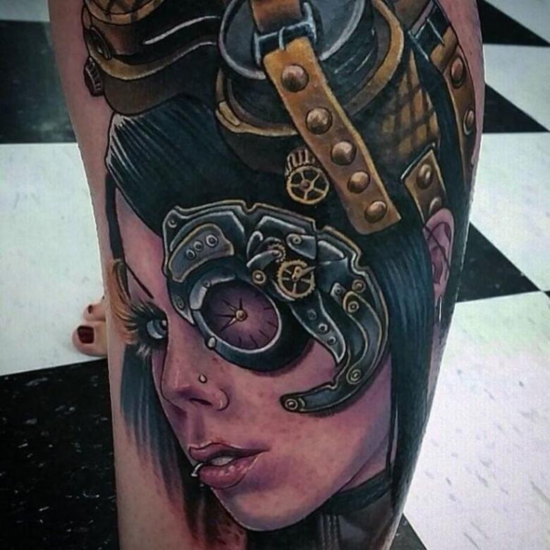 Les tatouages steampunk qui couvrent l'ensemble du bras ou du dos sont généralement conçus avec des motifs biomécaniques : comme s'il y avait des pièces mécaniques, des cadrans, des tuyaux, des engrenages sous la peau. Il y a souvent une imitation de l'absence de peau, ou des incisions et des déchirures délibérément grossières.