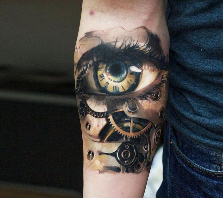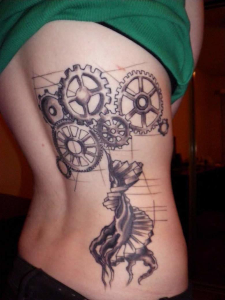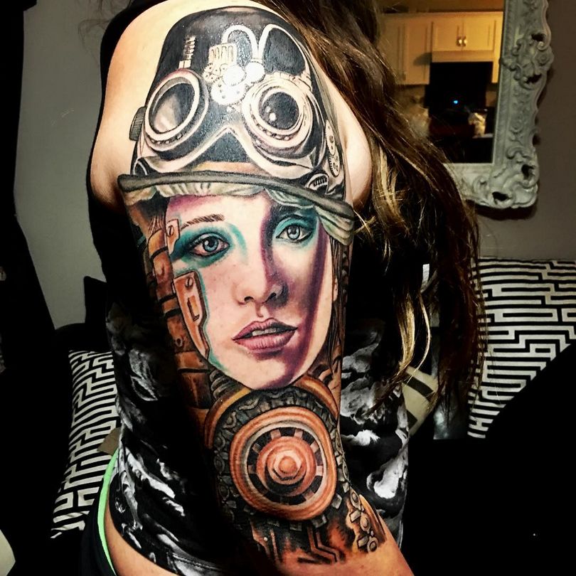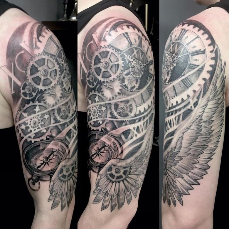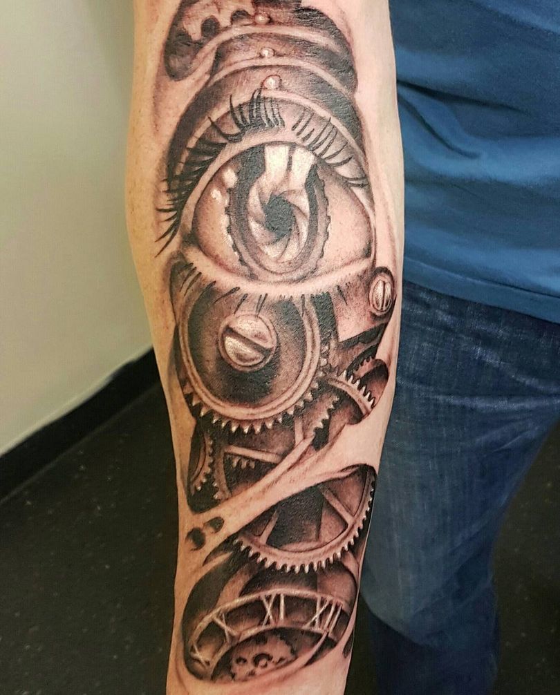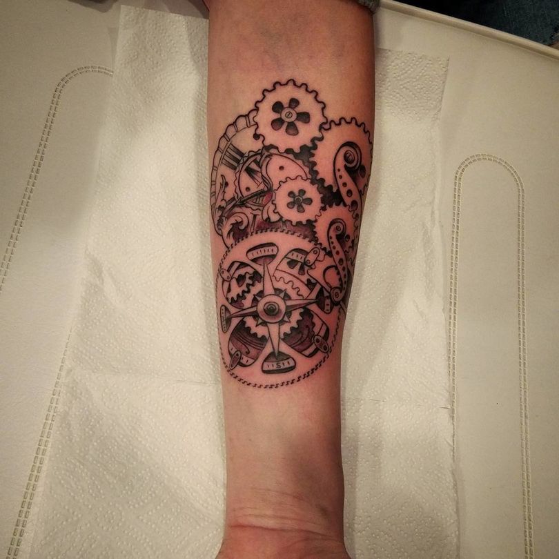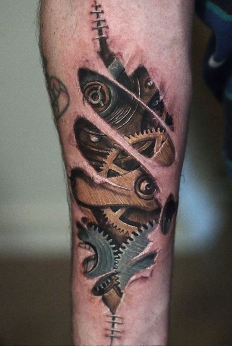 Les tatouages steampunk qui couvrent l'ensemble du bras ou du dos sont généralement conçus avec des motifs biomécaniques : comme s'il y avait des pièces mécaniques, des cadrans, des tuyaux, des engrenages sous la peau. Il y a souvent une imitation de l'absence de peau, ou des incisions et des déchirures délibérément grossières.