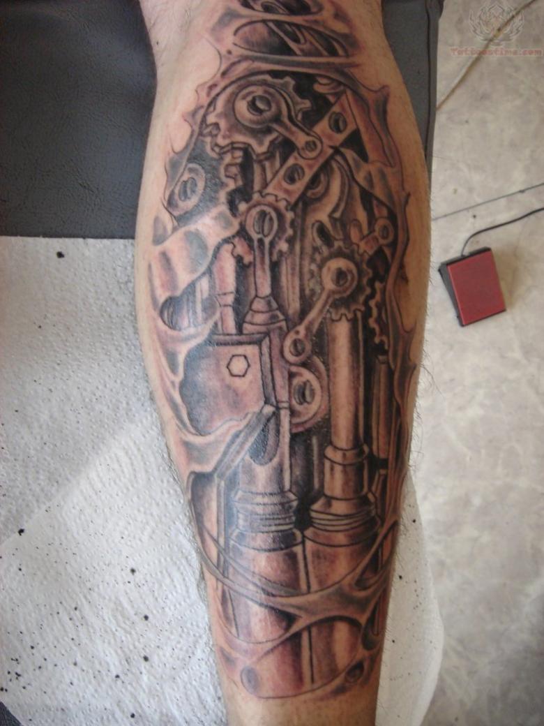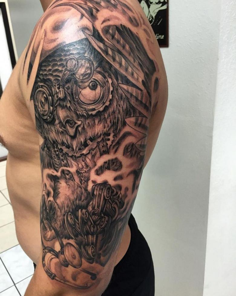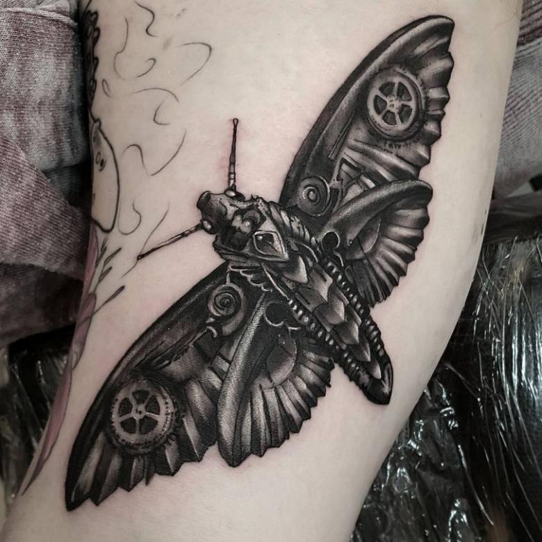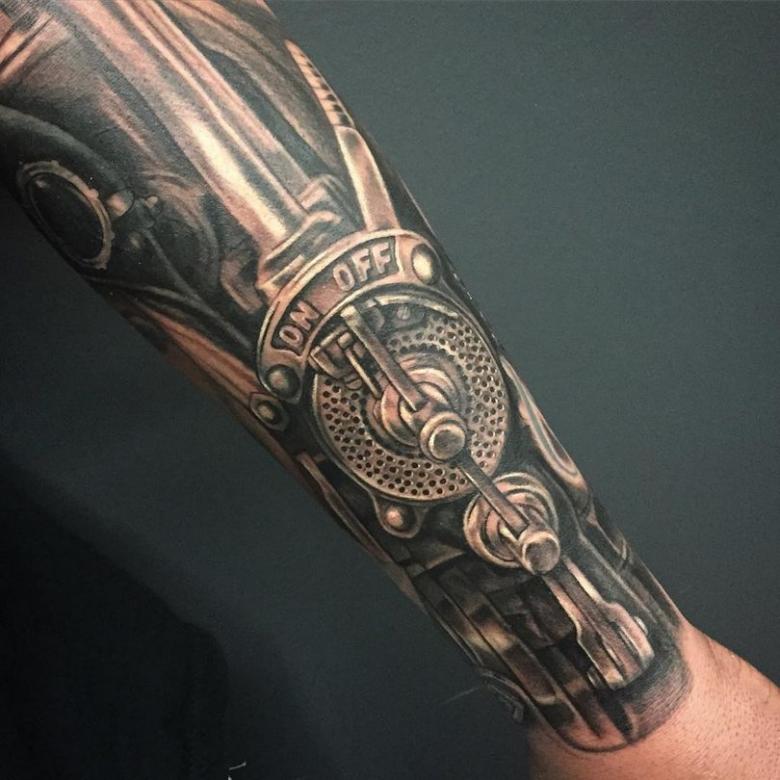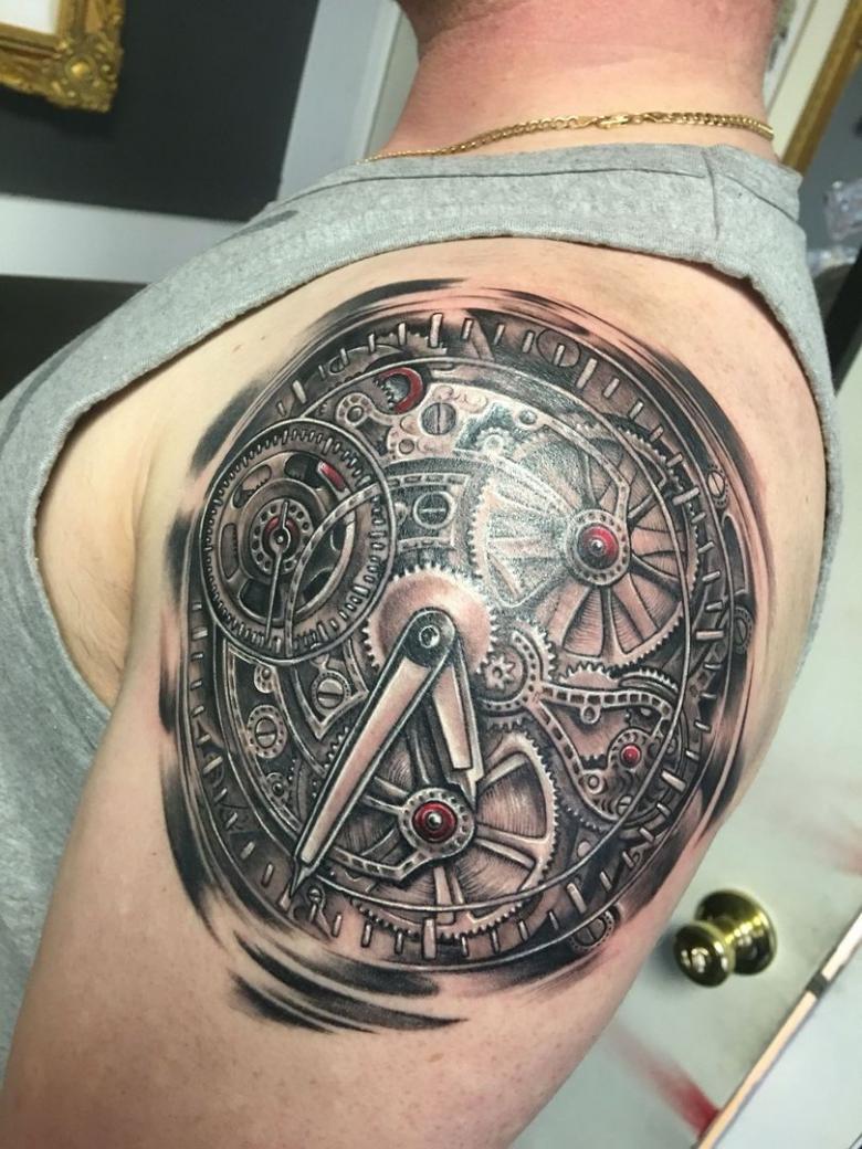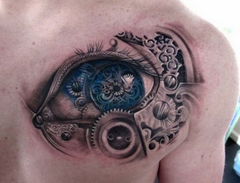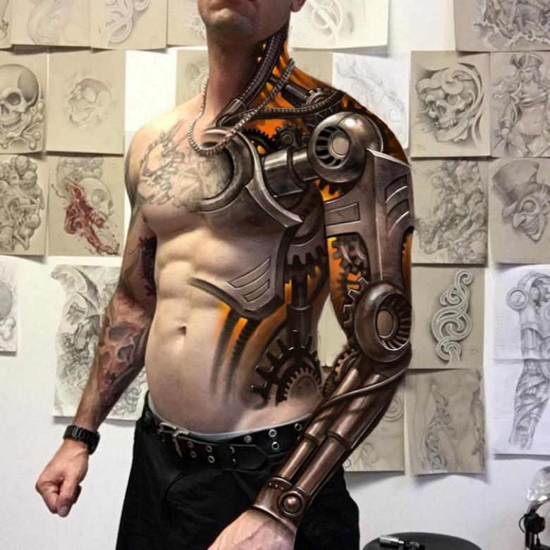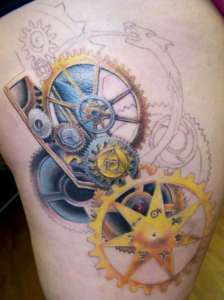 Les tatouages steampunk qui couvrent l'ensemble du bras ou du dos sont généralement conçus avec des motifs biomécaniques : comme s'il y avait des pièces mécaniques, des cadrans, des tuyaux, des engrenages sous la peau. Il y a souvent une imitation de l'absence de peau, ou des incisions et des déchirures délibérément grossières.
