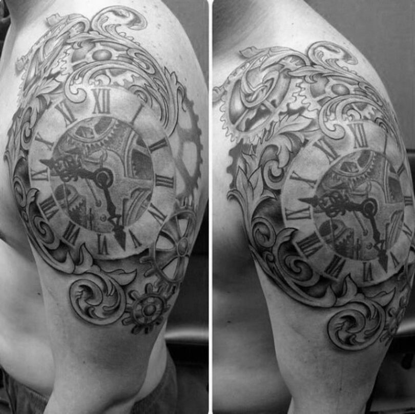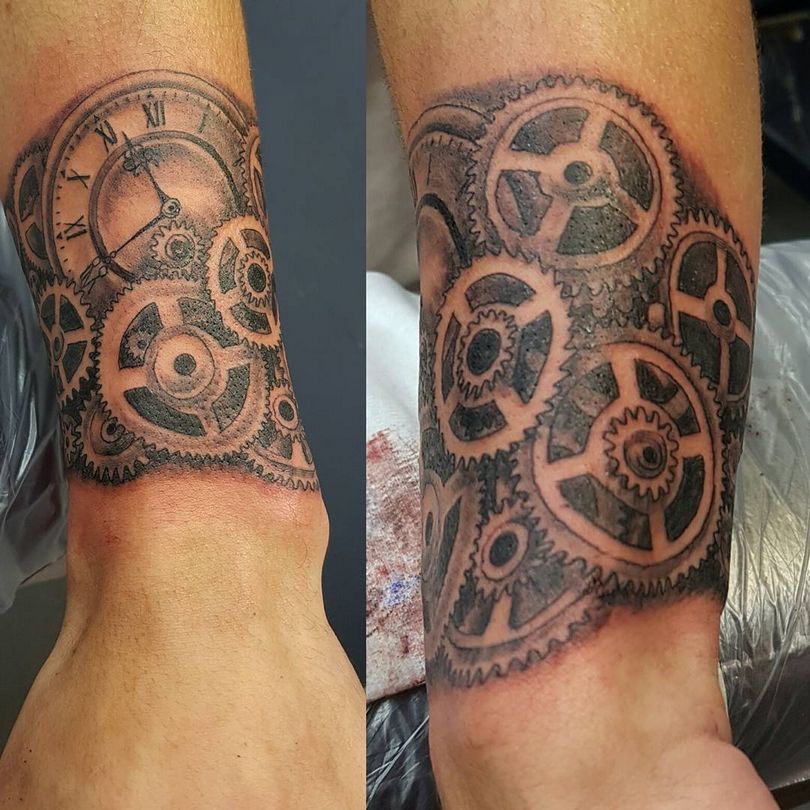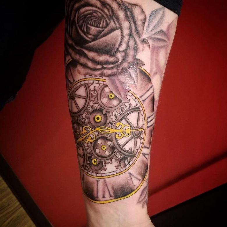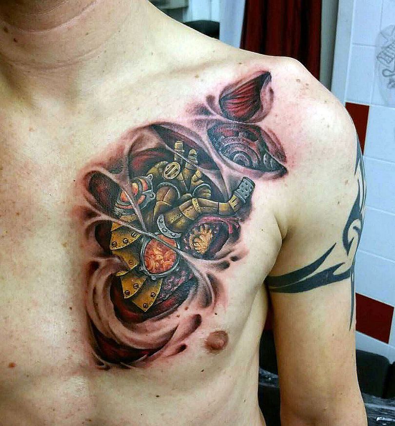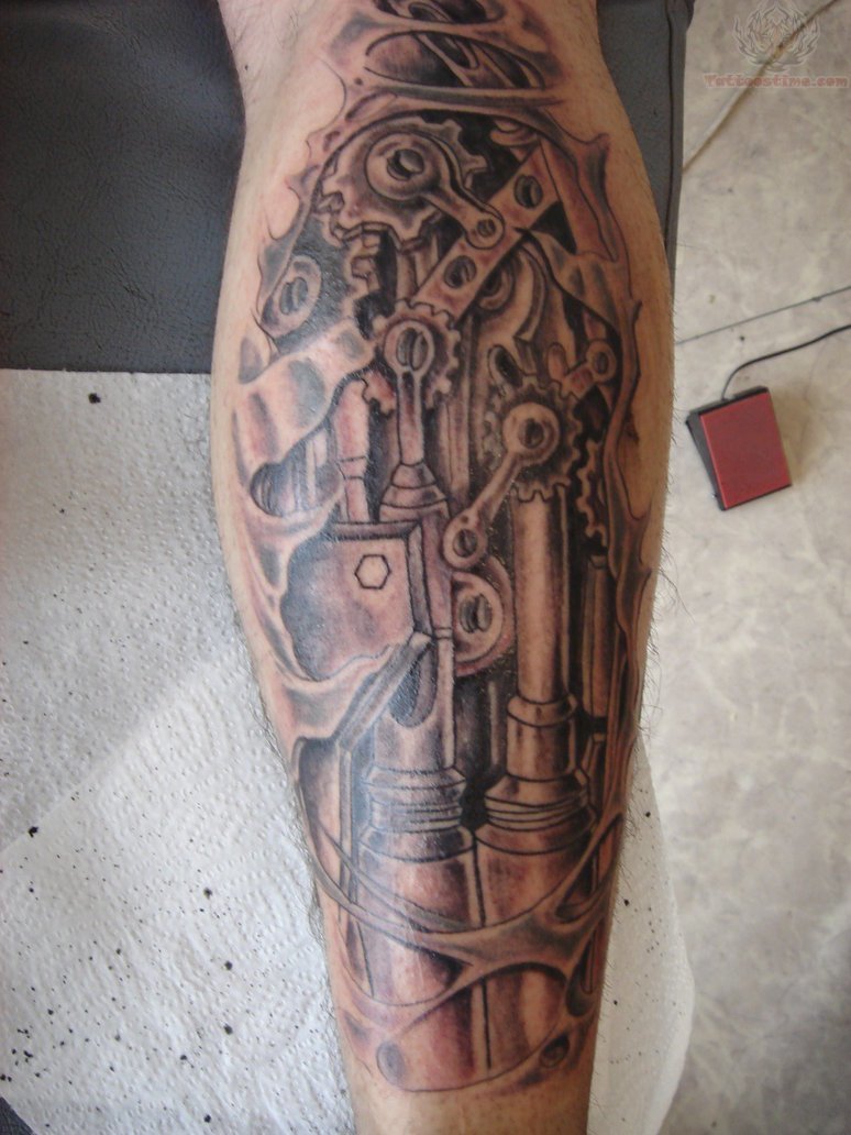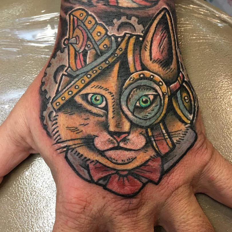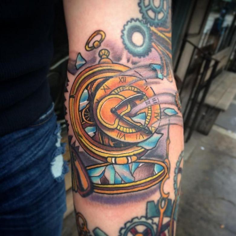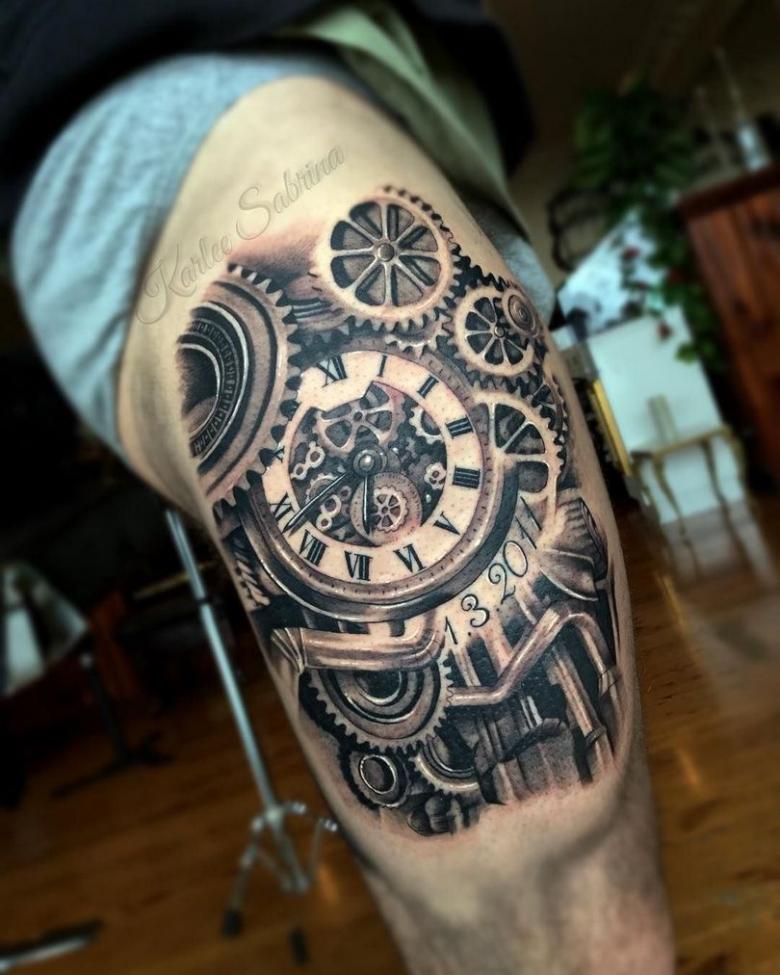 Les tatouages steampunk qui couvrent l'ensemble du bras ou du dos sont généralement conçus avec des motifs biomécaniques : comme s'il y avait des pièces mécaniques, des cadrans, des tuyaux, des engrenages sous la peau. Il y a souvent une imitation de l'absence de peau, ou des incisions et des déchirures délibérément grossières.