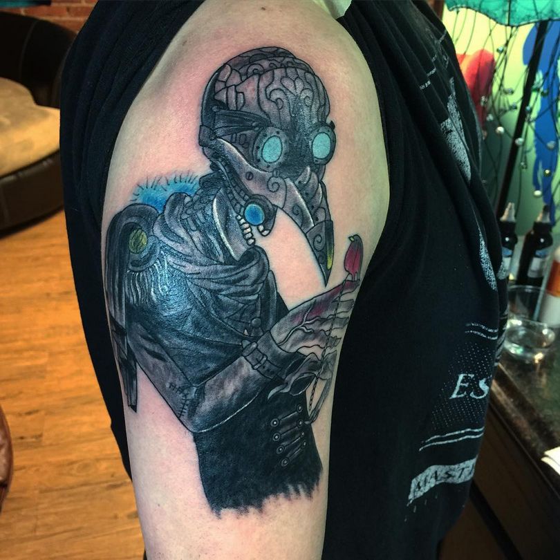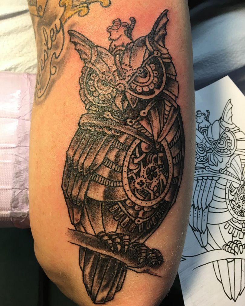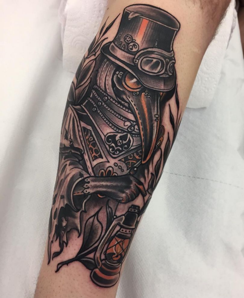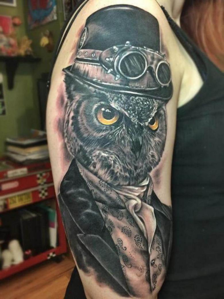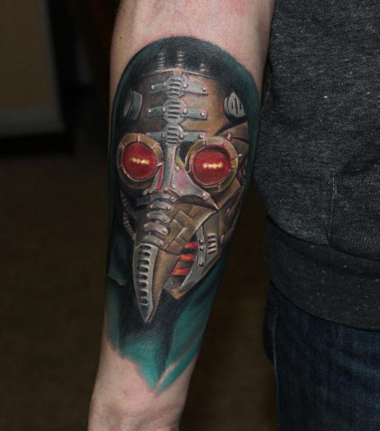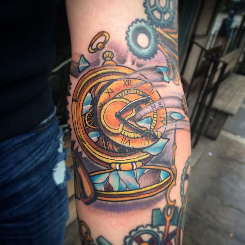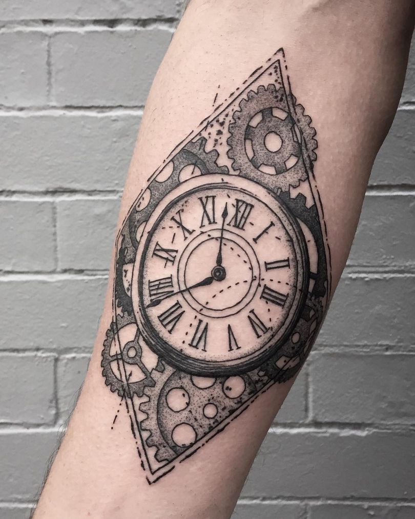 Les tatouages steampunk qui couvrent l'ensemble du bras ou du dos sont généralement conçus avec des motifs biomécaniques : comme s'il y avait des pièces mécaniques, des cadrans, des tuyaux, des engrenages sous la peau. Il y a souvent une imitation de l'absence de peau, ou des incisions et des déchirures délibérément grossières.